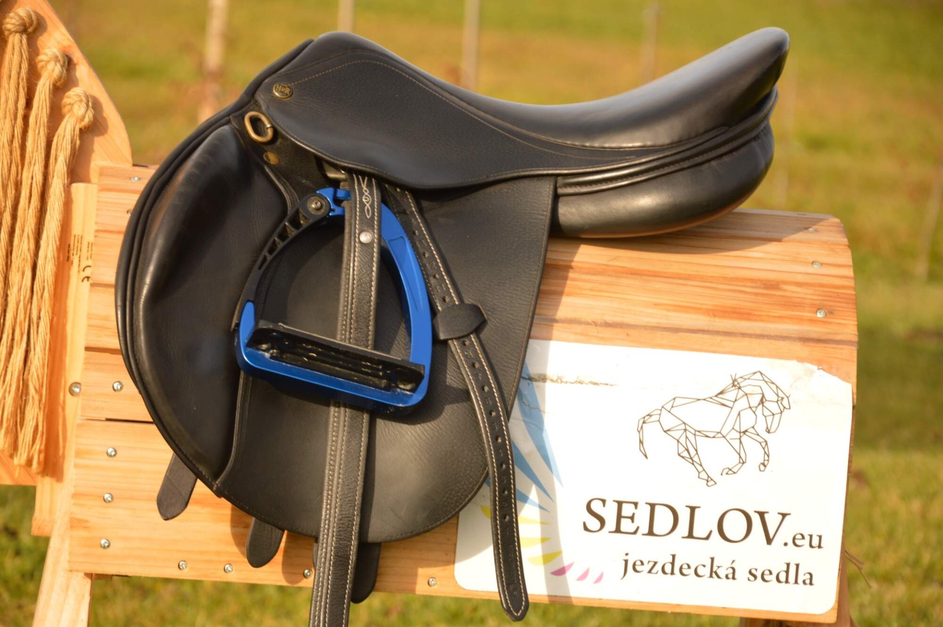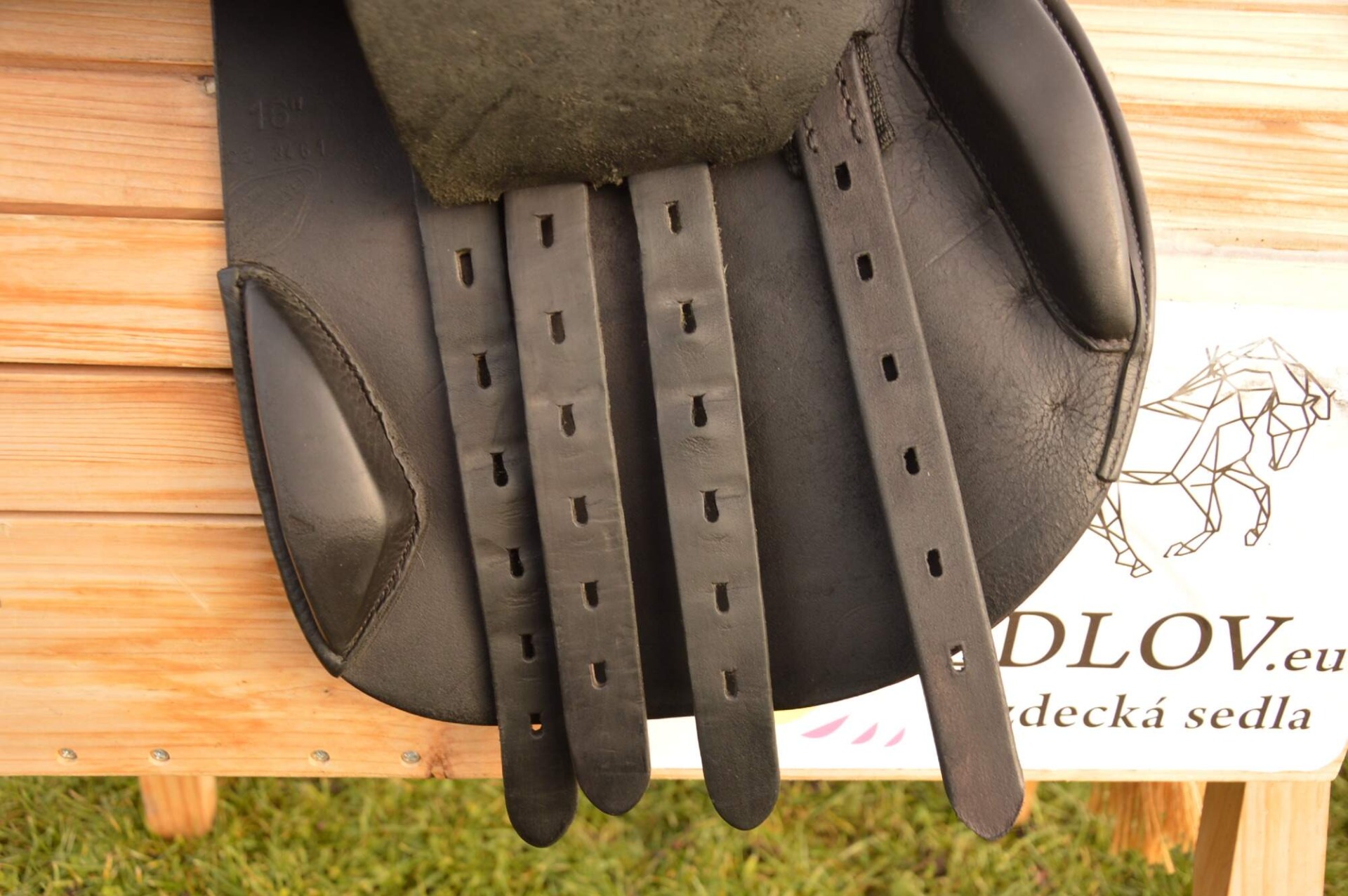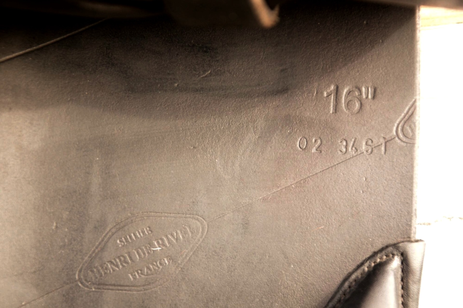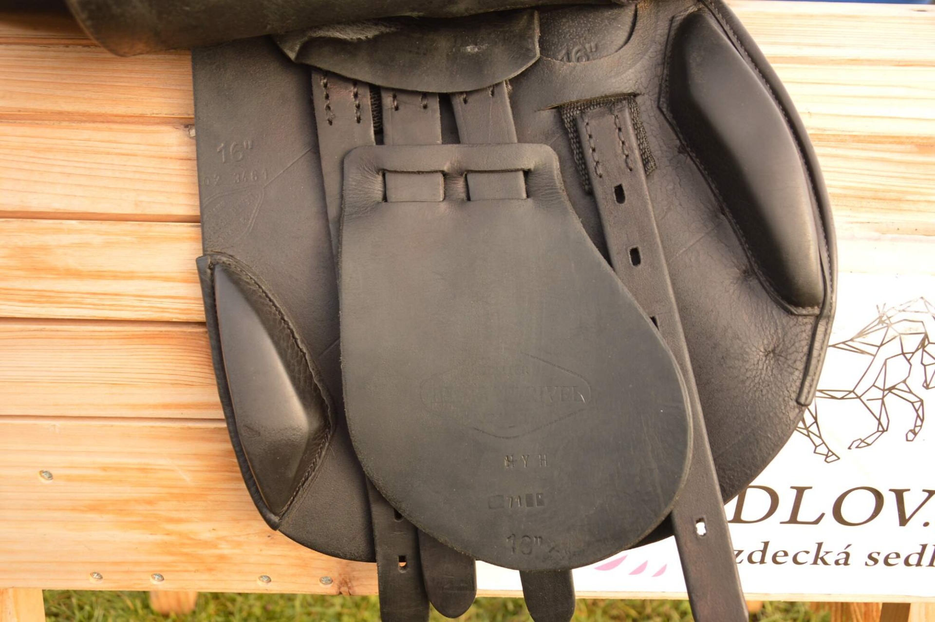 Skokové sedlo Henri de Rivel - Francie. Posedlí 16" a komora 2 (12 cm). Díky úhlu komory a nízkým polštářům je sedlo ideální na krátké a kulaté koně či poníky bez kohoutku či nízkým kohoutkem. Velmi měkké pohodlné sedlo, kvalitní kůže. Posedlí mělčí, kolenní opěrky vyšší, potažené protiskluzovou kůží. Výborně drží sed, podporuje nad skokem. Sedlo klasickými známkami použití, velmi dobrý stav.