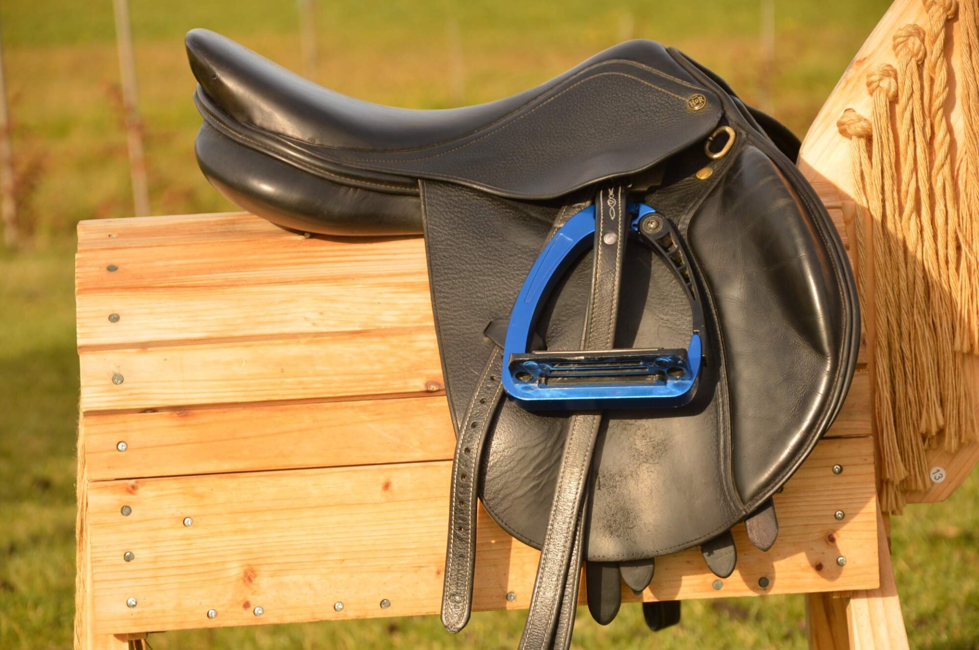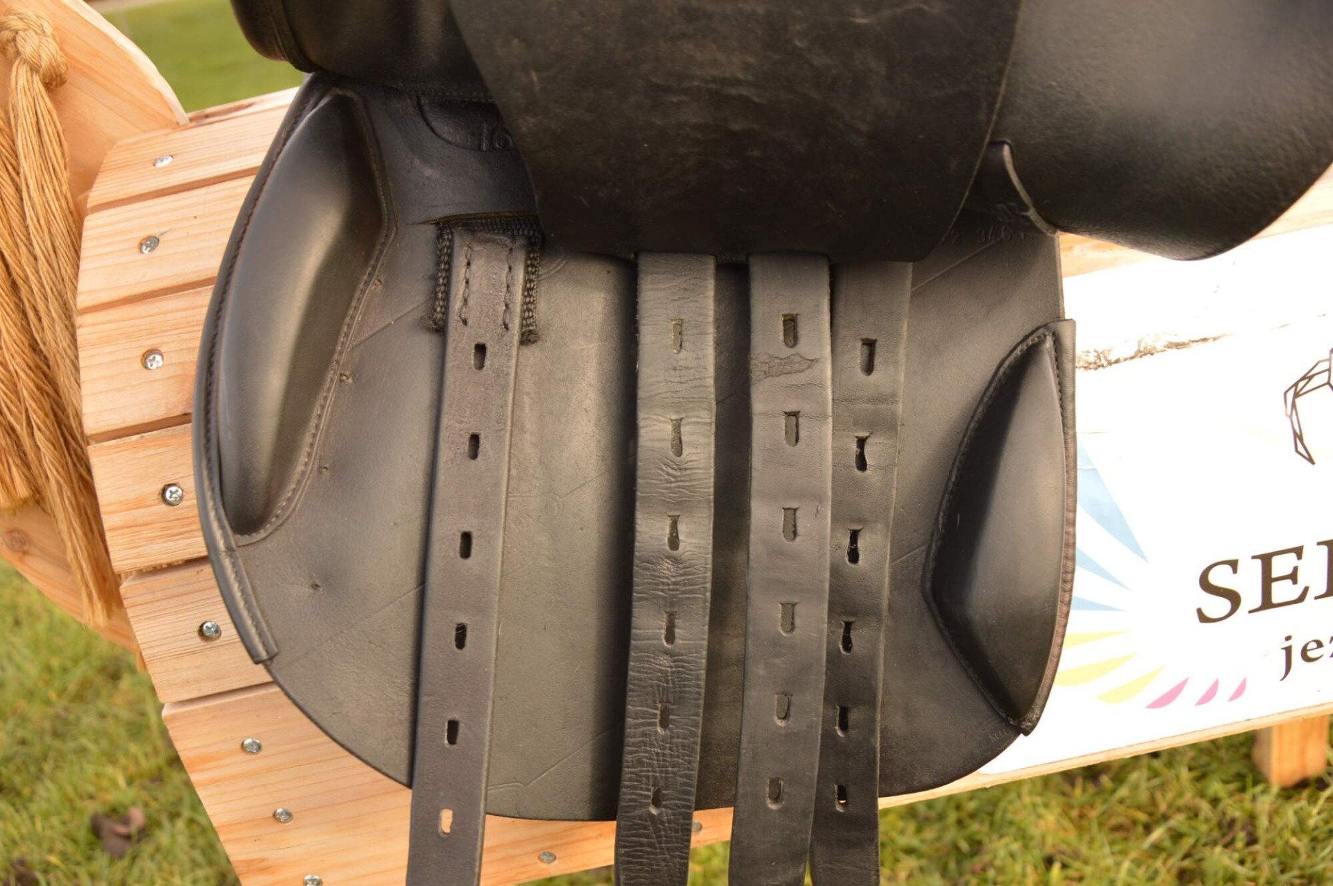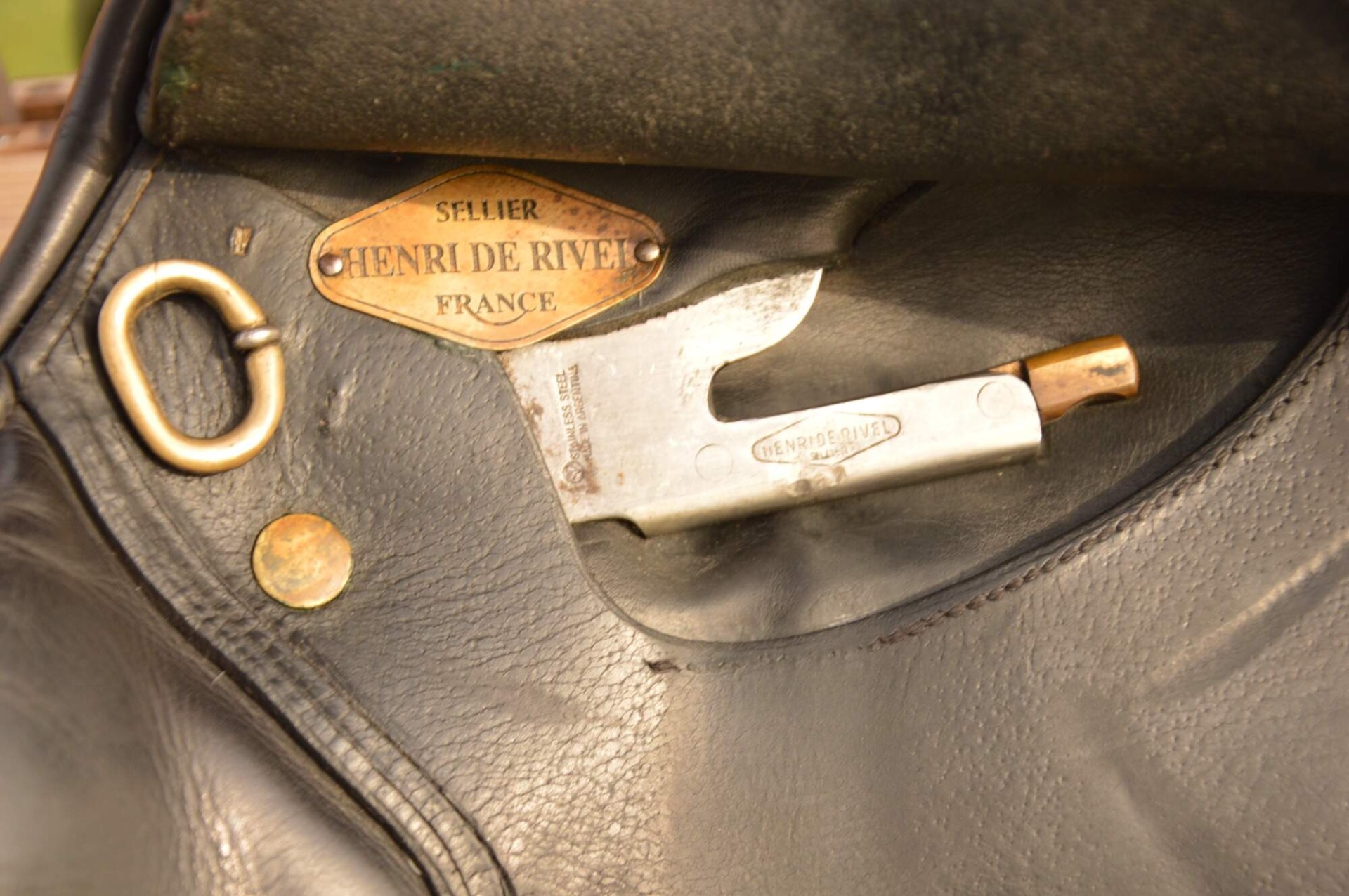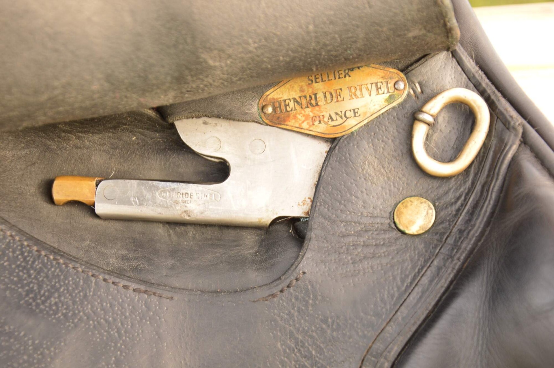 Skokové sedlo Henri de Rivel - Francie. Posedlí 16" a komora 2 (12 cm). Díky úhlu komory a nízkým polštářům je sedlo ideální na krátké a kulaté koně či poníky bez kohoutku či nízkým kohoutkem. Velmi měkké pohodlné sedlo, kvalitní kůže. Posedlí mělčí, kolenní opěrky vyšší, potažené protiskluzovou kůží. Výborně drží sed, podporuje nad skokem. Sedlo klasickými známkami použití, velmi dobrý stav.