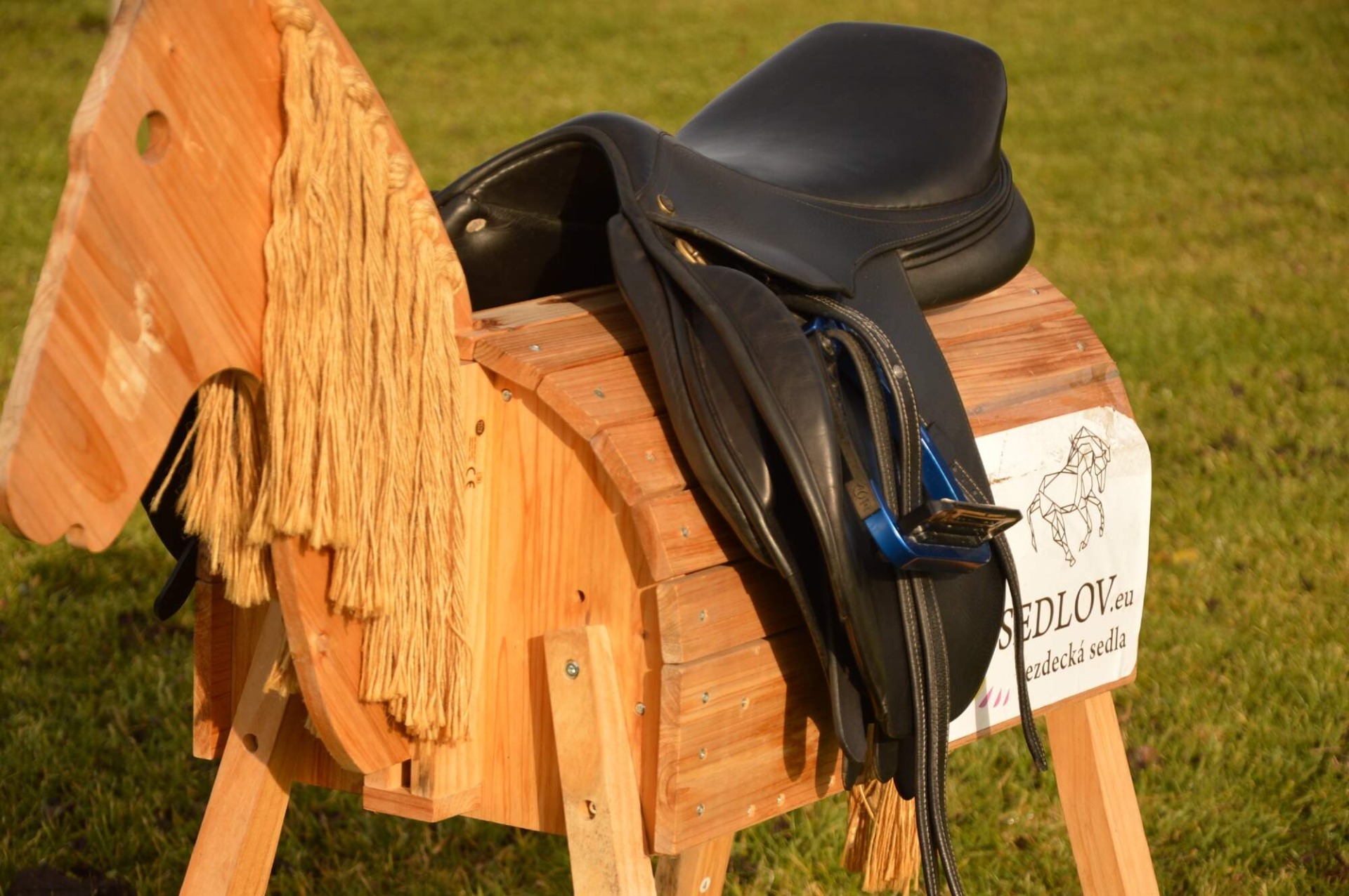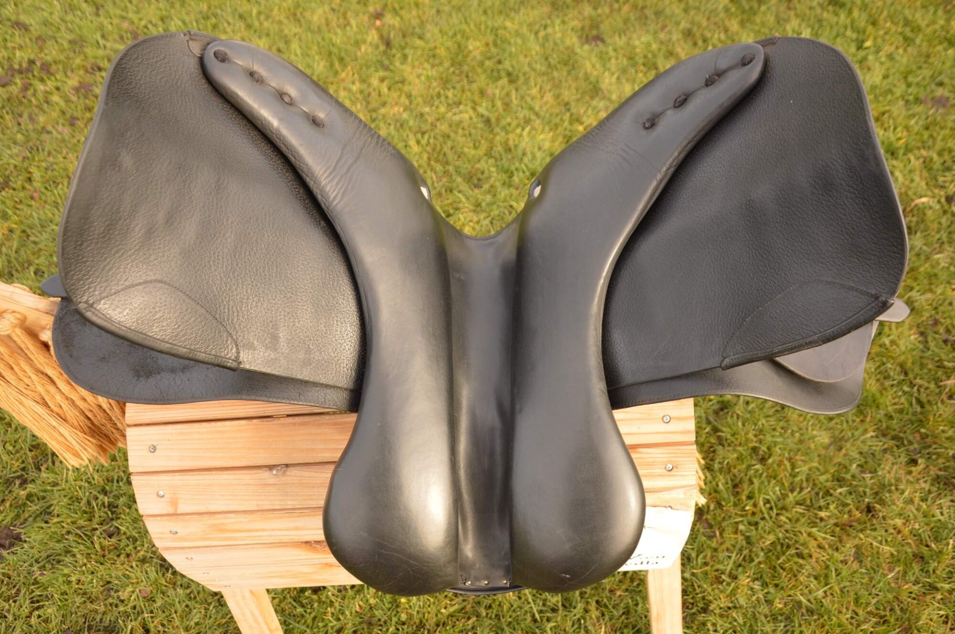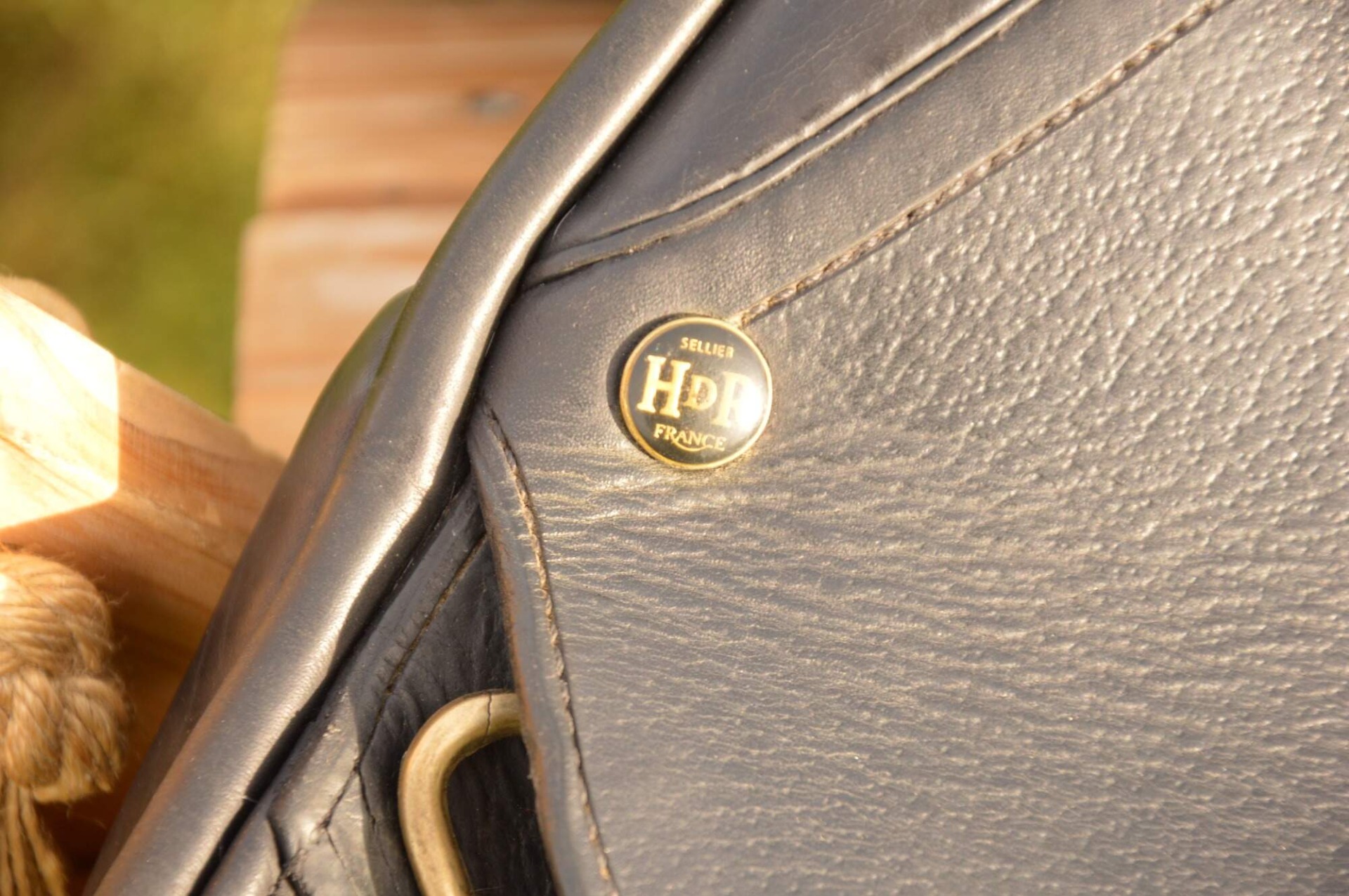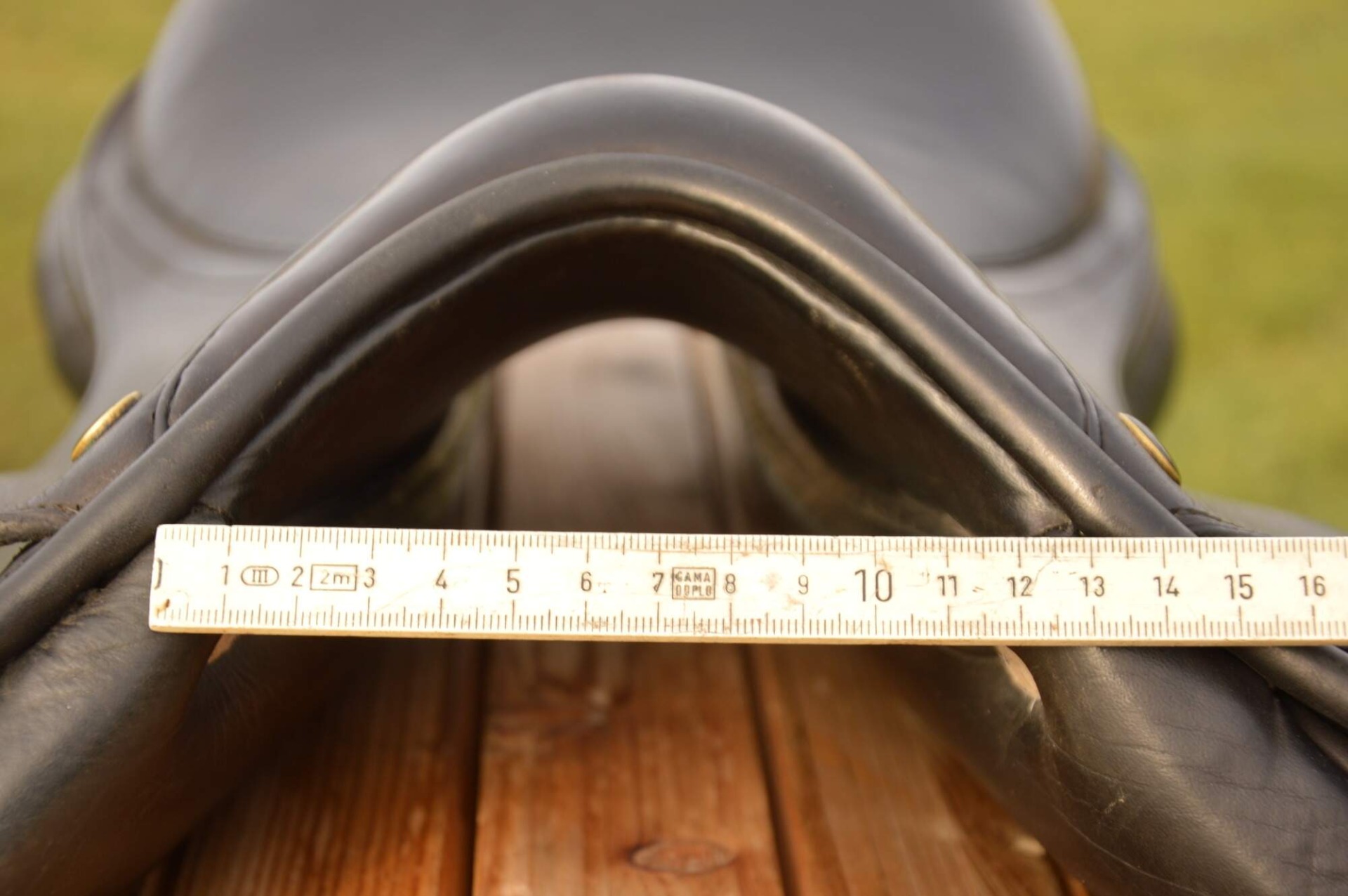 Skokové sedlo Henri de Rivel - Francie. Posedlí 16" a komora 2 (12 cm). Díky úhlu komory a nízkým polštářům je sedlo ideální na krátké a kulaté koně či poníky bez kohoutku či nízkým kohoutkem. Velmi měkké pohodlné sedlo, kvalitní kůže. Posedlí mělčí, kolenní opěrky vyšší, potažené protiskluzovou kůží. Výborně drží sed, podporuje nad skokem. Sedlo klasickými známkami použití, velmi dobrý stav.