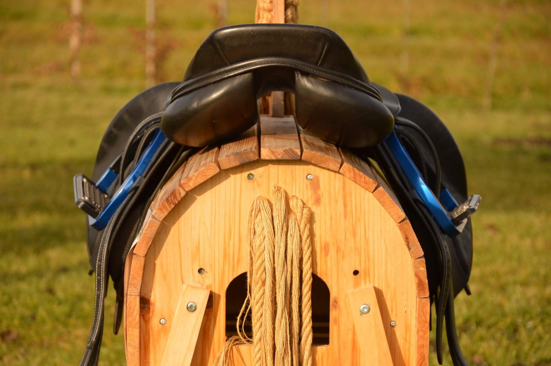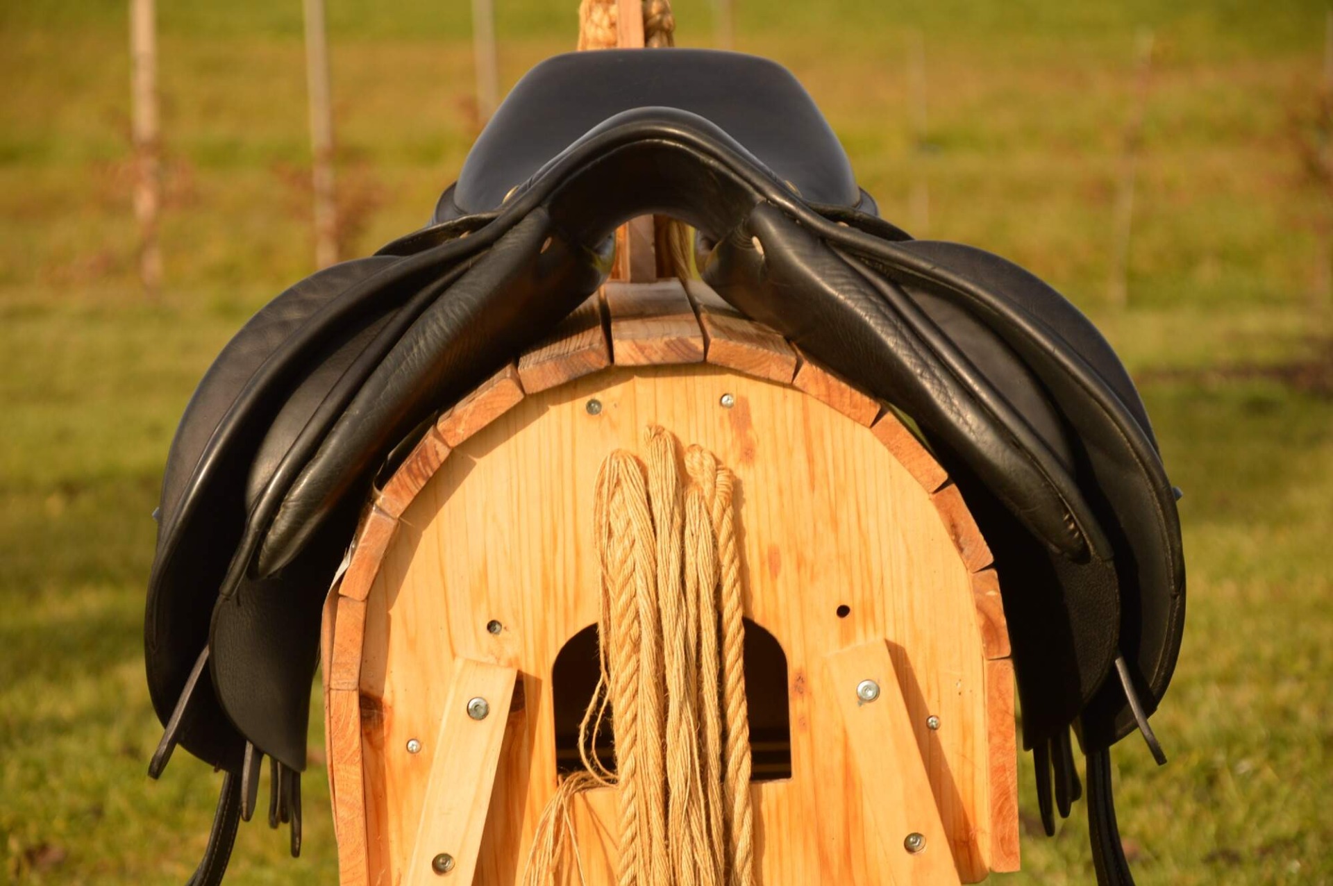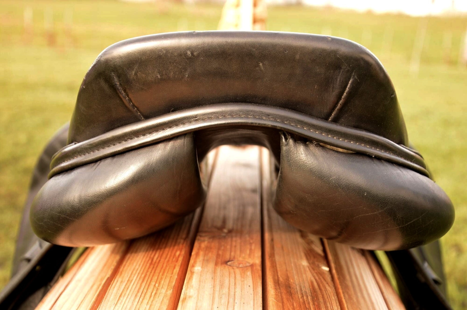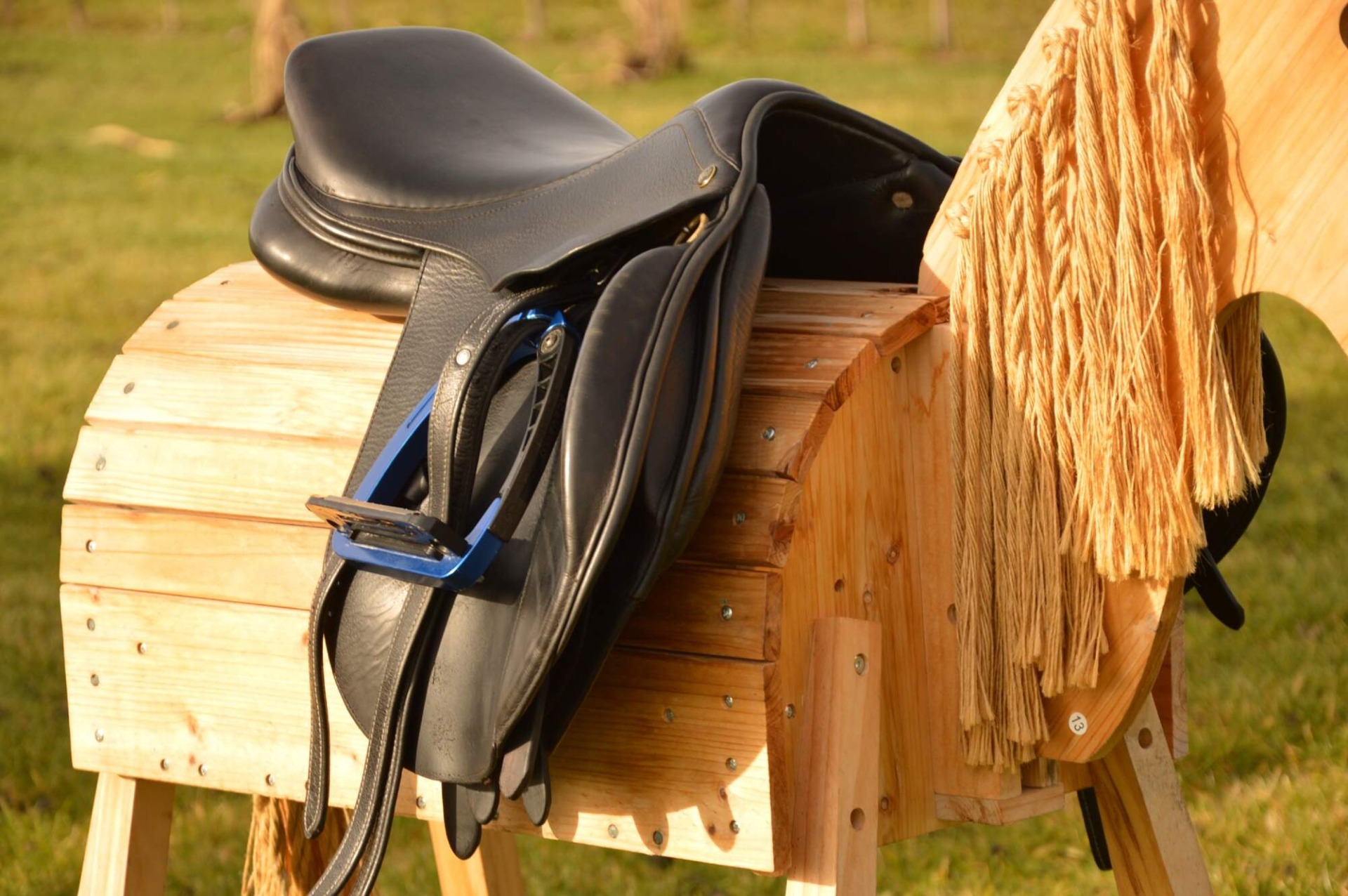 Skokové sedlo Henri de Rivel - Francie. Posedlí 16" a komora 2 (12 cm). Díky úhlu komory a nízkým polštářům je sedlo ideální na krátké a kulaté koně či poníky bez kohoutku či nízkým kohoutkem. Velmi měkké pohodlné sedlo, kvalitní kůže. Posedlí mělčí, kolenní opěrky vyšší, potažené protiskluzovou kůží. Výborně drží sed, podporuje nad skokem. Sedlo klasickými známkami použití, velmi dobrý stav.