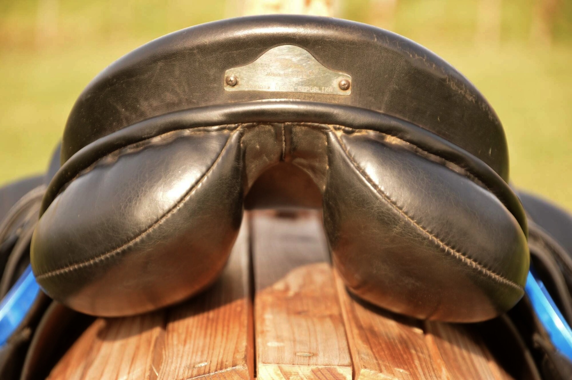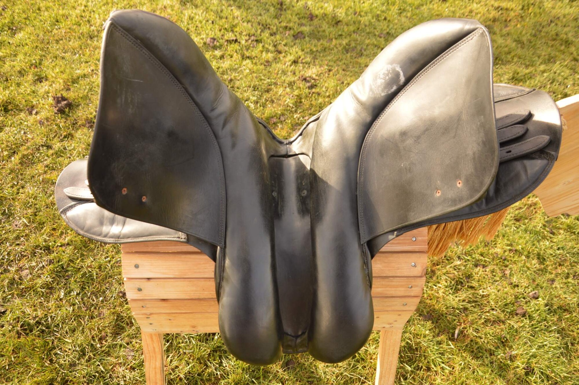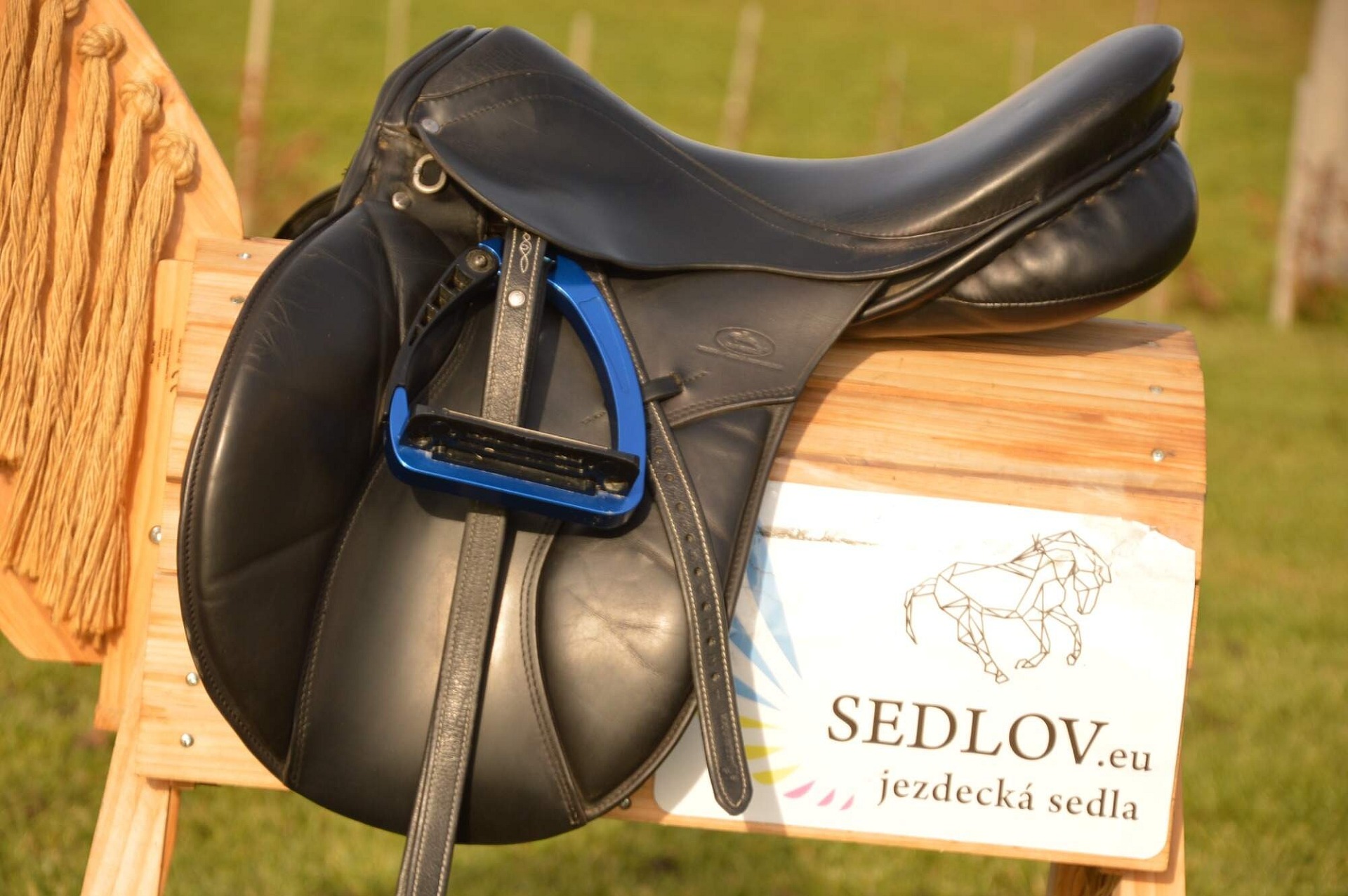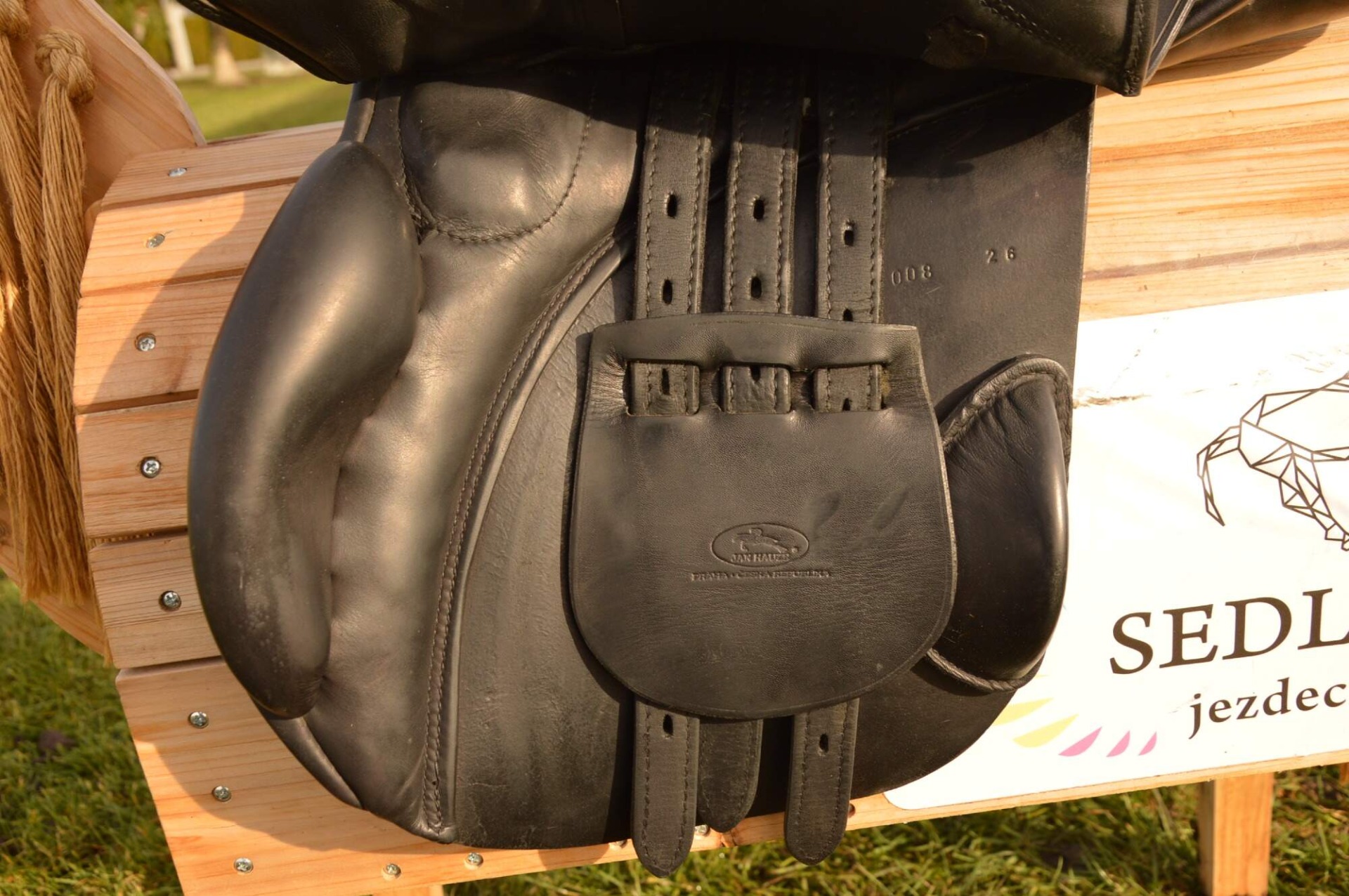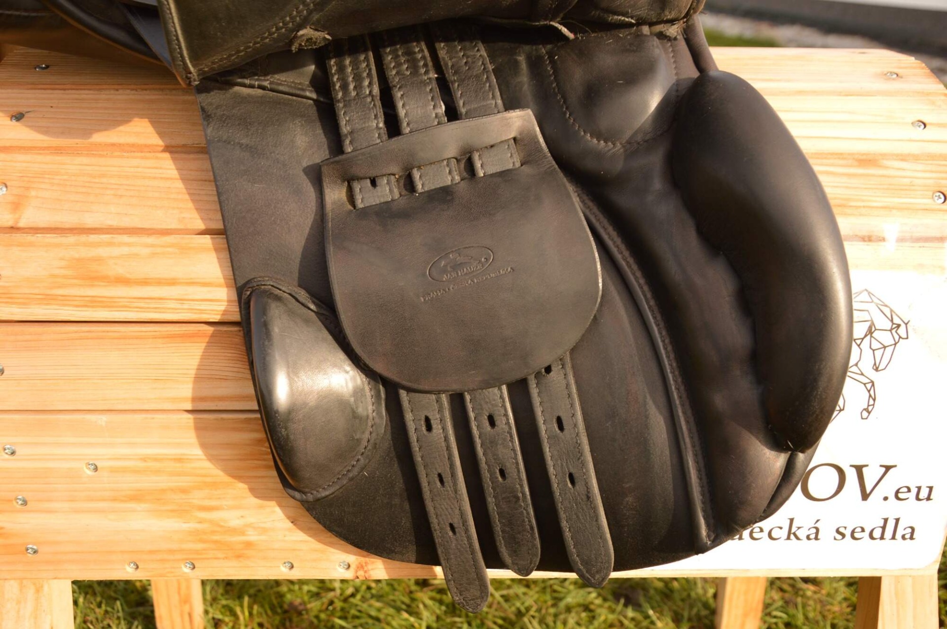 Černé anglické sedlo Jan Hauzr. Posedlí 17,5", komora 3 (16 cm). Sedlo má střední kolenní opěrky, je měkké, pohodlné. Možno využít jako hobby sedlo pro toulky přírodou i jízdárenskou práci. Postaveno na dřevěné kostře s kokovými výztuhami, šito z kvalitní silné kůže. Je v moc dobrém stavu, má jen běžné známky. použití.