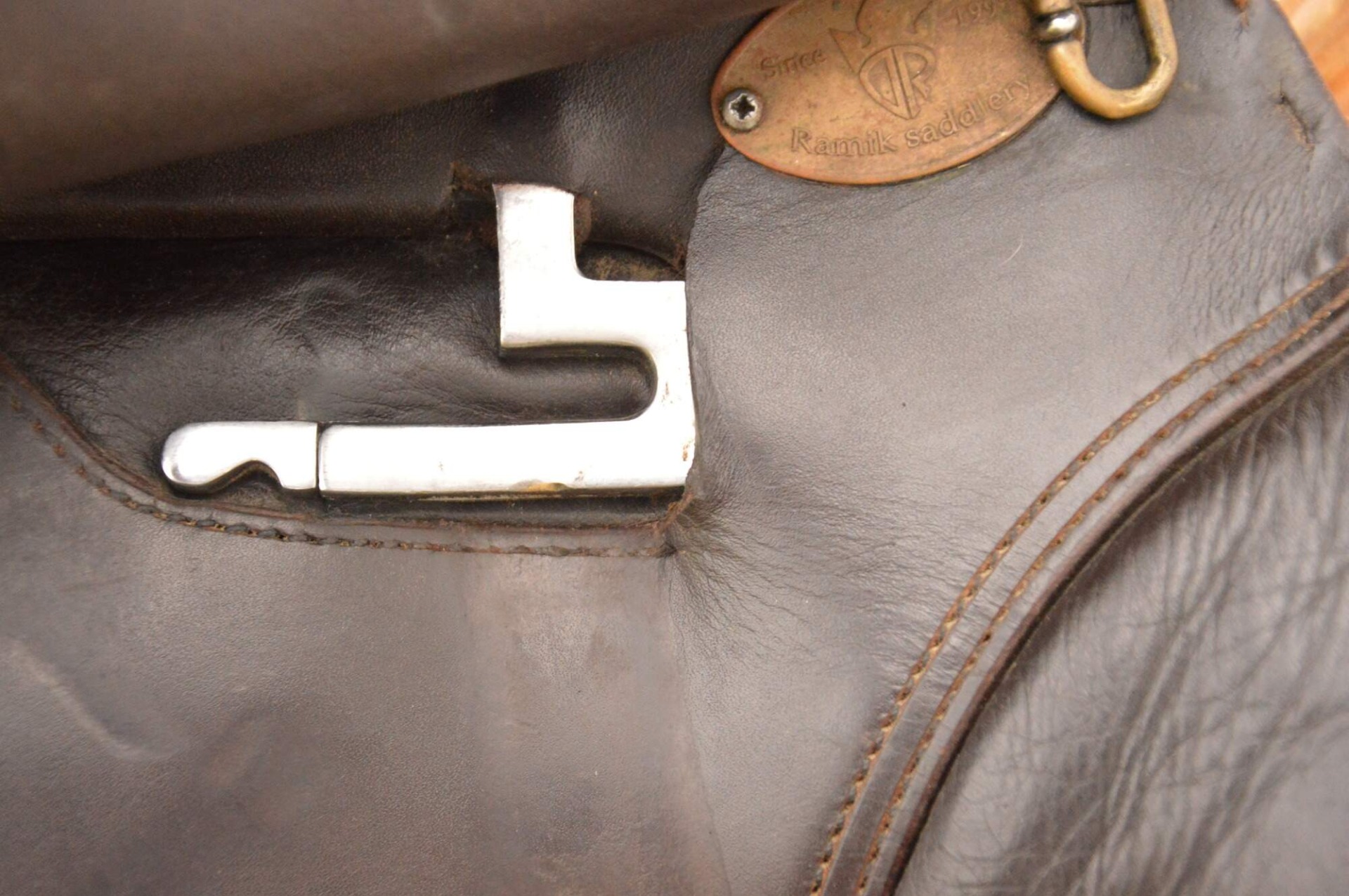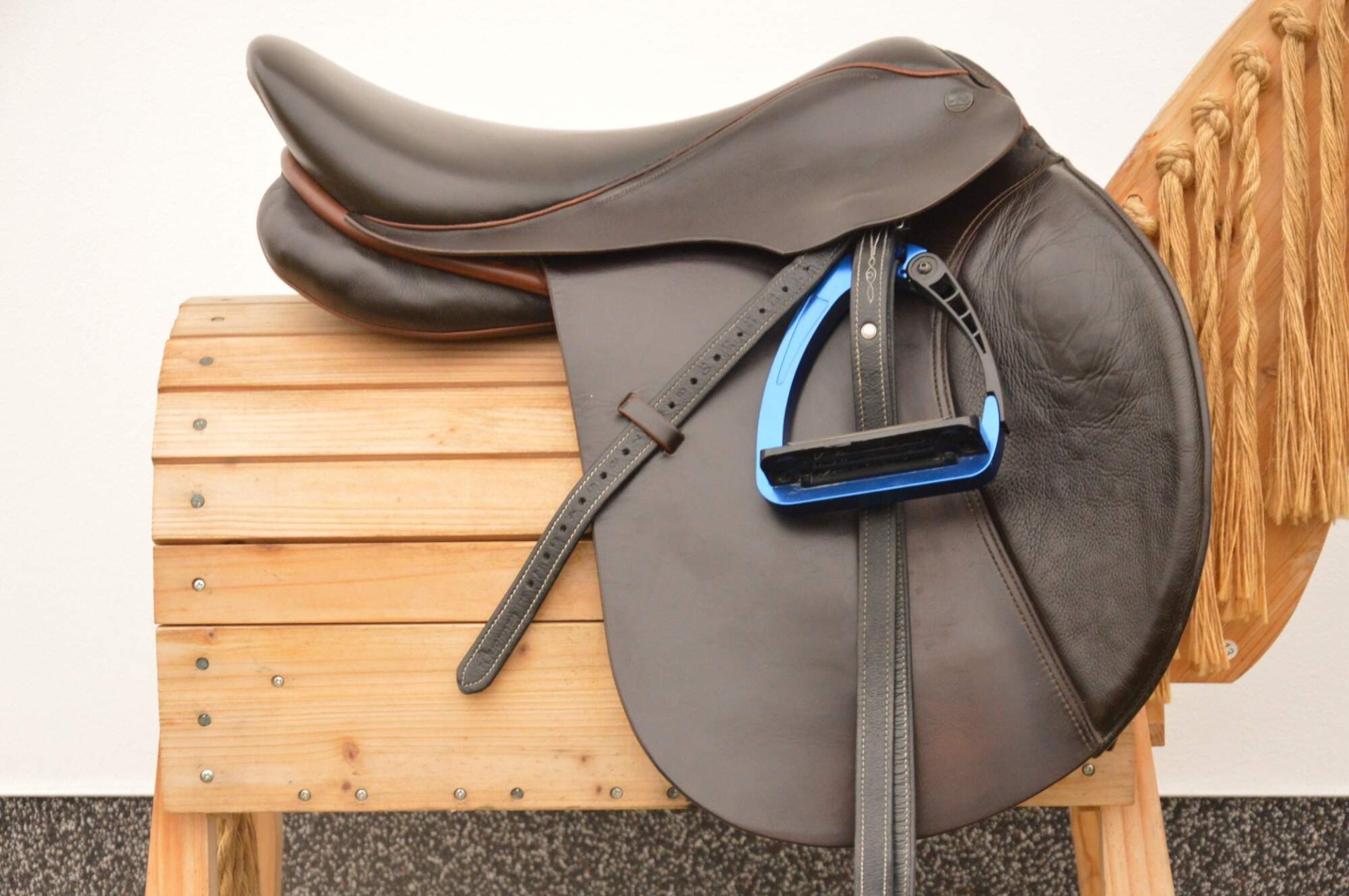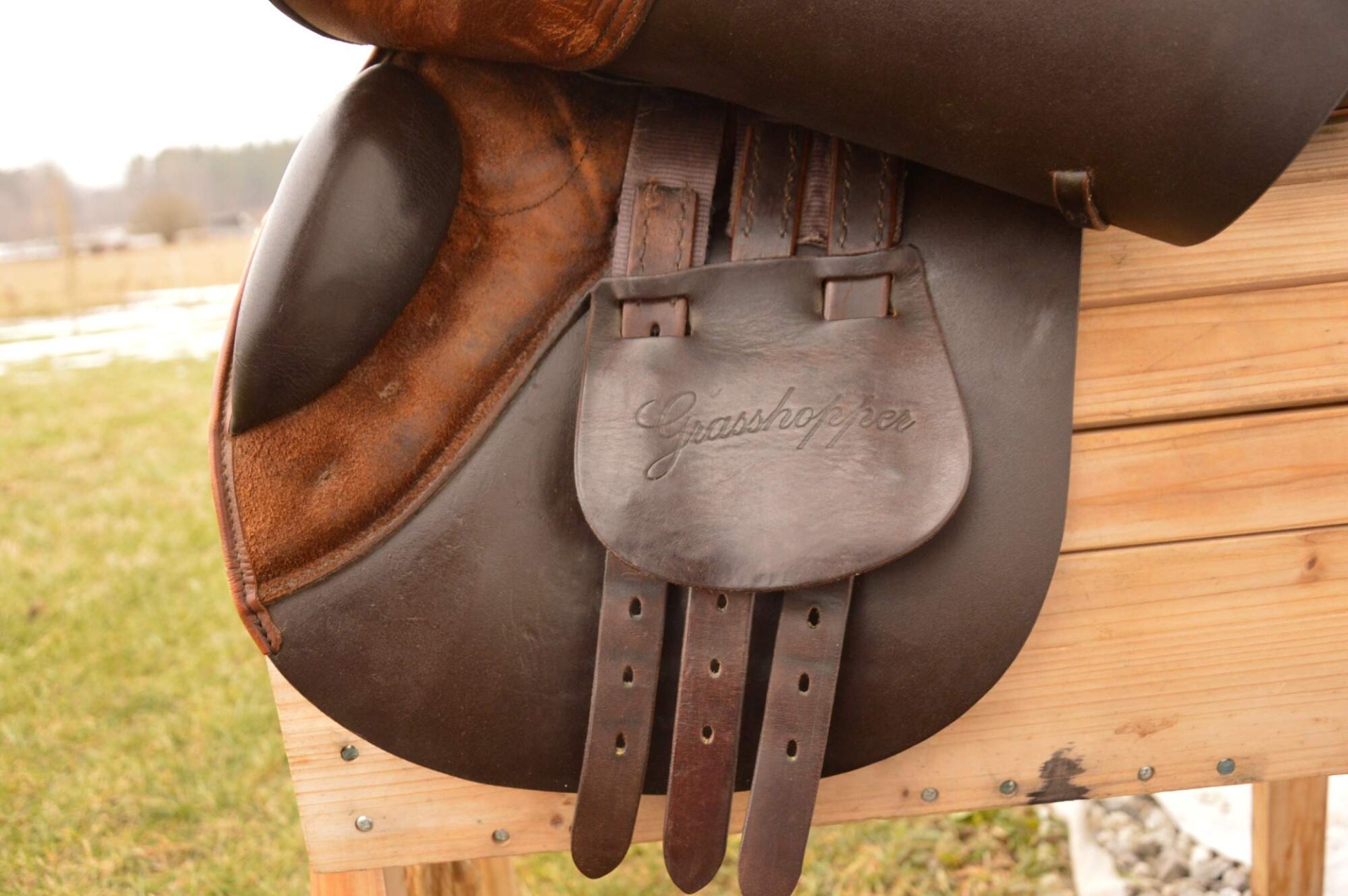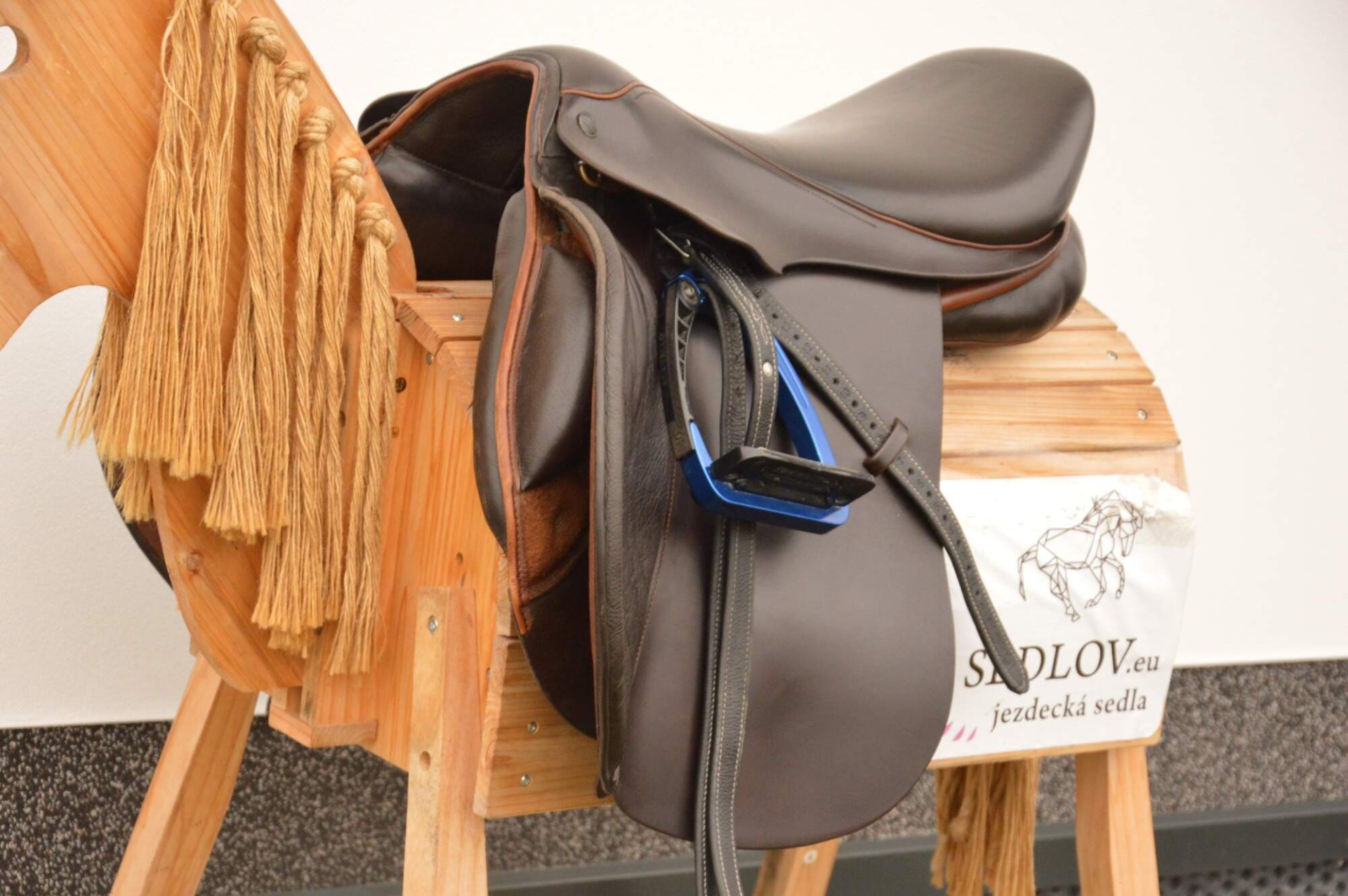 Skokově univerzální sedlo od sedlářství Ramik, model Grasshopper v krásném hnědém designu. Posedlí 17,5" a komora 3 (16 cm). Sedlo s měkkým posedlím a středními kolenními opěrkami. Má vlněné polštáře, široký páteřní kanál, zadní část kostry je rozšířená tak, aby co nejlépe roznášela váhu jezdce. Perfektní sedlo do terénu i skoky. Sedlo je ve velmi dobrém stavu, menší známky použití.
