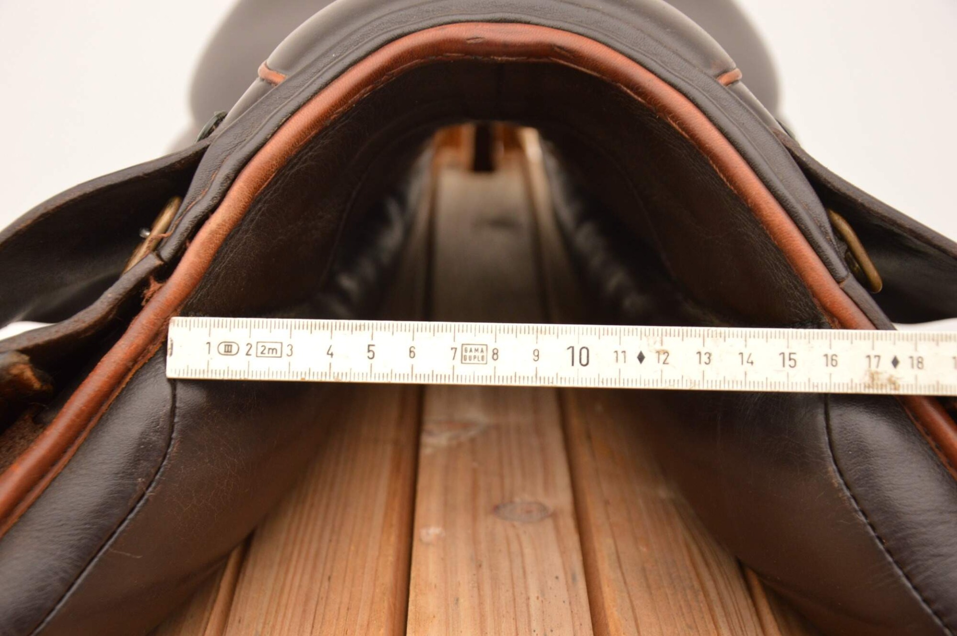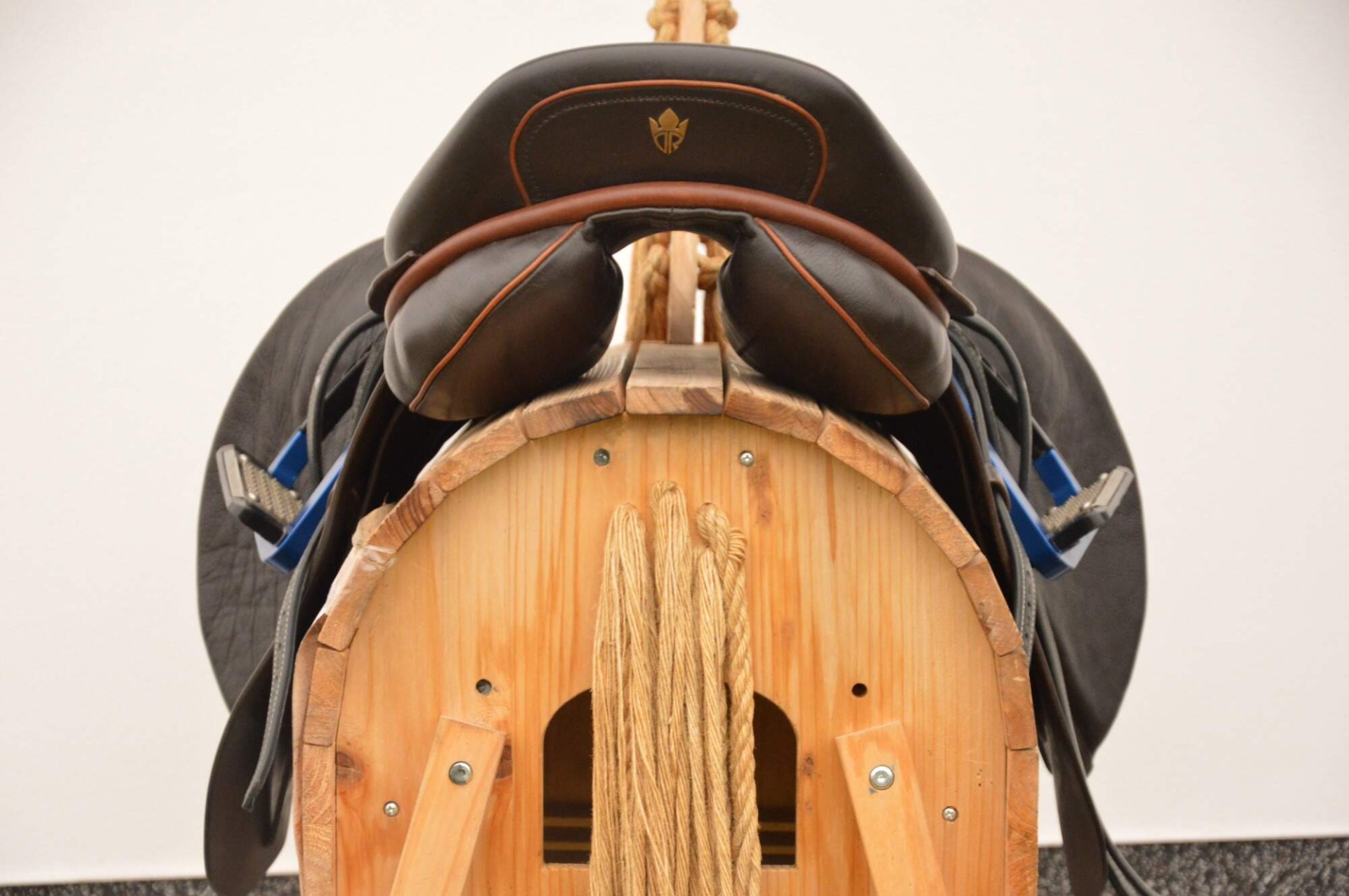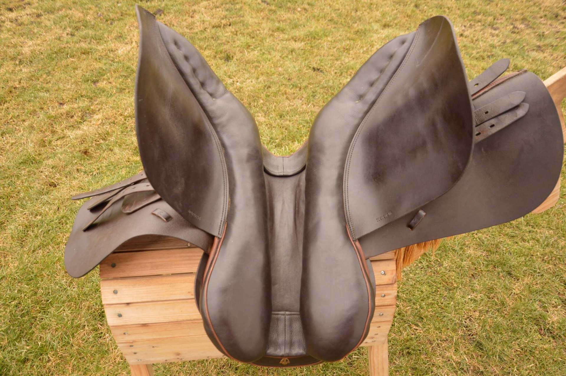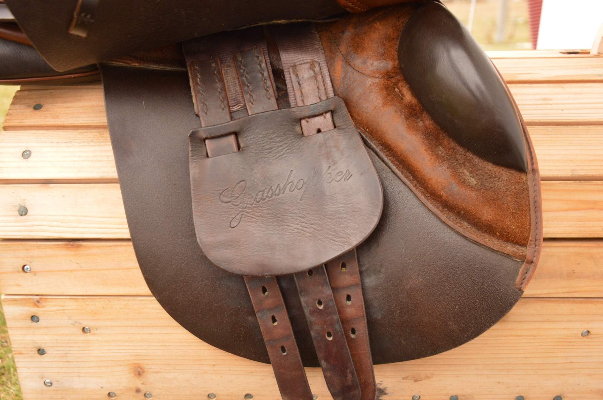 Skokově univerzální sedlo od sedlářství Ramik, model Grasshopper v krásném hnědém designu. Posedlí 17,5" a komora 3 (16 cm). Sedlo s měkkým posedlím a středními kolenními opěrkami. Má vlněné polštáře, široký páteřní kanál, zadní část kostry je rozšířená tak, aby co nejlépe roznášela váhu jezdce. Perfektní sedlo do terénu i skoky. Sedlo je ve velmi dobrém stavu, menší známky použití.