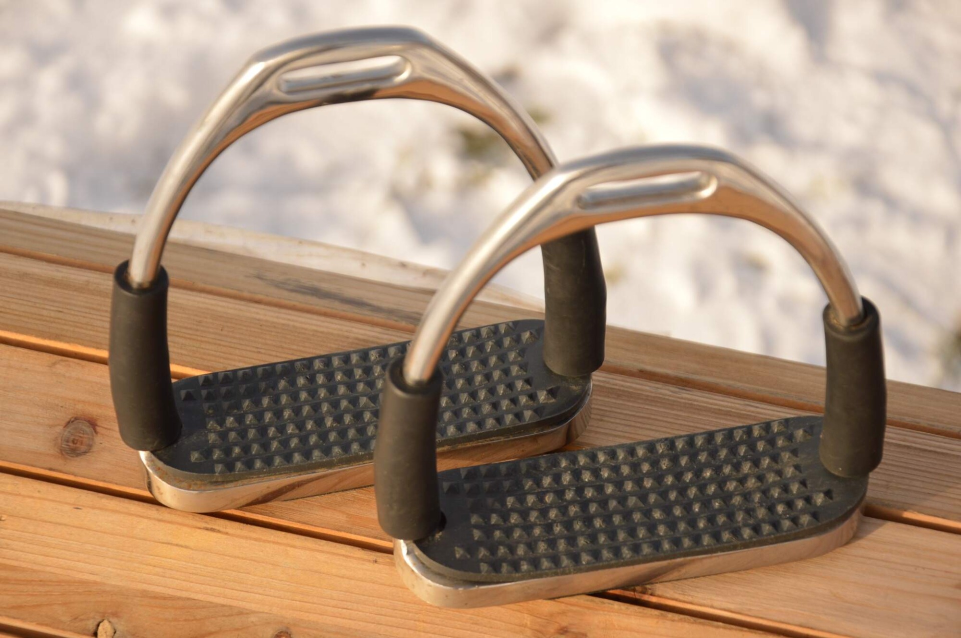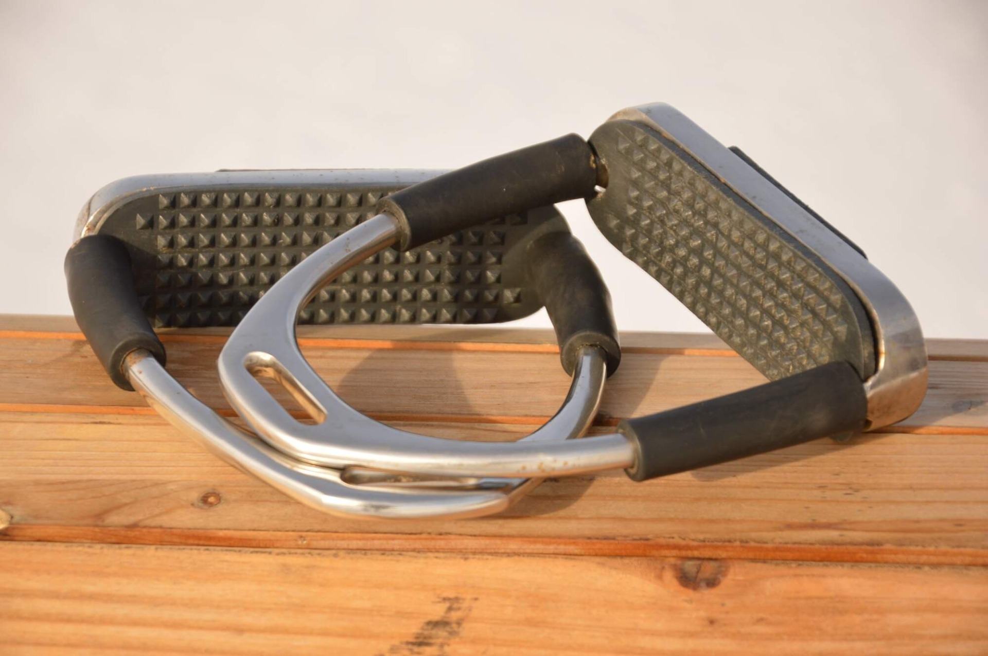 Bezpečnostní kloubové třmeny z nerezové ocele, délka 12 cm. Konstrukce umožňující 6 základních pohybů - dopředu, dozadu, ze strany na stranu a pootočení v obou směrech. Třmeny jsou osazeny gumovými nášlapkami. Výborný stav, jen drobné známky použití.