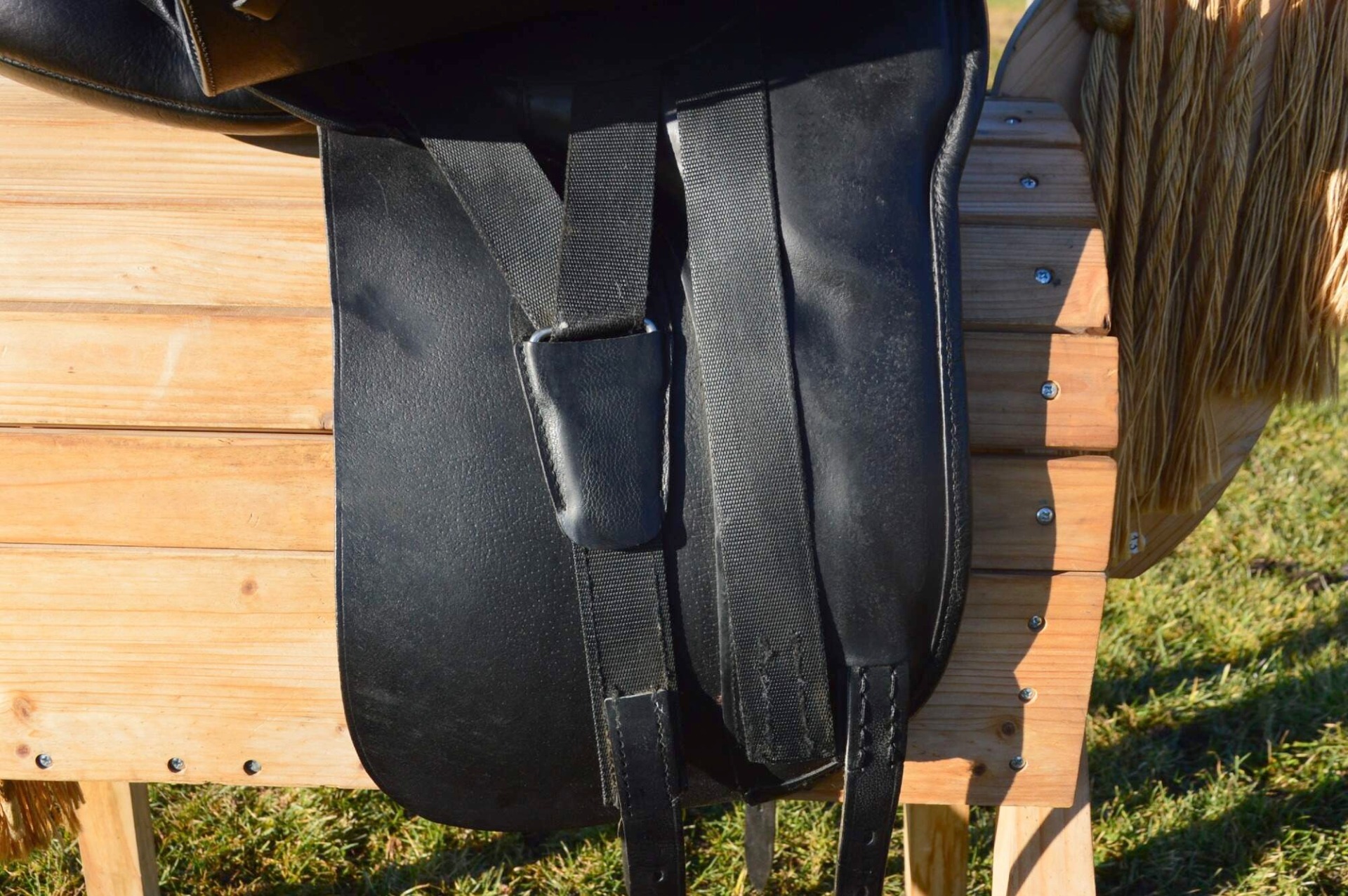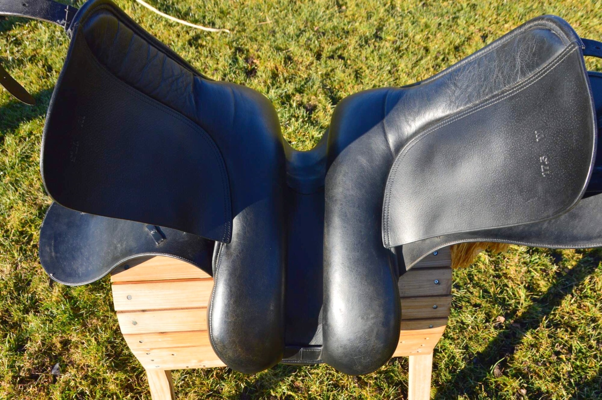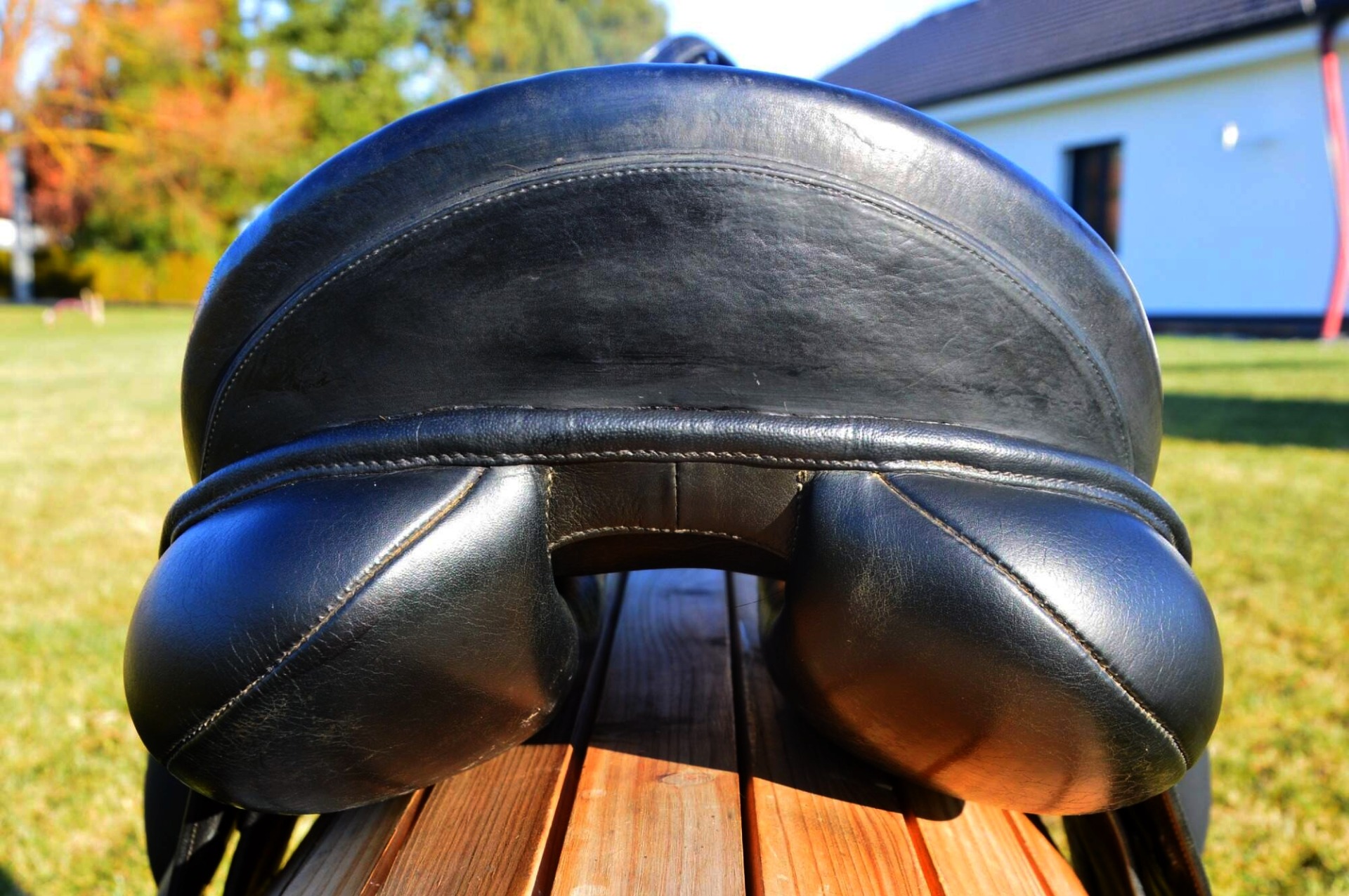 Sedlo nabízí AMS speciální sedlové polštáře - dvouvrstvá konstrukce s rovnoměrně měkkou a prodyšnou syntetickou pěnou + individuálně nastavitelná polyester výplň. Jsou určeny pro širokou nosnou plochu. Široký páteřní kanál, středně umístěné řemeny na podbřišník s tvarem do V pro co možná nejlepší stabilitu sedla. Výborný stav, jen menší známky použití.