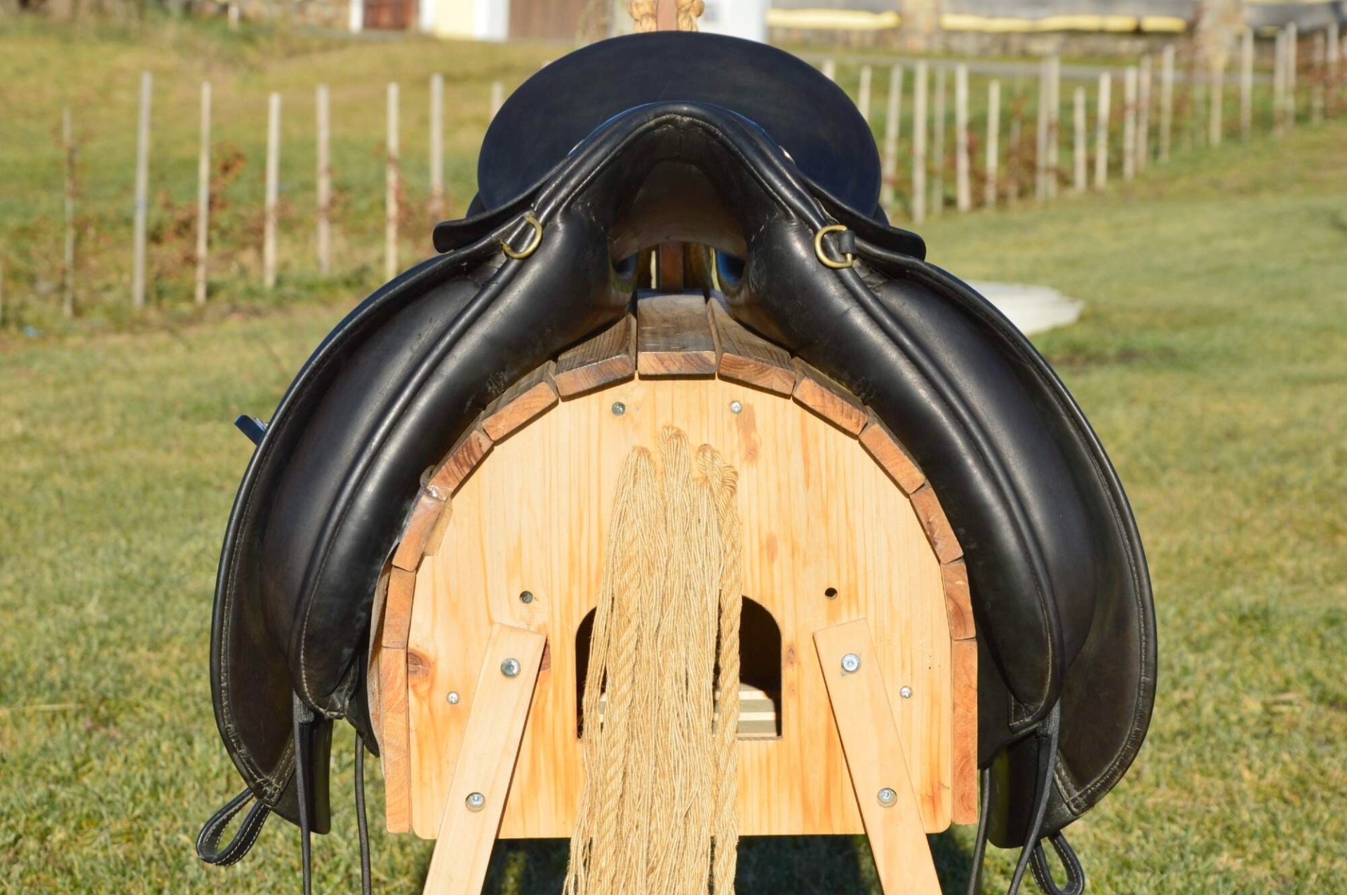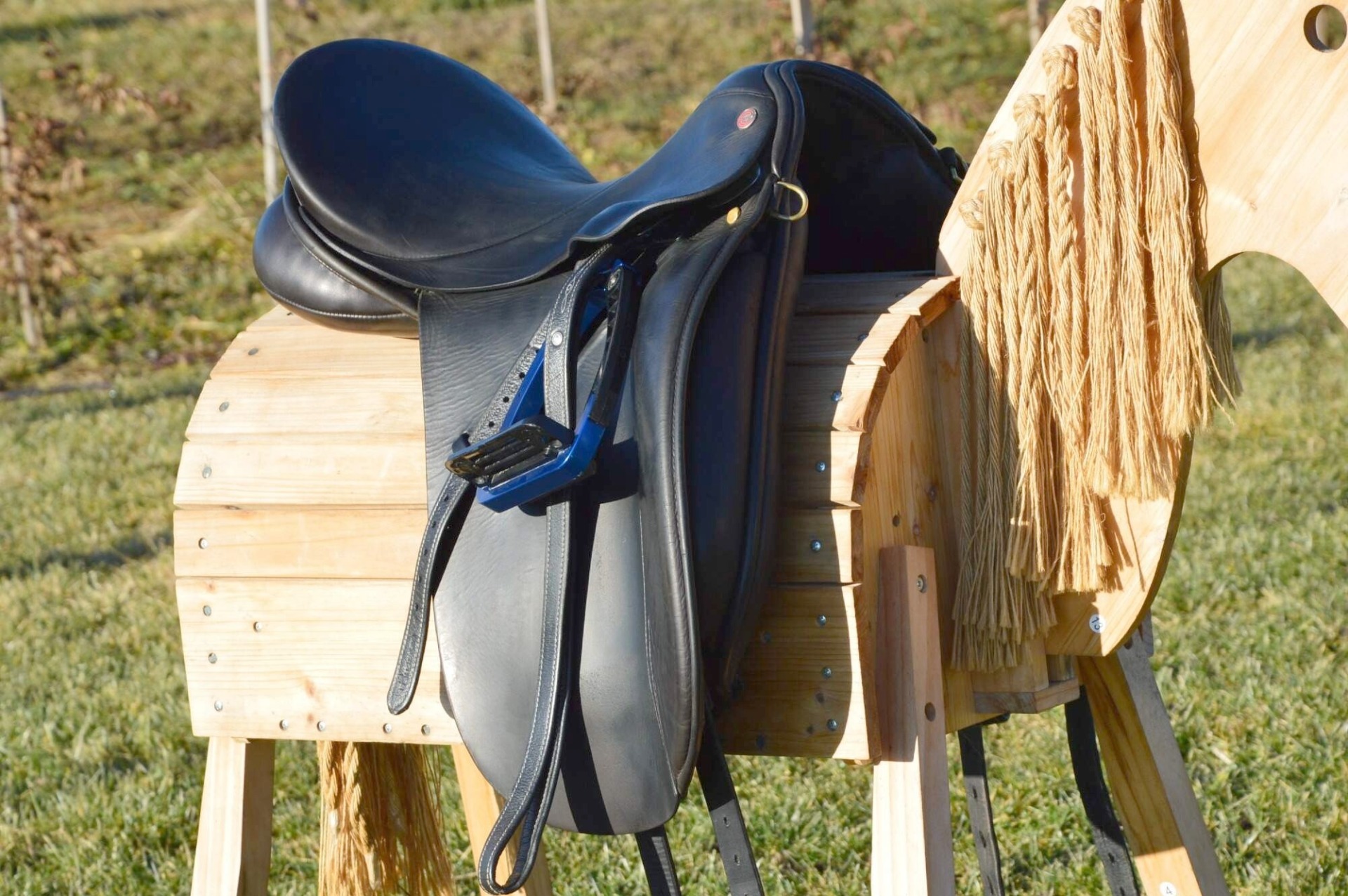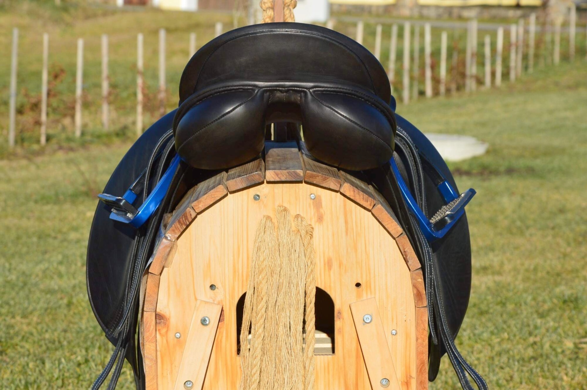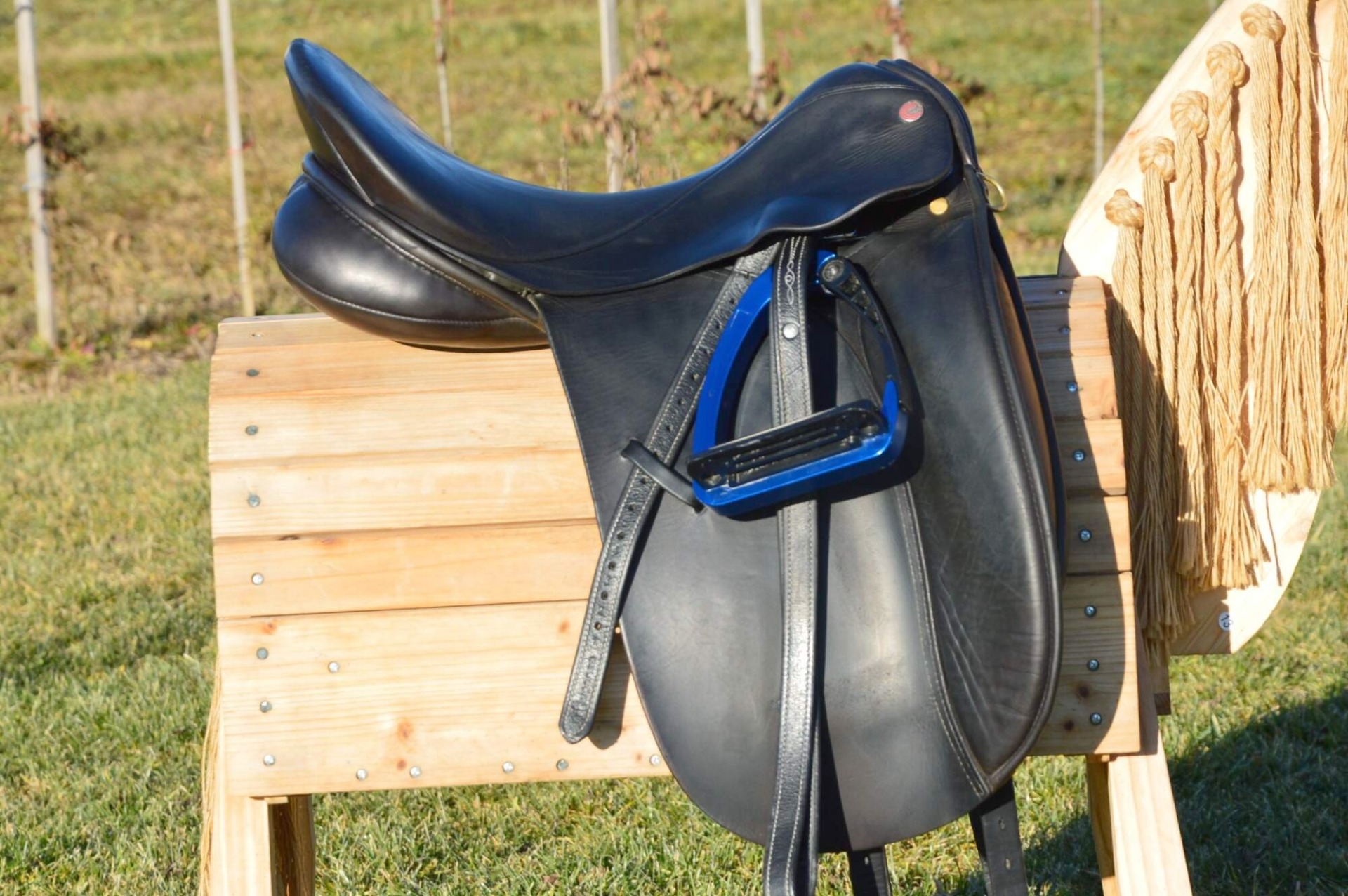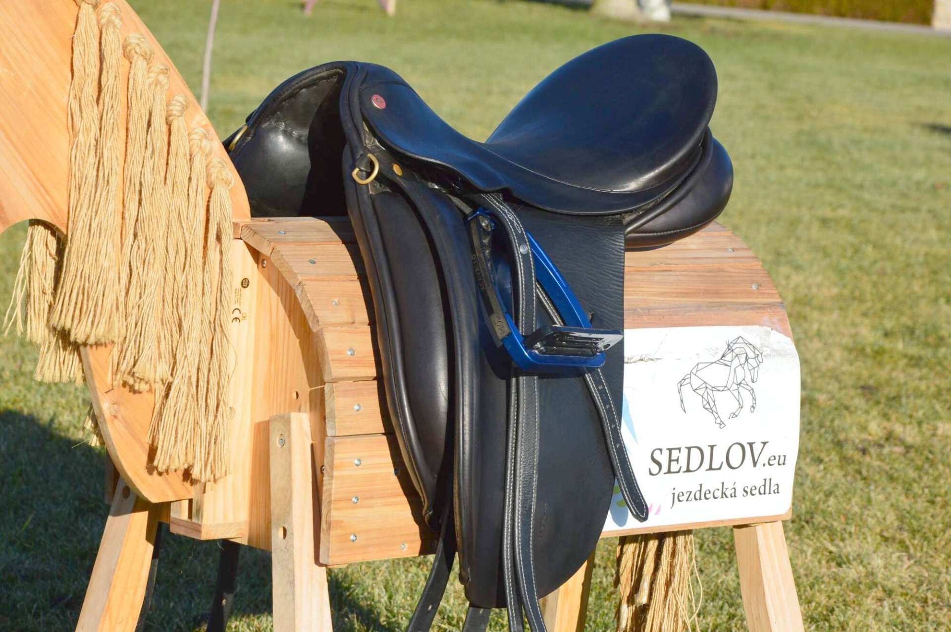 Černé drezurní sedlo německo-anglické výroby Euroriding, model Diamant. Posedlí 17", komora pasná 3 (15 cm). Měkce polstrované hluboké posedlí a kontaktní konstrukce bočnice, vysoké kolenní opěrky. Velmi příjemná a měkká protiskluzová kůže. Sedlo velmi dobře vede v sedu, díky dostatečné fixaci a opravdu komfortnímu posazu je velice oblíbené. Klasická anglická dřevěná kostra, tvarovací vlněný polštář pro maximální komfort koně s možností individuální úpravy. Sedlo je v dobrém, klasické známky použití.