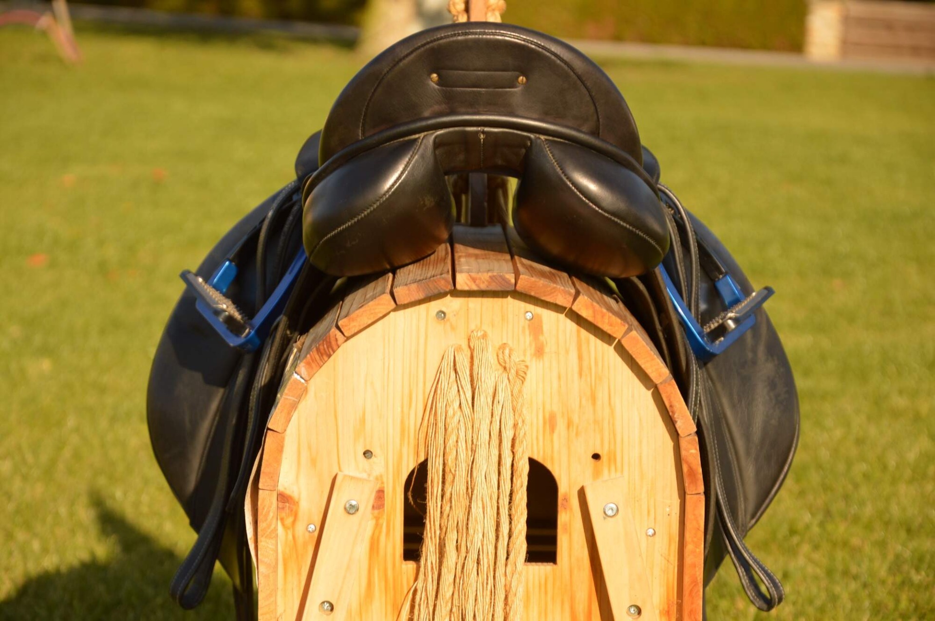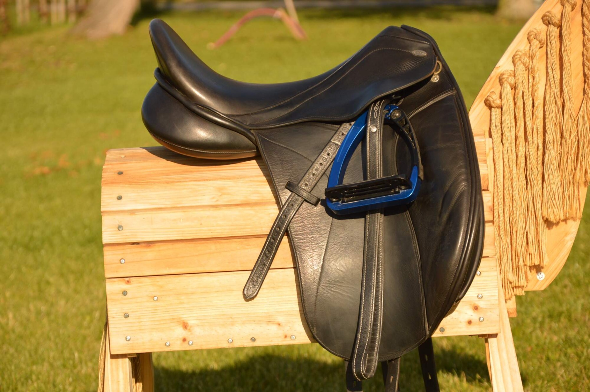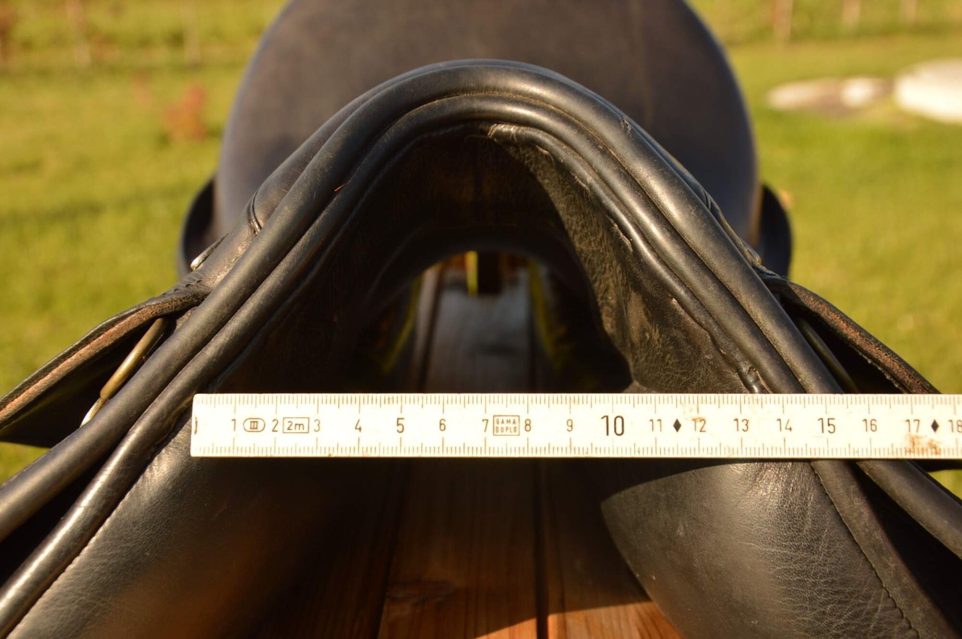 Drezurní sedlo KenTaur Medea II, posedlí 17" a komora 2 (14 cm). Jedná se o drezurní sedlo s hlubokým posedlím, kostrou s podélnými výztuhami z pérové oceli, polootevřenou přední komorou, vyššími kolenními opěrkami a vlněným sedlovým polštářem. Vyrobené z třísločiněné kůže. Sedýlko je pohodlné, měkké, výborně drží a podporuje sed jezdce. Vhodné jak na tréninky, tak závody. Sedlo je ve výborném stavu, má jen klasické známky použití.
