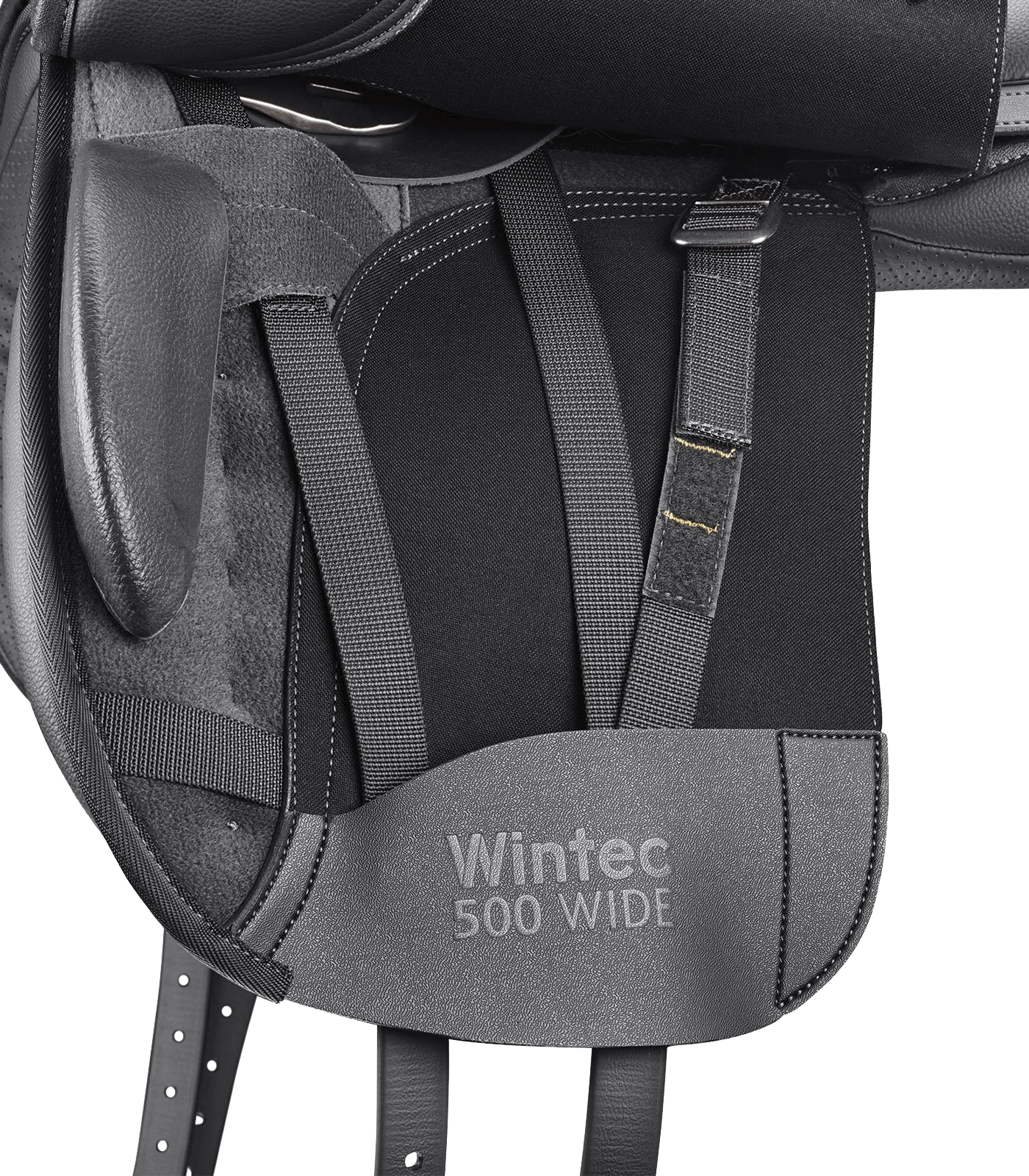 Drezurní sedlo Wintec 500 WIDE Hart. Speciálně vyvinuto pro koně s širokým hřbetem. Sedlo má středně hluboké posedlí s kulatou zadní rozsochou, tvarovanou bočnici v oblasti opěrek, odnímatelné opěrky na suchý zip, bočnice v oblasti opěrek je vyrobena z neklouzavého materiálu. Sedlo má v sedlových polštářích zabudovaný vzduchový systém Cair, který tlumí a rozkládá tlak na koňská záda, a dále má lehce vyměnitelnou přední komoru - systém EASY-CHANGE®. Nový model se systéme Easy Fit Solution umožňuje ještě lepší dopasování na většinu koní pomocí dokoupitelných podložek, které se vkládají do polštářů sedla.