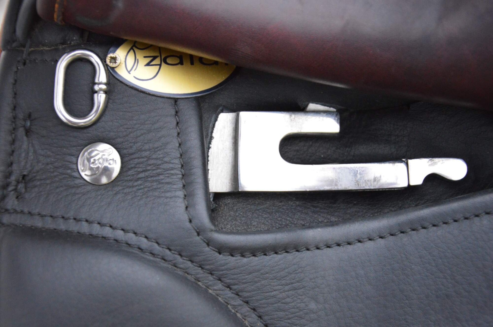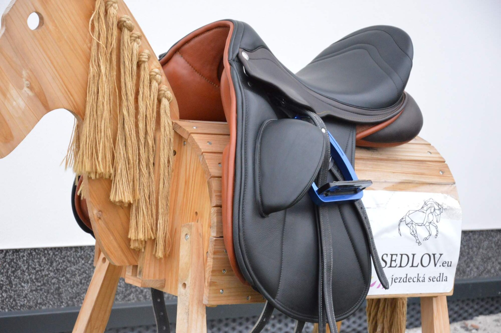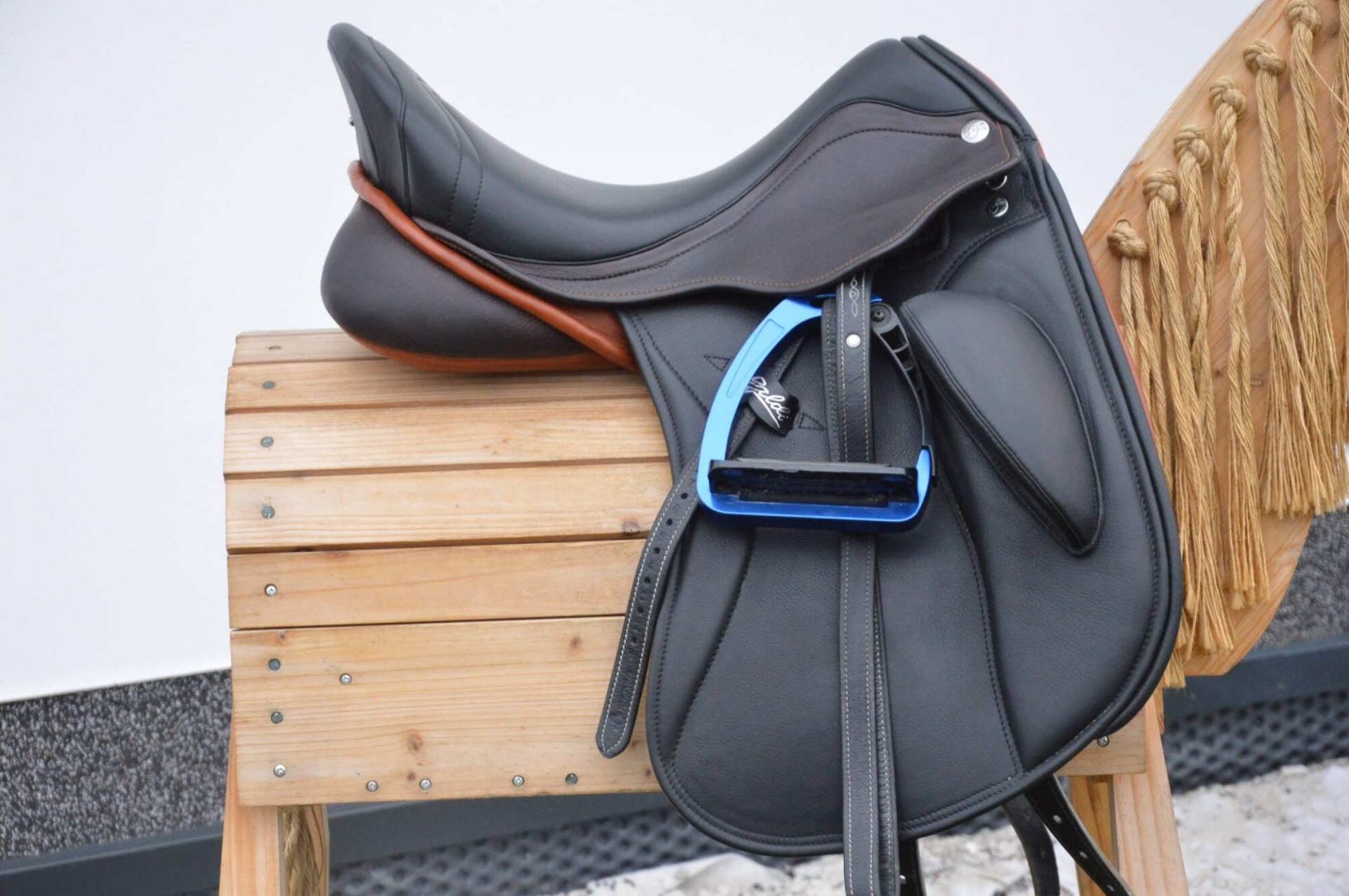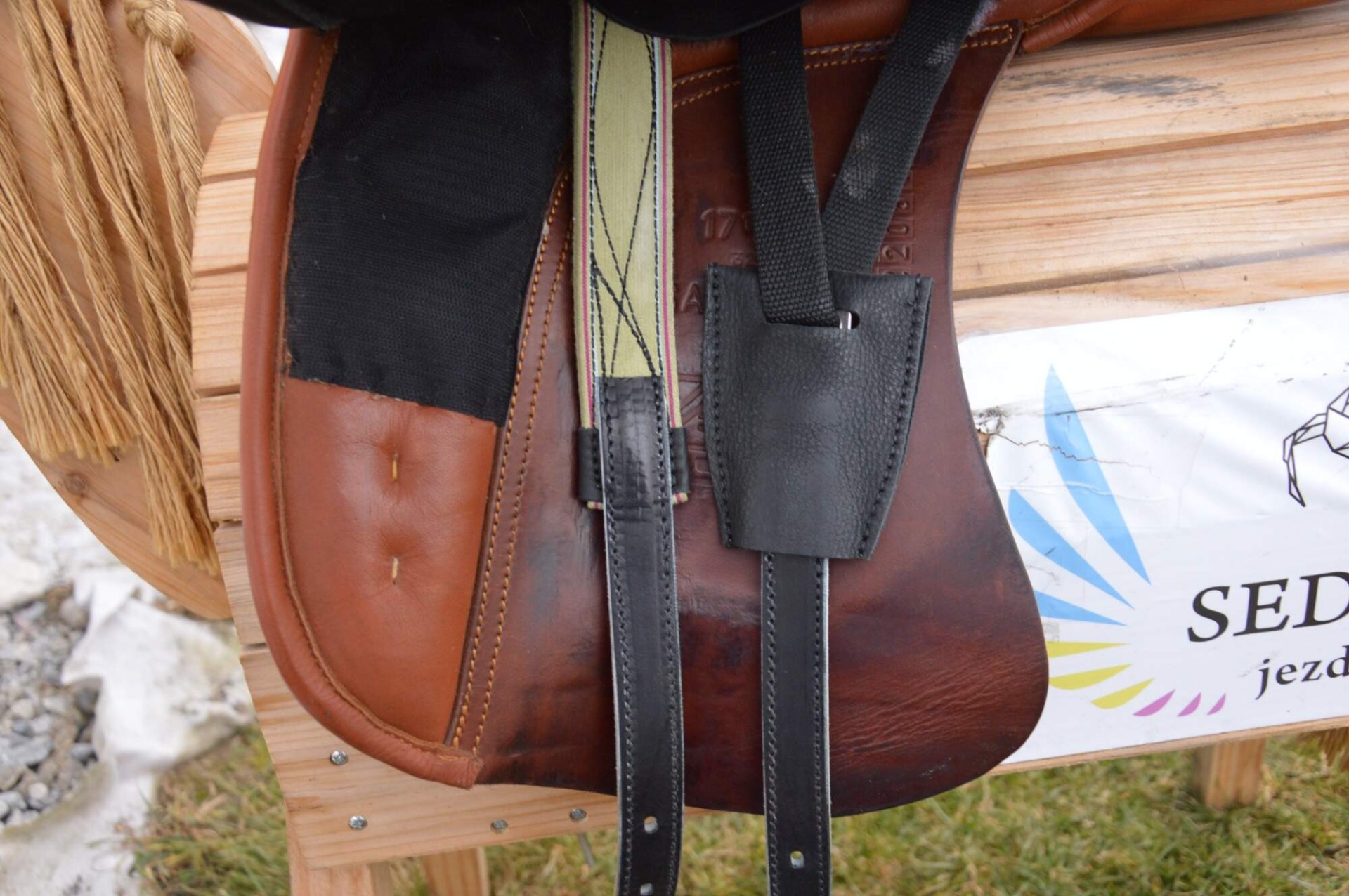 Drezurní sedlo Zaldi San Jorge s posedlí 17,5" a komorou 3 (16 cm), ideální pro hřbet s kohoutkem. Sedlo je vyrobeno z evropské přírodní kůže, speciální pružné, elastické a odolné. Má ergonomický panel, který dokonale zapadá do hřbetu koně a umožňuje mu úplnou volnost pohybu. Má velmi hluboké a pohodlné latexové posedlí, ergonomickou drezurní bočnici s dvojitým polstrováním, velmi výraznou anatomickou kolenní opěrkou - TM system. Opěrku je možné různě polohovat dle sedu jezdce, může se i otočit či jednoduše vyměnit za klasickou podlouhlou. Vše velmi snadno pomocí imbusu - k sedlu je přehledná příručka, náhradní opěrky, šablona i imbus. Sedlo neklouže, výborně vede sed a zároveň nechává pohybu volnost. V pracovních klusech jezdce výborně drží, v lehkých dovolí vysedat jen do správné výšky. Prakticky z něj nelze vypadnout, je tedy i ideální pro problémové koně, na kterých jezdec potřebuje velkou oporu v sedu. Sedlo smíšené polštáře - voděodolná vlna proti potu a gumový latex pro vyvážení zad koně. Třmenové zámky z nerezové oceli se sklonem 15%. Řemeny na podbřišník mají systém "V", který upevňuje sedlo rovnoměrně podél hřbetu koně. Sedlo je v top stavu, minimálně používané.