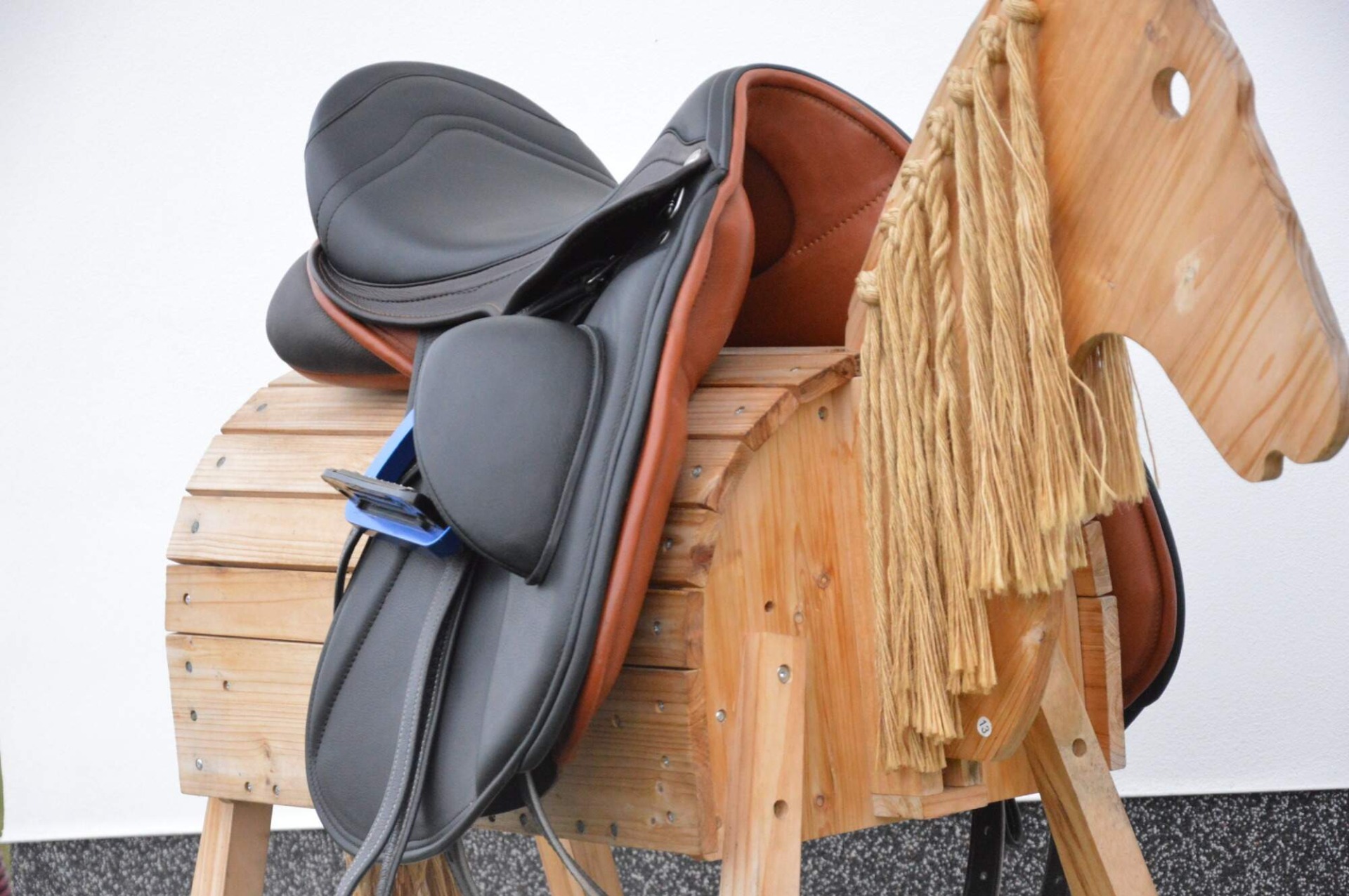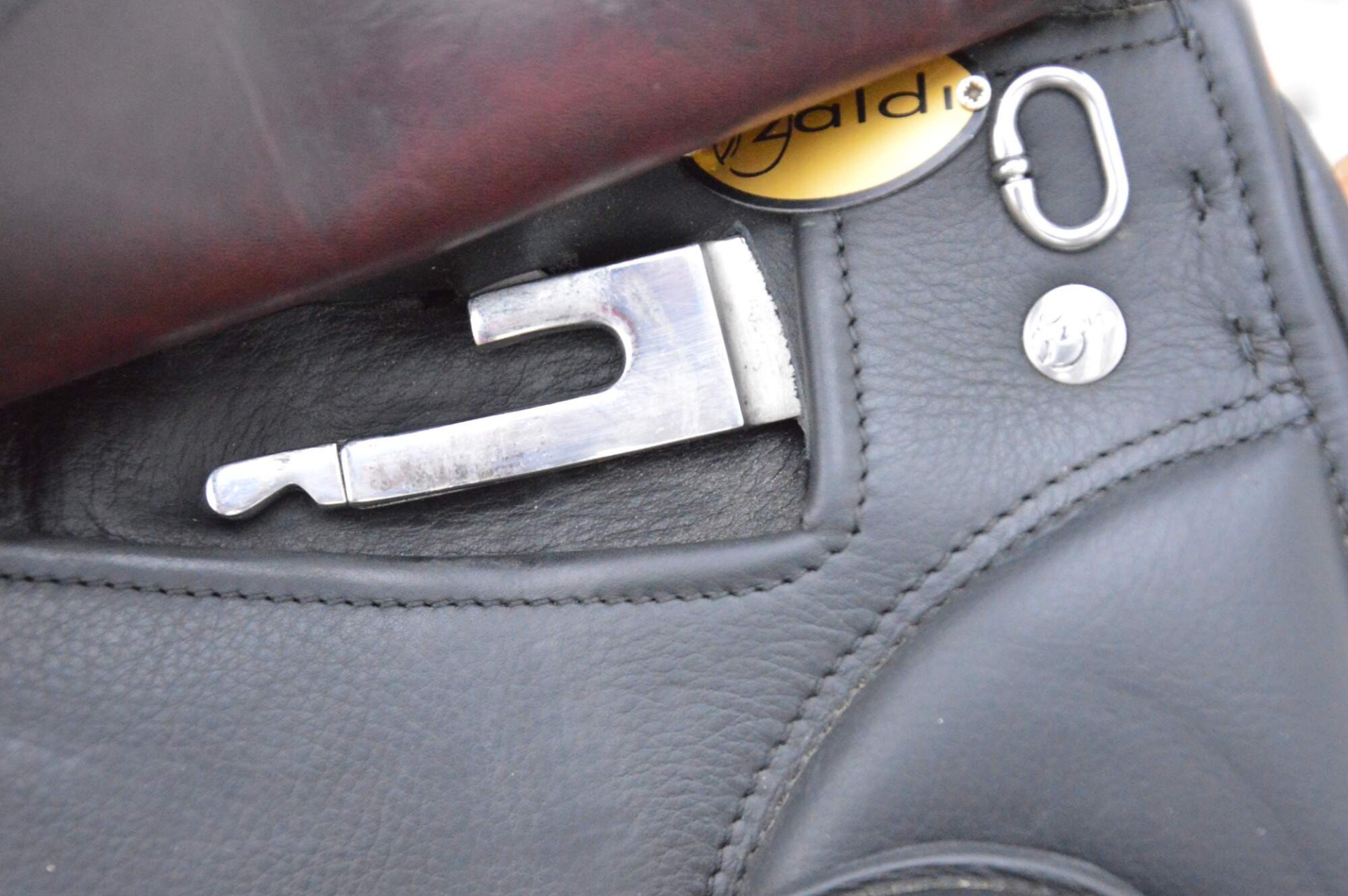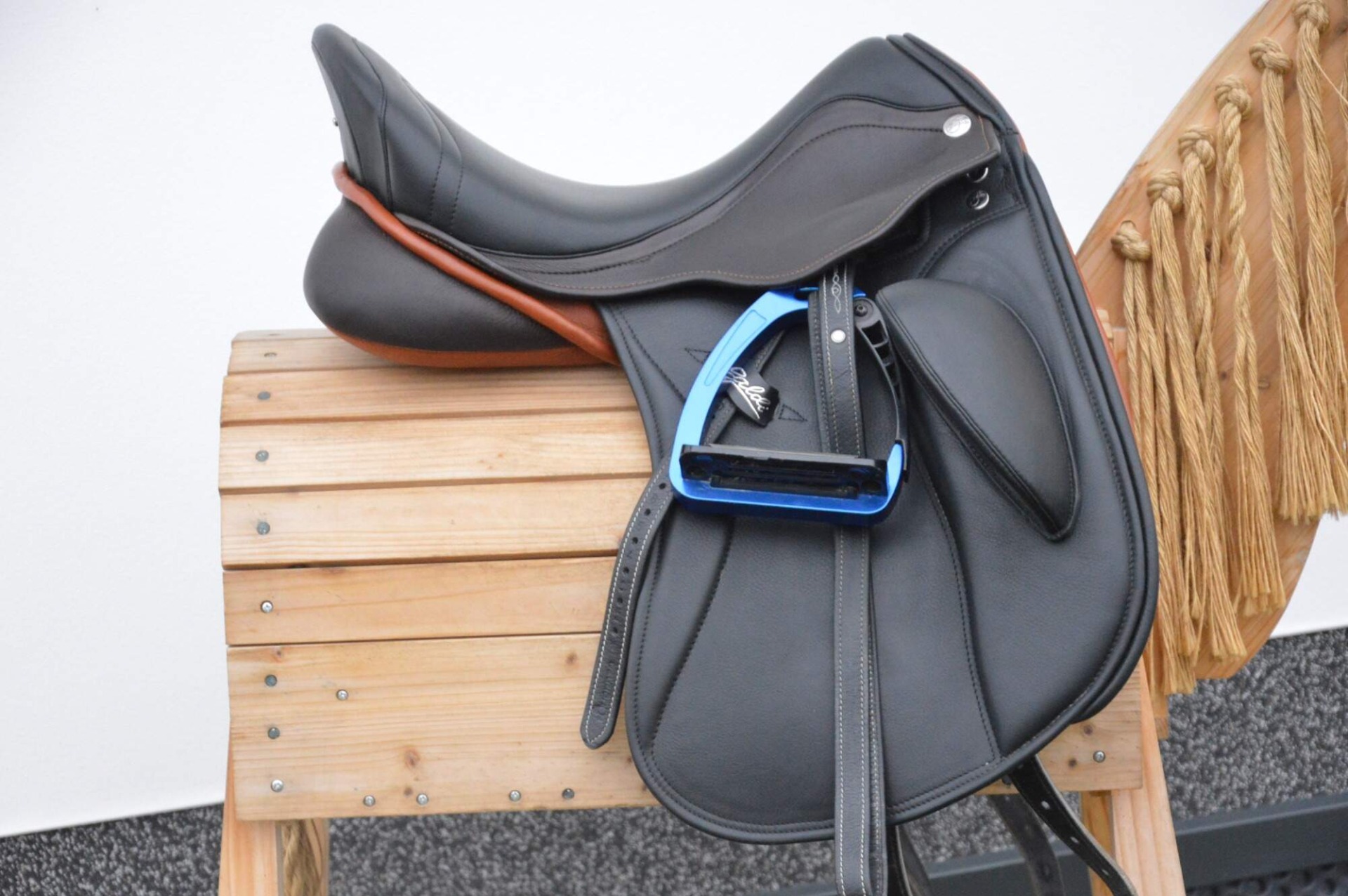 Drezurní sedlo Zaldi San Jorge s posedlí 17,5" a komorou 3 (16 cm), ideální pro hřbet s kohoutkem. Sedlo je vyrobeno z evropské přírodní kůže, speciální pružné, elastické a odolné. Má ergonomický panel, který dokonale zapadá do hřbetu koně a umožňuje mu úplnou volnost pohybu. Má velmi hluboké a pohodlné latexové posedlí, ergonomickou drezurní bočnici s dvojitým polstrováním, velmi výraznou anatomickou kolenní opěrkou - TM system. Opěrku je možné různě polohovat dle sedu jezdce, může se i otočit či jednoduše vyměnit za klasickou podlouhlou. Vše velmi snadno pomocí imbusu - k sedlu je přehledná příručka, náhradní opěrky, šablona i imbus. Sedlo neklouže, výborně vede sed a zároveň nechává pohybu volnost. V pracovních klusech jezdce výborně drží, v lehkých dovolí vysedat jen do správné výšky. Prakticky z něj nelze vypadnout, je tedy i ideální pro problémové koně, na kterých jezdec potřebuje velkou oporu v sedu. Sedlo smíšené polštáře - voděodolná vlna proti potu a gumový latex pro vyvážení zad koně. Třmenové zámky z nerezové oceli se sklonem 15%. Řemeny na podbřišník mají systém "V", který upevňuje sedlo rovnoměrně podél hřbetu koně. Sedlo je v top stavu, minimálně používané.