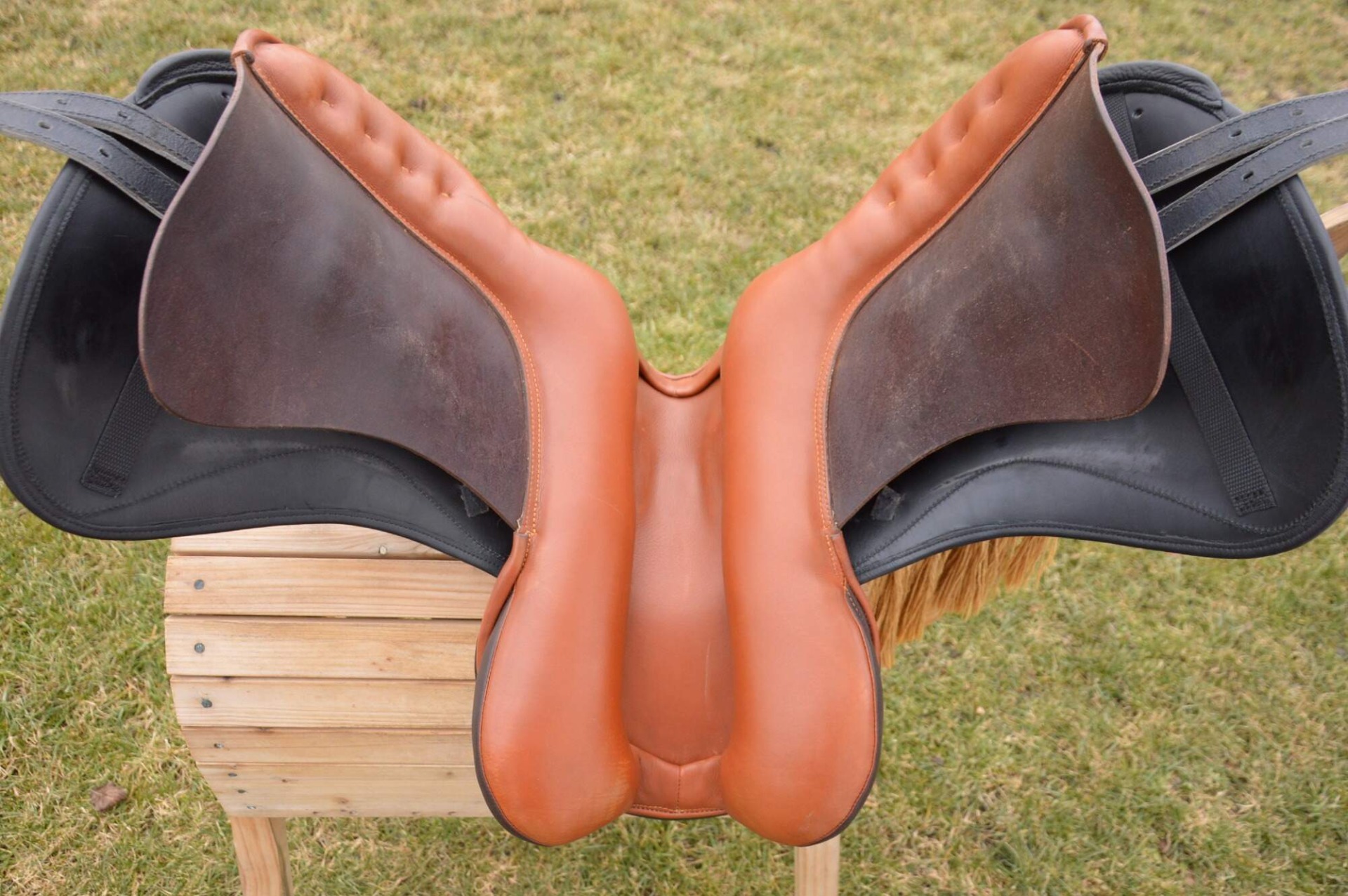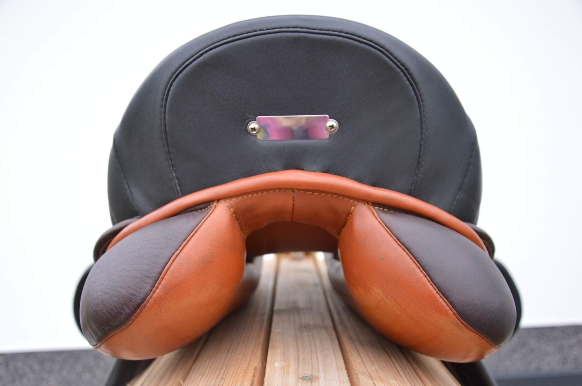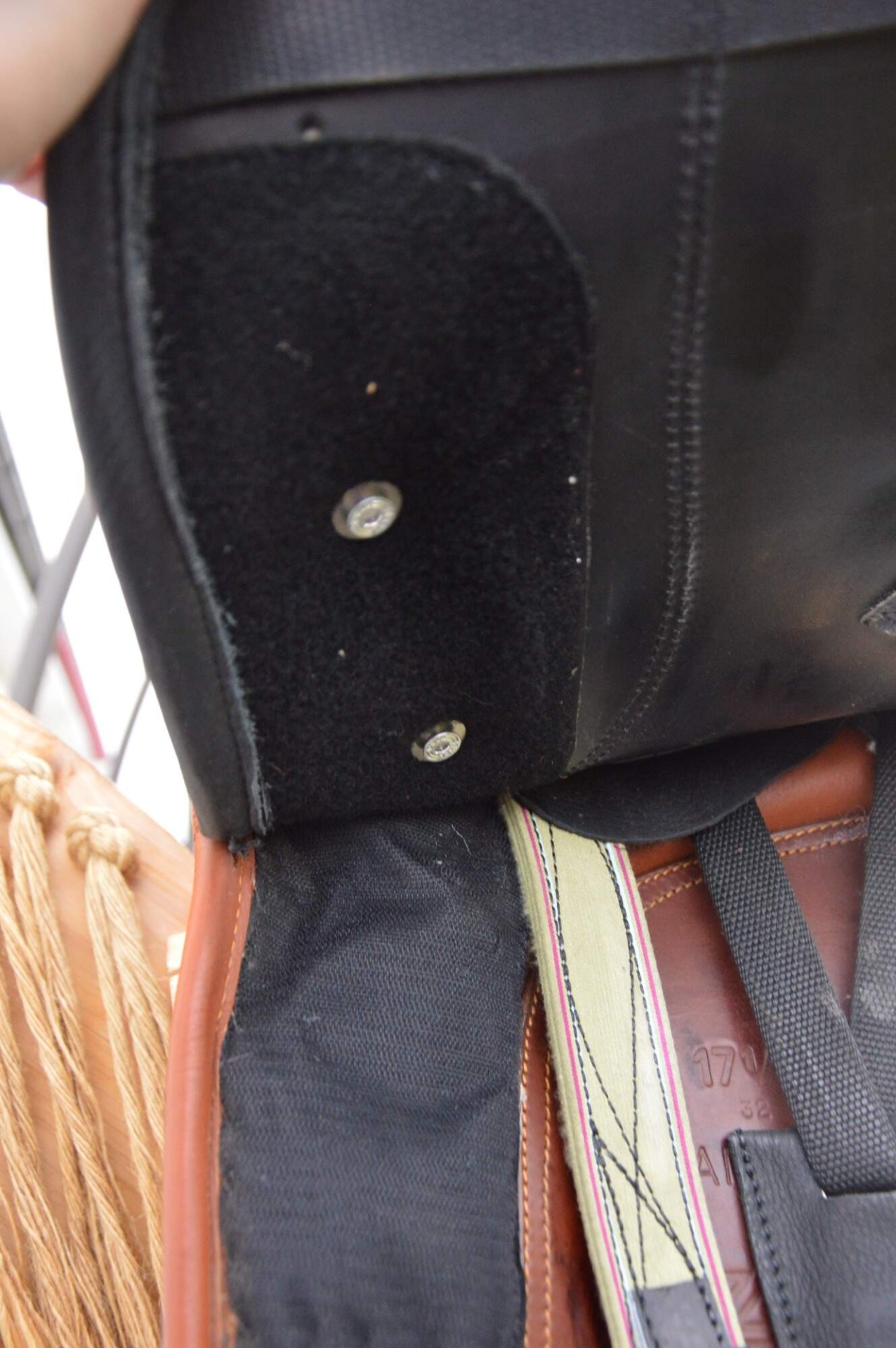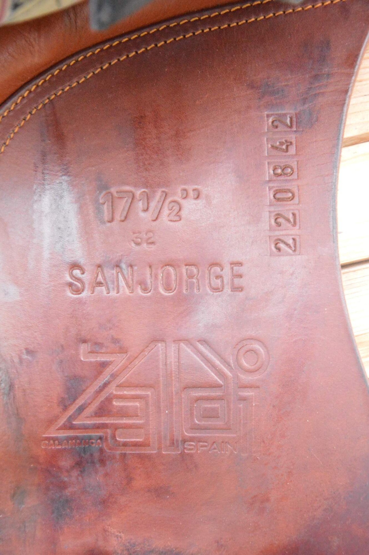 Drezurní sedlo Zaldi San Jorge s posedlí 17,5" a komorou 3 (16 cm), ideální pro hřbet s kohoutkem. Sedlo je vyrobeno z evropské přírodní kůže, speciální pružné, elastické a odolné. Má ergonomický panel, který dokonale zapadá do hřbetu koně a umožňuje mu úplnou volnost pohybu. Má velmi hluboké a pohodlné latexové posedlí, ergonomickou drezurní bočnici s dvojitým polstrováním, velmi výraznou anatomickou kolenní opěrkou - TM system. Opěrku je možné různě polohovat dle sedu jezdce, může se i otočit či jednoduše vyměnit za klasickou podlouhlou. Vše velmi snadno pomocí imbusu - k sedlu je přehledná příručka, náhradní opěrky, šablona i imbus. Sedlo neklouže, výborně vede sed a zároveň nechává pohybu volnost. V pracovních klusech jezdce výborně drží, v lehkých dovolí vysedat jen do správné výšky. Prakticky z něj nelze vypadnout, je tedy i ideální pro problémové koně, na kterých jezdec potřebuje velkou oporu v sedu. Sedlo smíšené polštáře - voděodolná vlna proti potu a gumový latex pro vyvážení zad koně. Třmenové zámky z nerezové oceli se sklonem 15%. Řemeny na podbřišník mají systém "V", který upevňuje sedlo rovnoměrně podél hřbetu koně. Sedlo je v top stavu, minimálně používané.