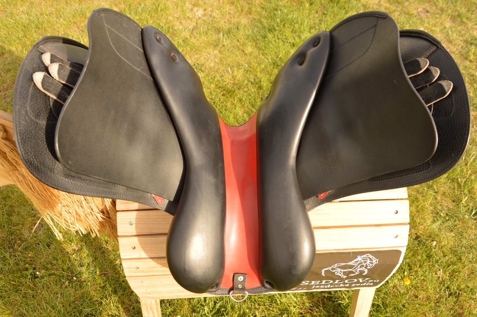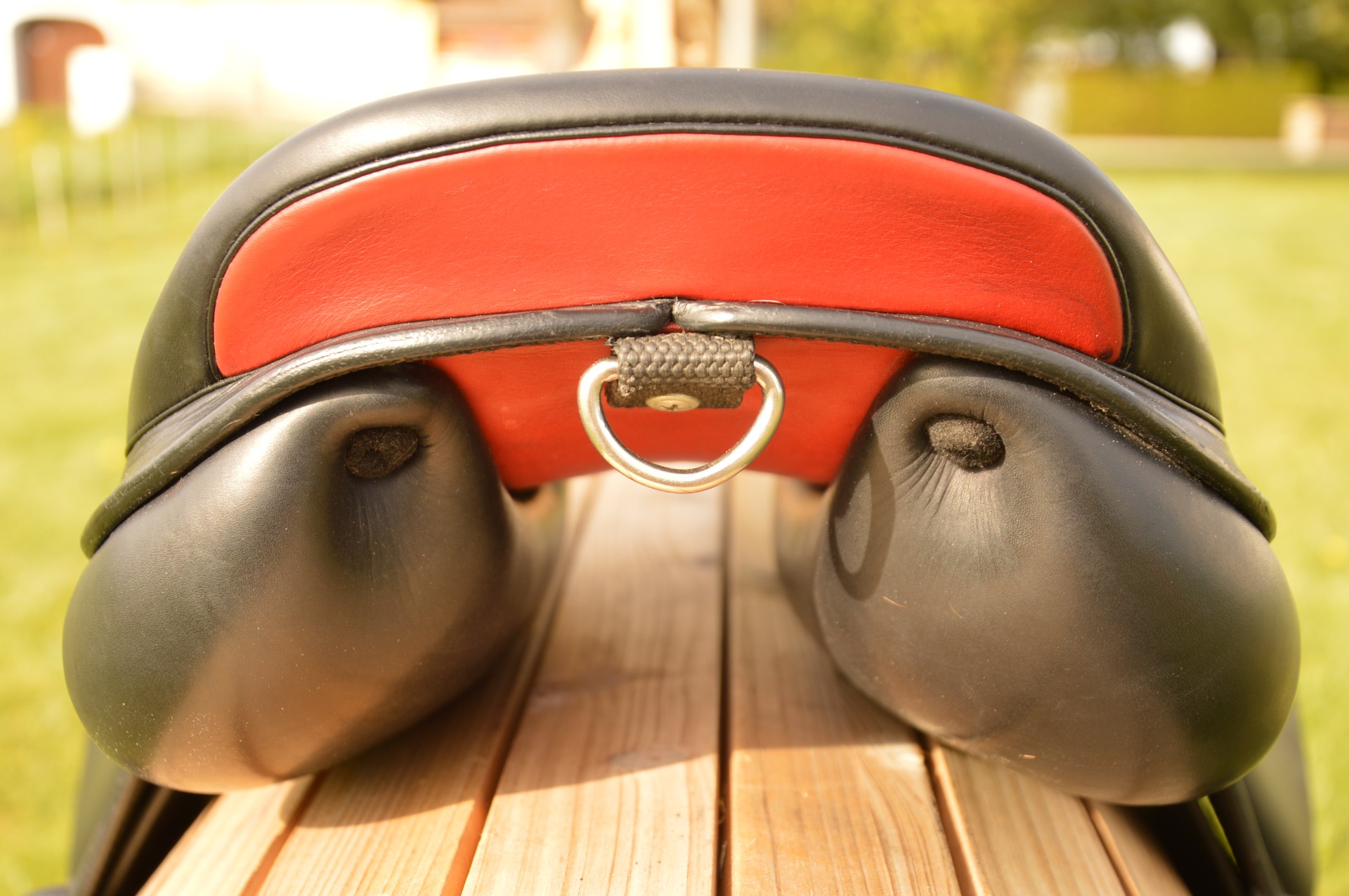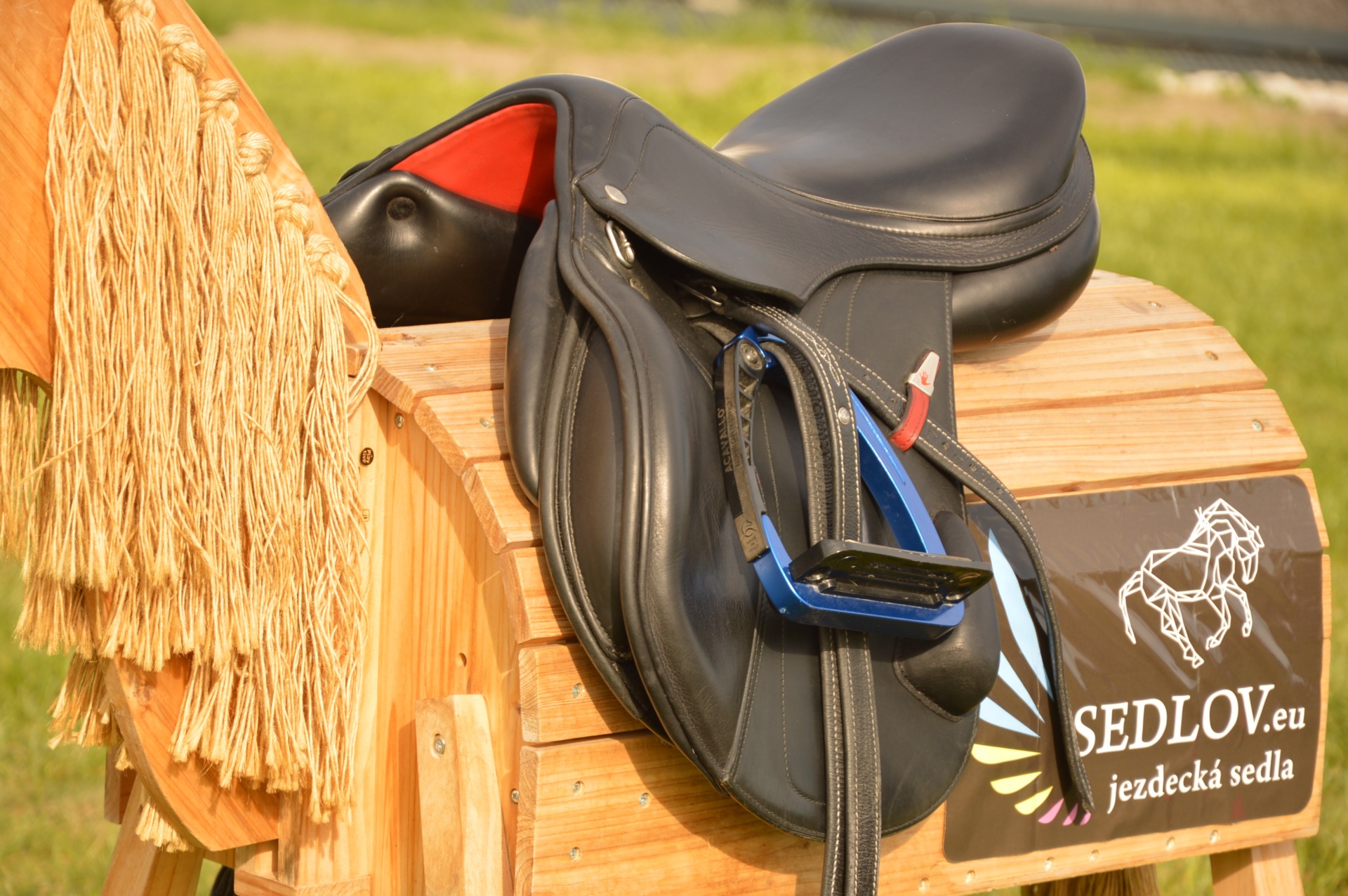 Luxusní dětské skokové sedlo Equipe Theoreme Rarity Grip s posedlím 14,5" a komorou 3 (14cm). Černé sedlo s červeným podšitím a očkem na řemen (klasická červená, foto může trochu mást).