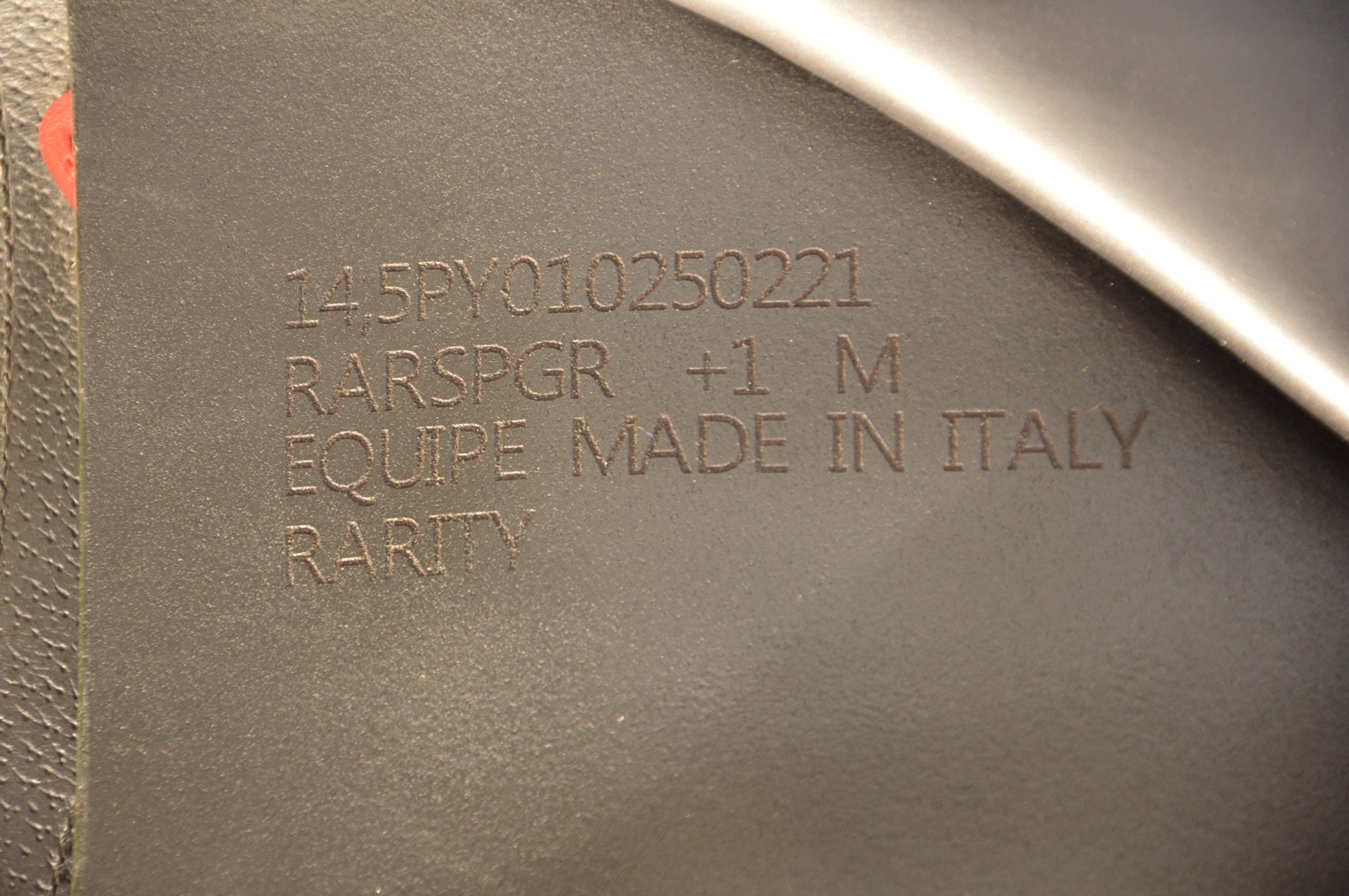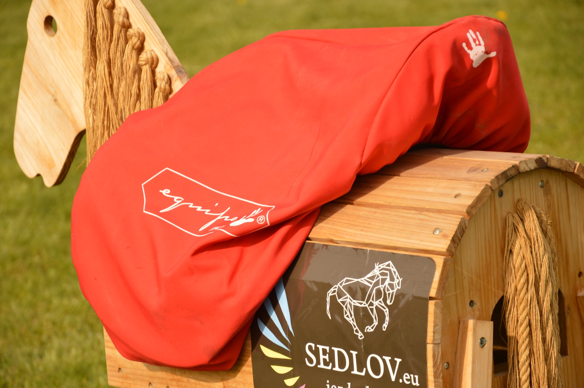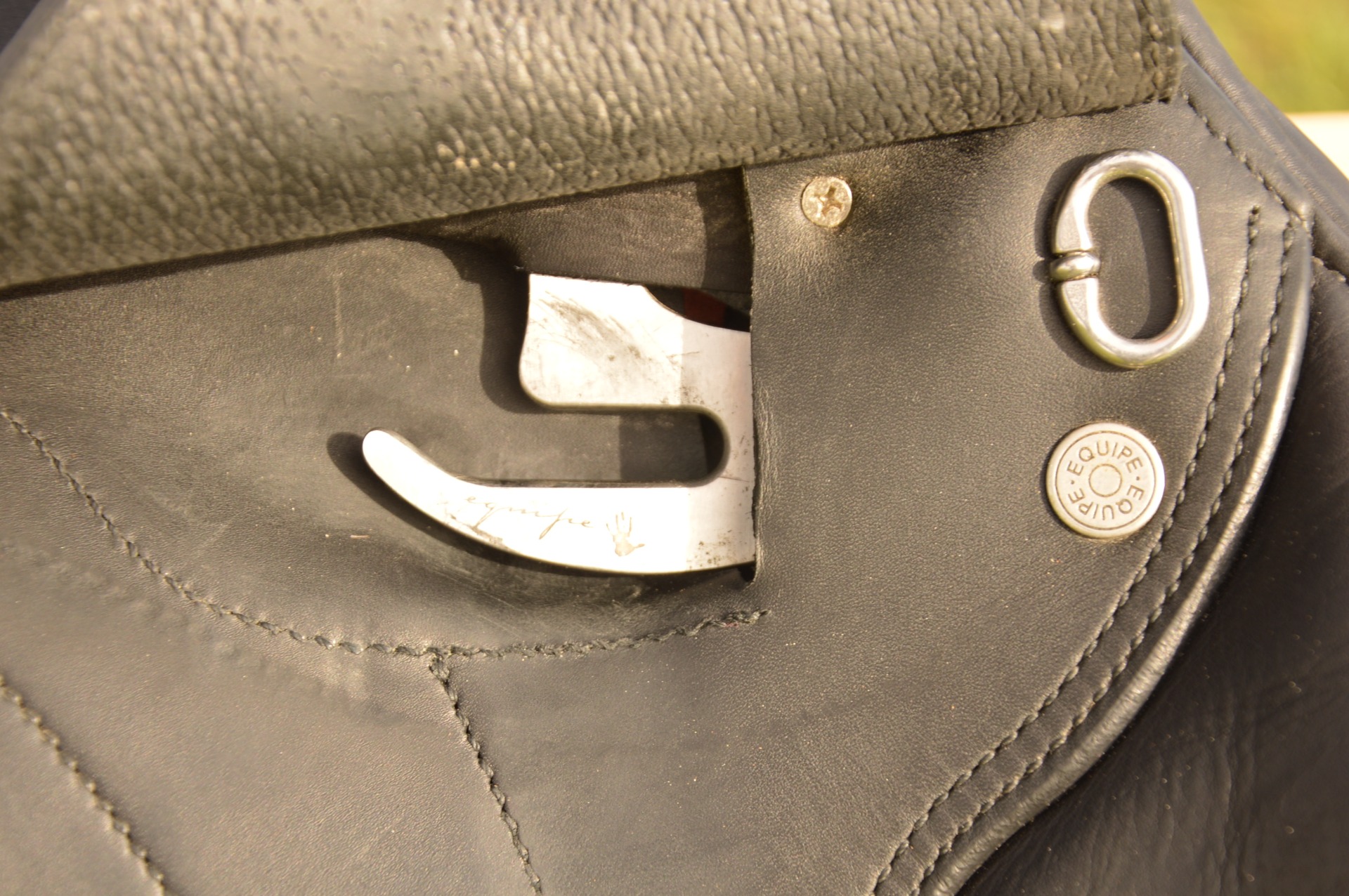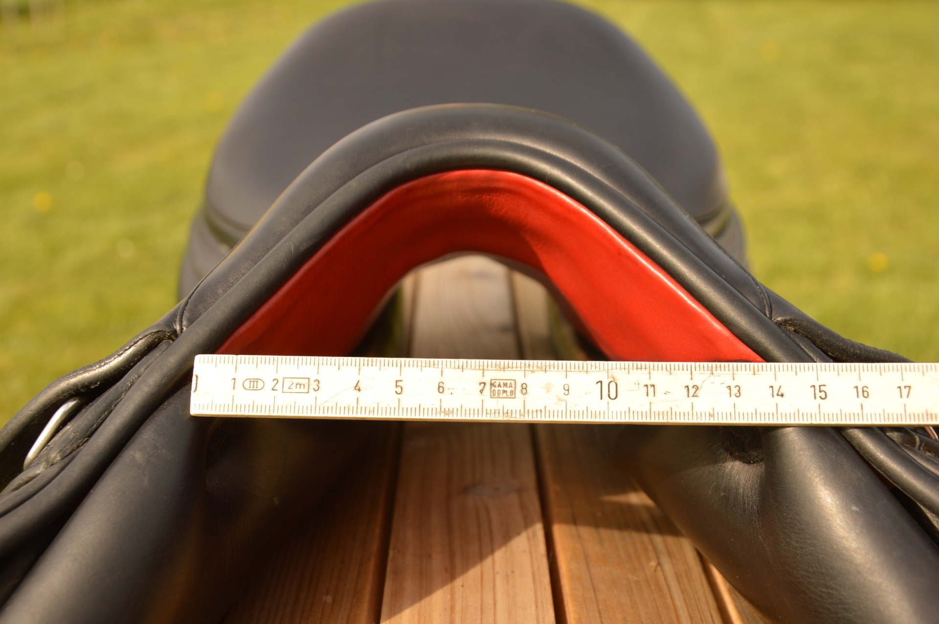 Luxusní dětské skokové sedlo Equipe Theoreme Rarity Grip s posedlím 14,5" a komorou 3 (14cm). Černé sedlo s červeným podšitím a očkem na řemen (klasická červená, foto může trochu mást).