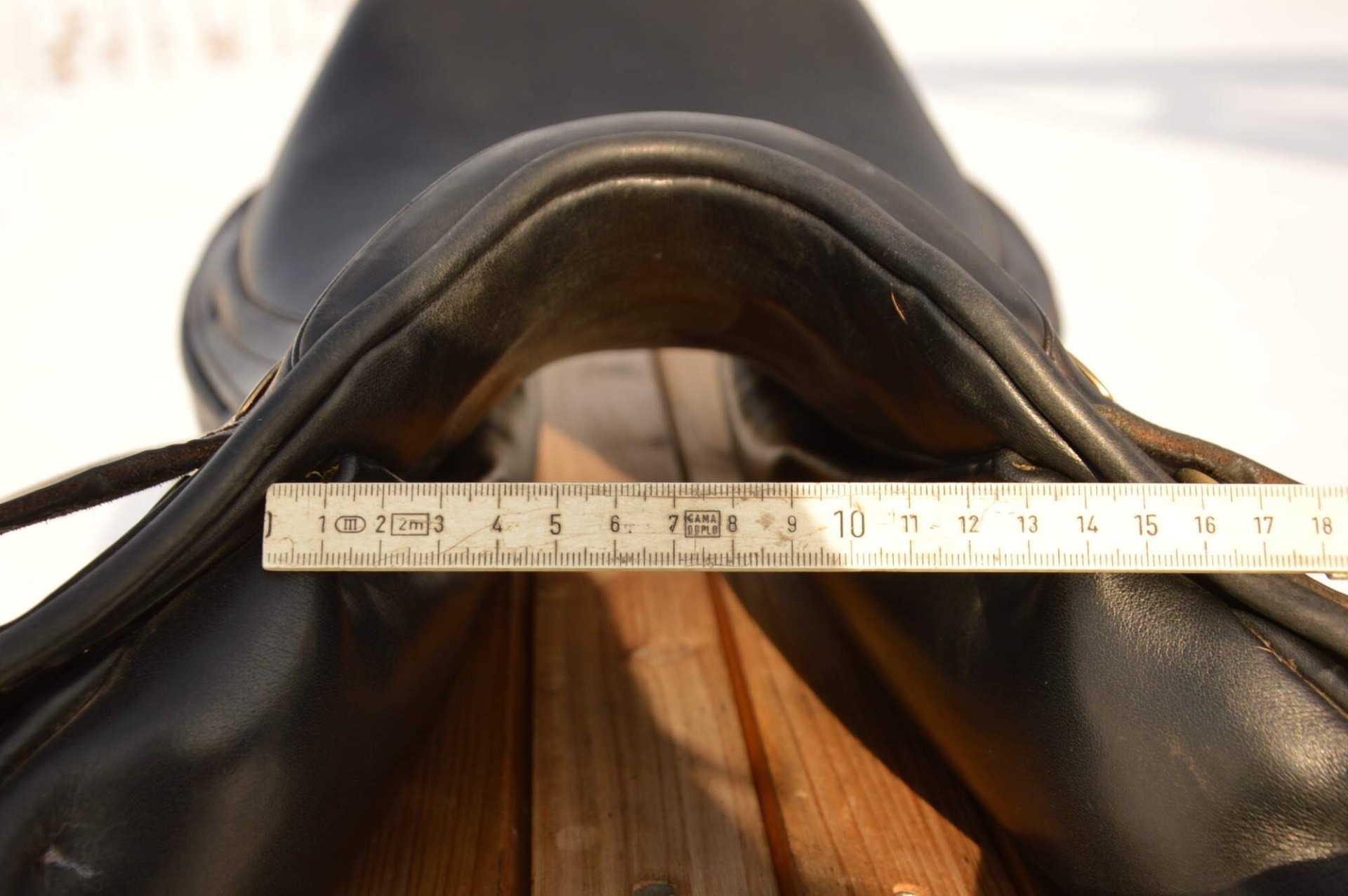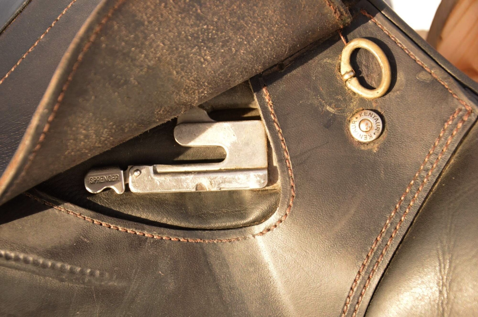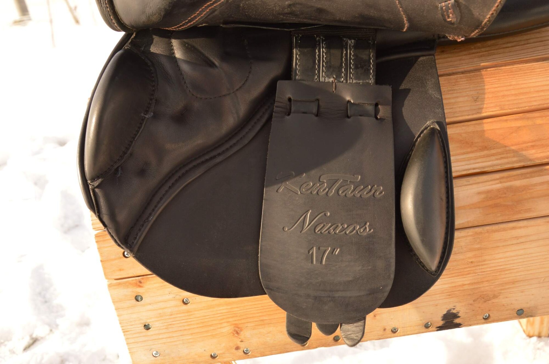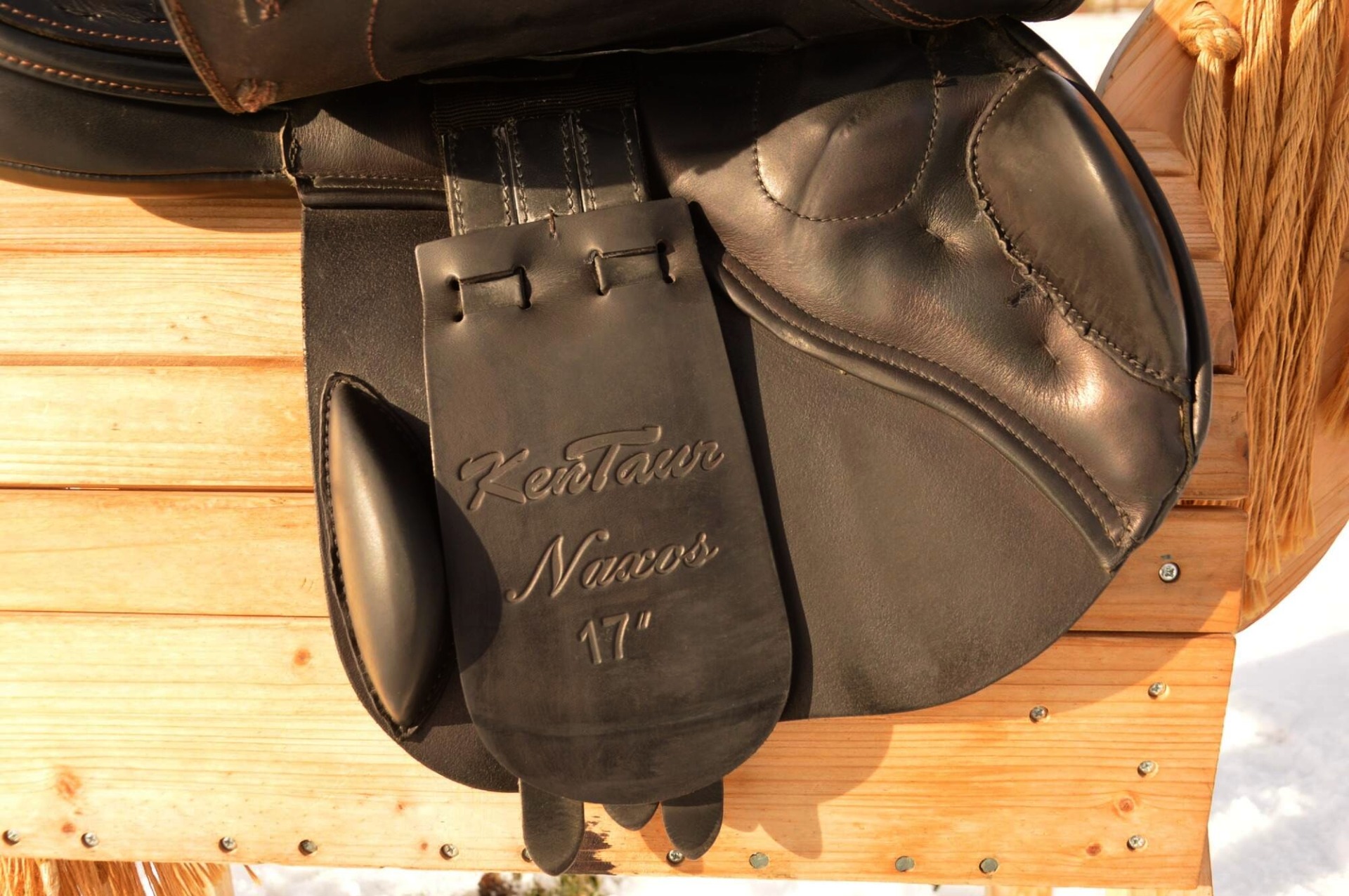 Zánovní skokové sedlo KenTaur Naxos s hnědým přišíváním a dvojitou kůží. Posedlí 17,", komora psaná 3 (14 cm), úprava pro volný pohyb lopatky. Sedlo je postaveno na středně hluboké kostře a komfortním vlněném polštáři s dobrou možností individuálního dotvarování na koně. Sedlový polštář končí hned pod přední opěrkou, což zajišťuje výborný kontakt stehna i kolena jezdce s koněm. Střední opěrky s anatomicky předtvarovanou bočnicí. Posedlí a opěrky jsou vyrobeny z neklouzavé teletiny. Sedlo je v super stavu s minimálními známkami používání. Rok výroby 2018.
