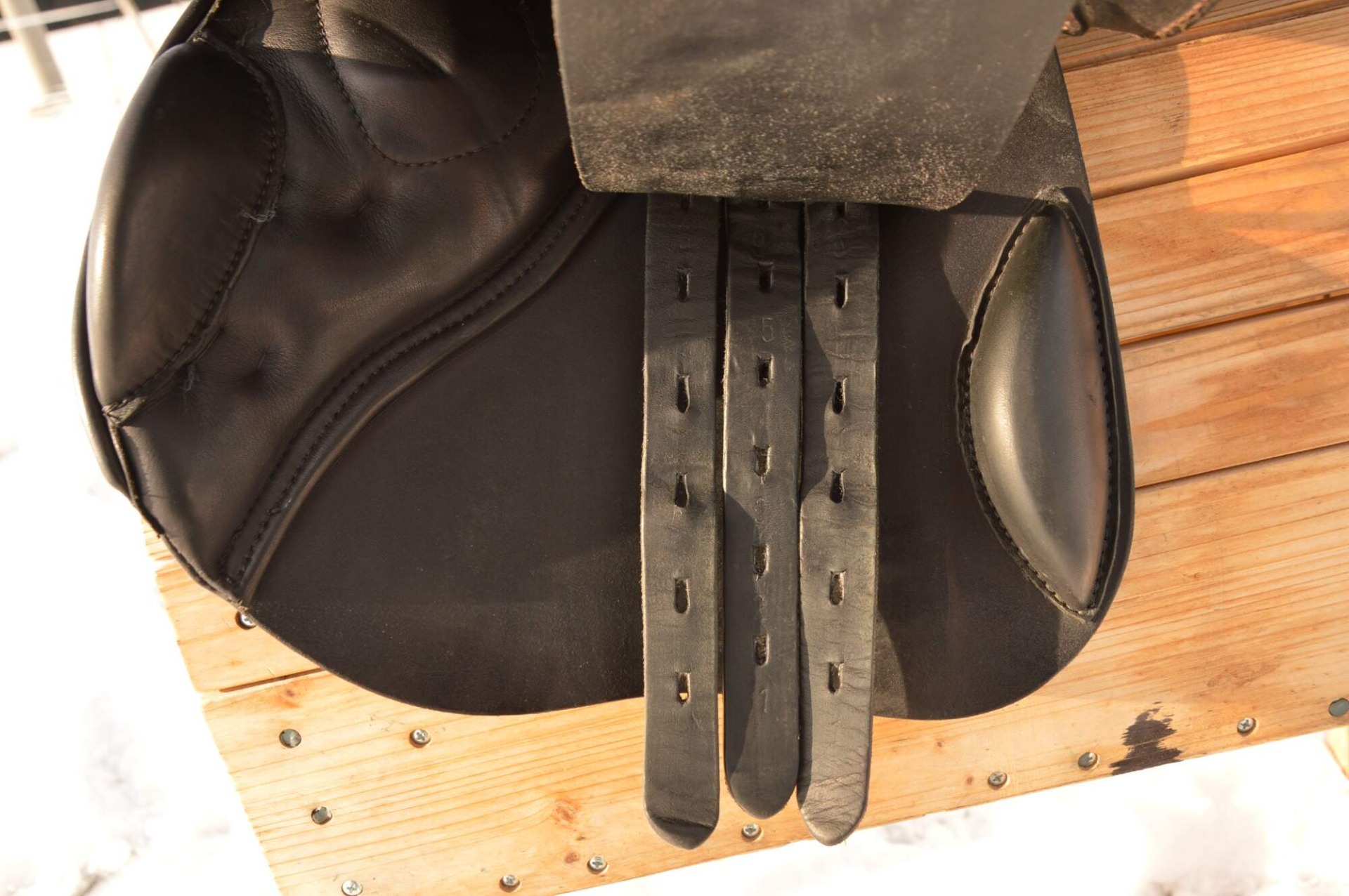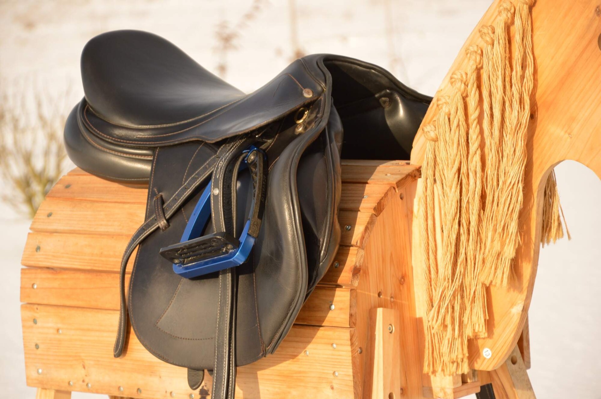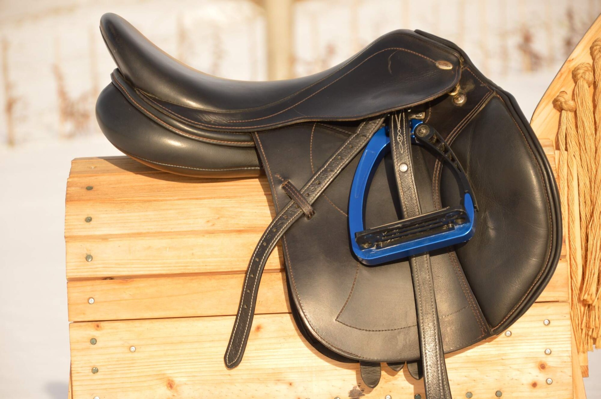 Zánovní skokové sedlo KenTaur Naxos s hnědým přišíváním a dvojitou kůží. Posedlí 17,", komora psaná 3 (14 cm), úprava pro volný pohyb lopatky. Sedlo je postaveno na středně hluboké kostře a komfortním vlněném polštáři s dobrou možností individuálního dotvarování na koně. Sedlový polštář končí hned pod přední opěrkou, což zajišťuje výborný kontakt stehna i kolena jezdce s koněm. Střední opěrky s anatomicky předtvarovanou bočnicí. Posedlí a opěrky jsou vyrobeny z neklouzavé teletiny. Sedlo je v super stavu s minimálními známkami používání. Rok výroby 2018.