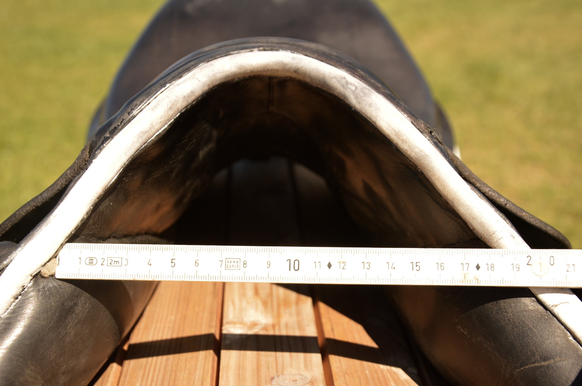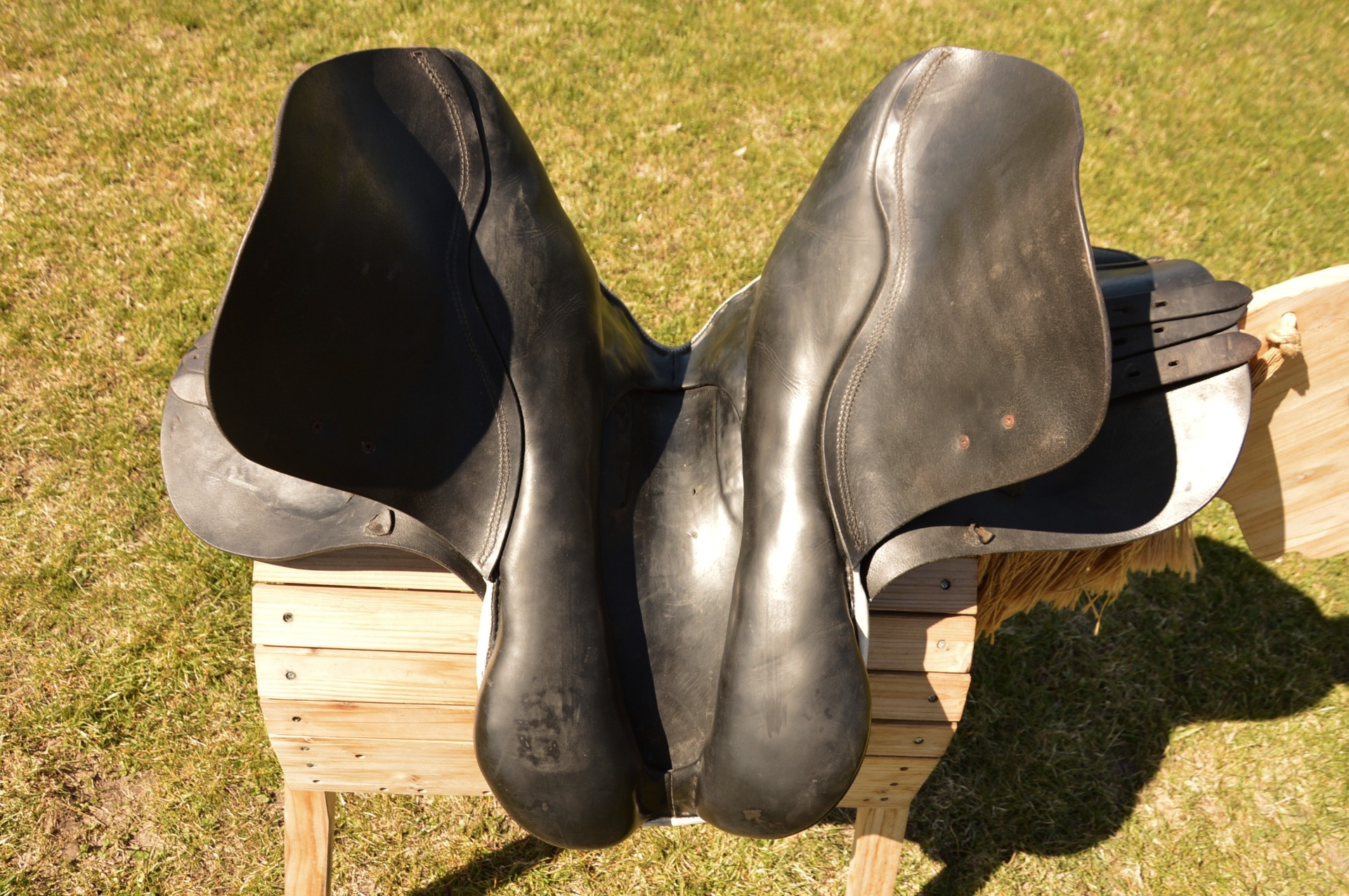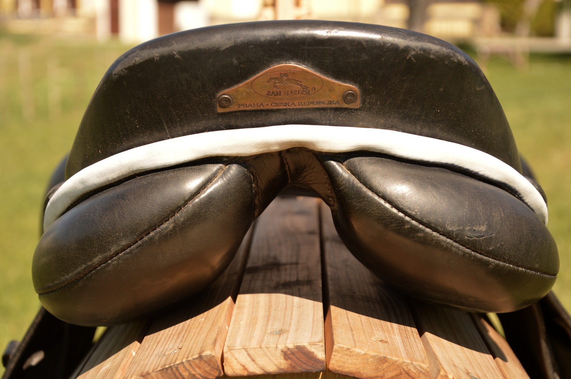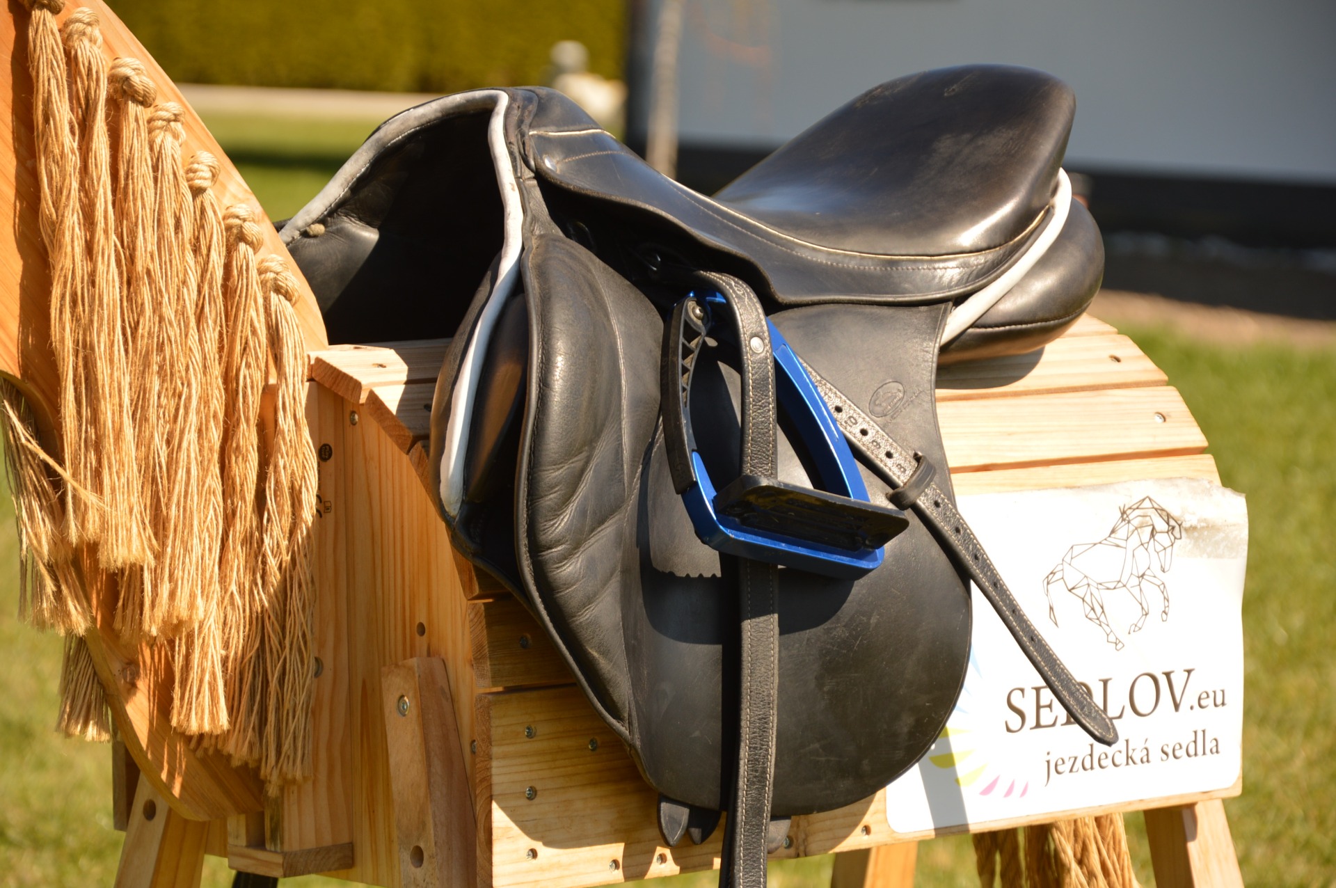 Kvalitní skokové sedlo Jan Hauzr, model George Springy v atraktivním hnědo černém provedení. Posedlí 17,5", komora širší 3 (16,5 cm), široký páteřní kanál, polootevřená komora. Má vyšší kolenní opěrky, vysoké holenní opěrky na vnější straně bočnice, středně hluboké posedlí. Postaveno na dřevěné kostře s kokovými výztuhami, je měkké, pohodlné. Perfektní jak do přírody tak na skoky. Sedlo je v dobrém stavu, běžné známky použití viz foto.