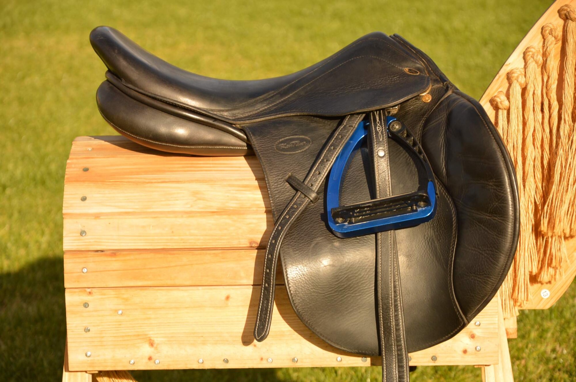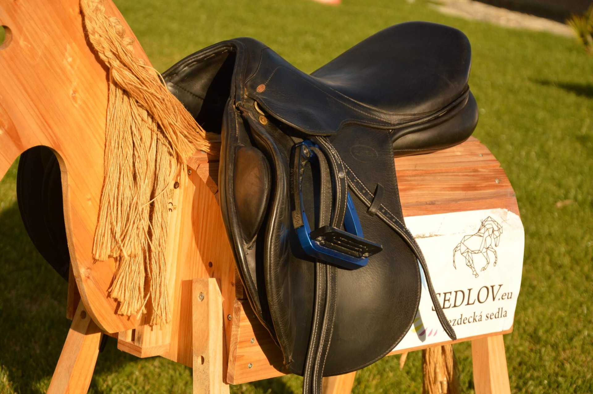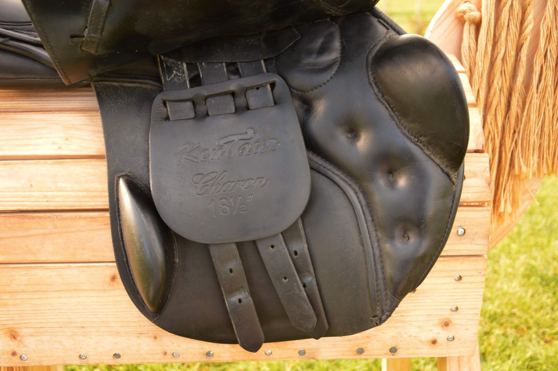 Skokové sedlo KenTaur Charon, posedlí velikosti 18,5" a komora 2 (14 cm). Nižší vlněné polštáře poskytují dobrý kontakt s koněm. Protiskluzová úprava, střední kolenní opěrky výborně podporují sed a dodávají jistotu jezdci nad skokem. Velice měkká a přilnavá kůže. Vhodné do aktivního sportu i pro rekreační jezdce. Velmi dobrý stav, běžné známky použití.