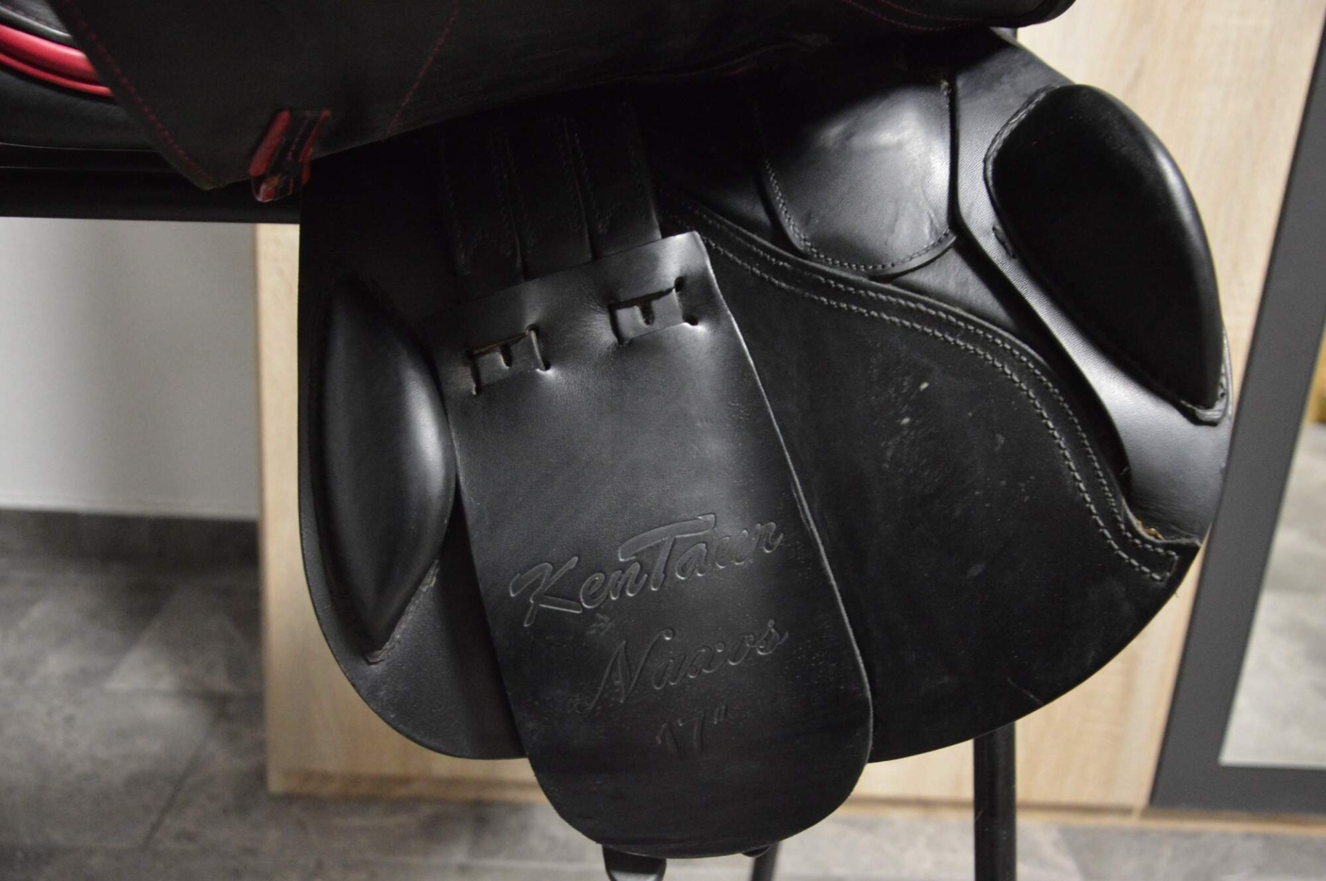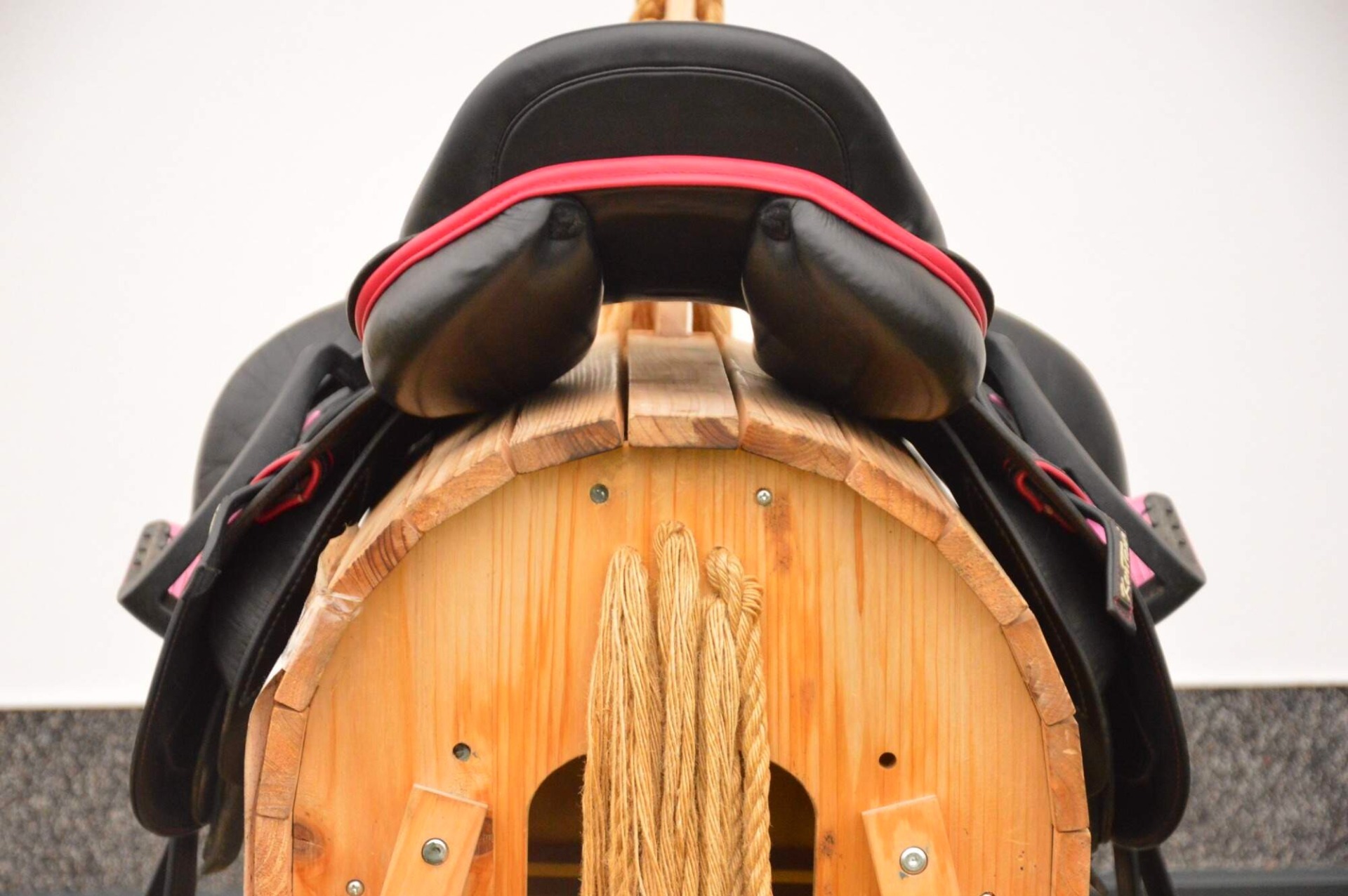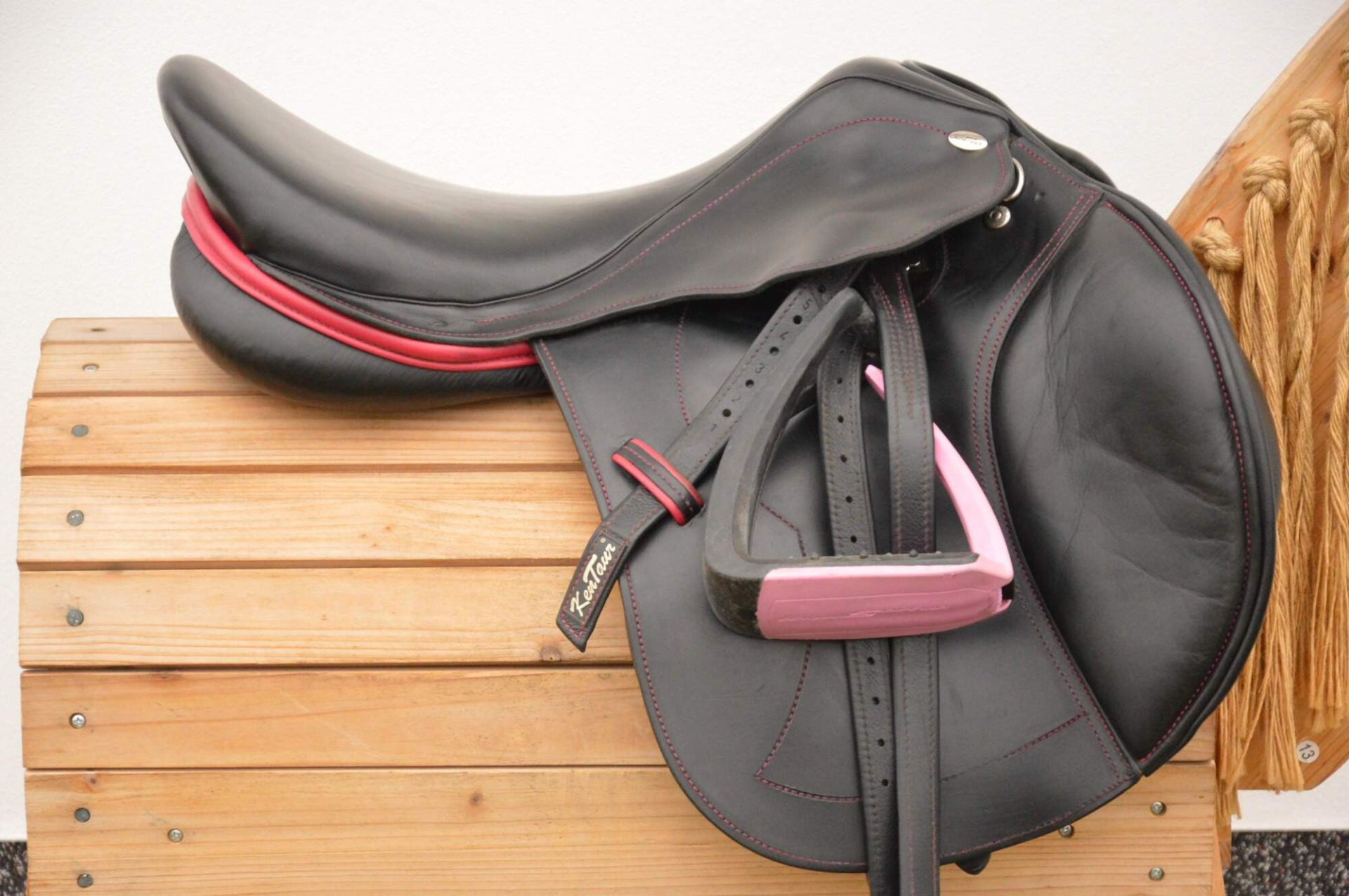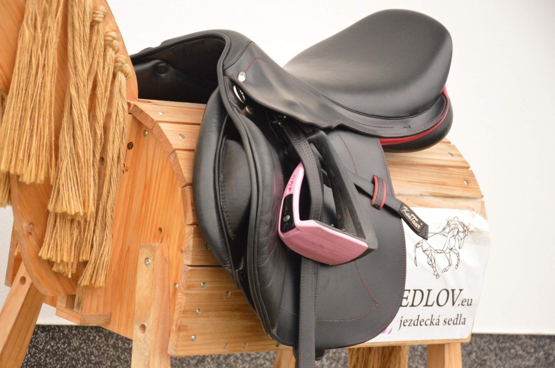Skokové sedlo KenTaur Naxos s růžovým přišíváním a colorline za zadní rozsochou + zdarma třmenové řemeny ve stejném provedení + v případě zájmu Freejump SoftUp v růžové barvě, velikost 10cm (+2500Kč). Posedlí 17", komora 4 (16 cm), polštáře respektující volný pohyb lopatky. Sedlo je postaveno na středně hluboké kostře a kontaktním latexovém polštáři končím hned pod přední opěrkou, což zajišťuje výborný kontakt stehna i kolena jezdce s koněm. Střední opěrky s anatomicky předtvarovanou bočnicí. Posedlí a opěrky jsou vyrobeny z neklouzavé teletiny. Sedlo je ve výborném stavu, rok výroby 2022.