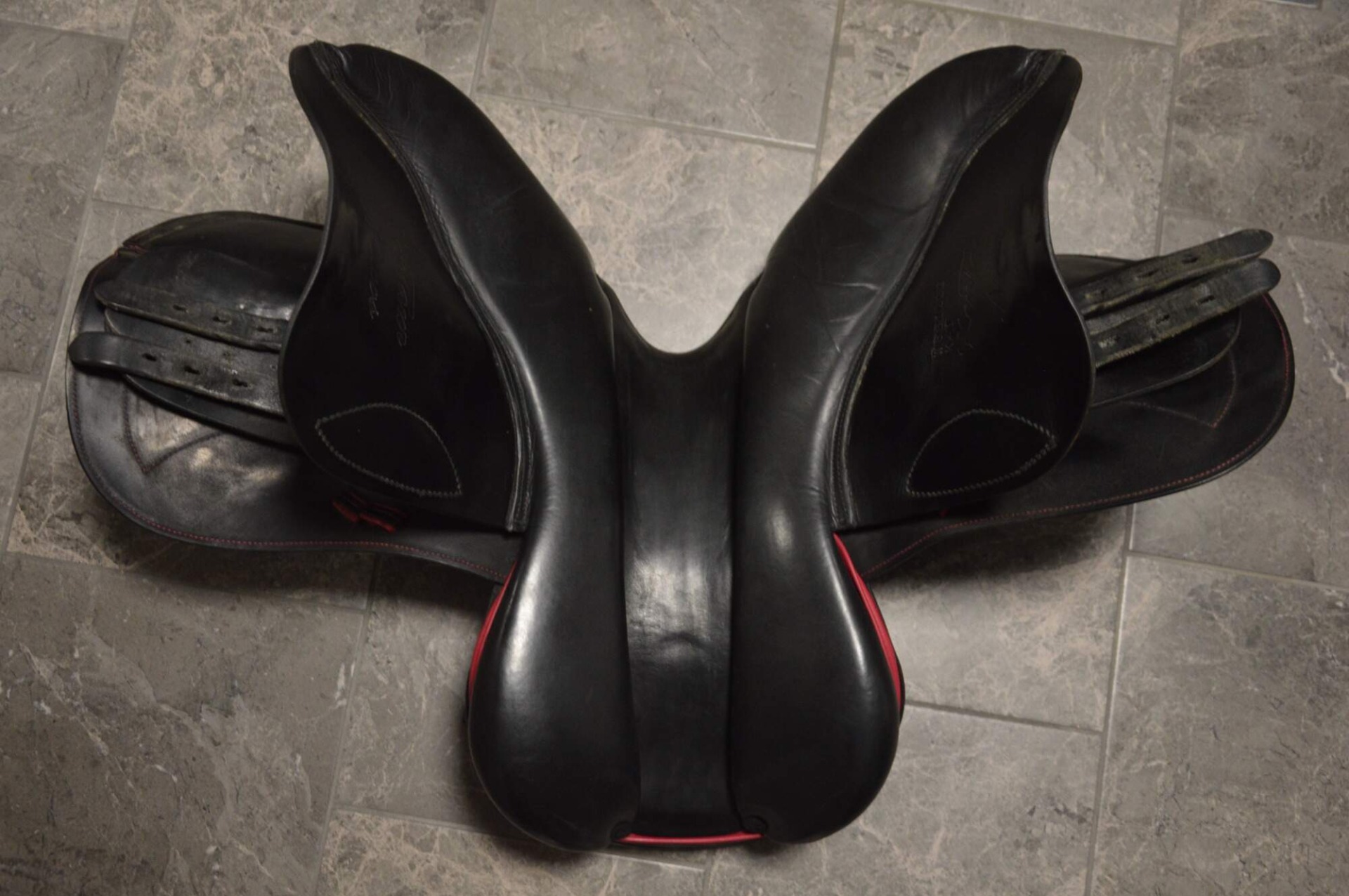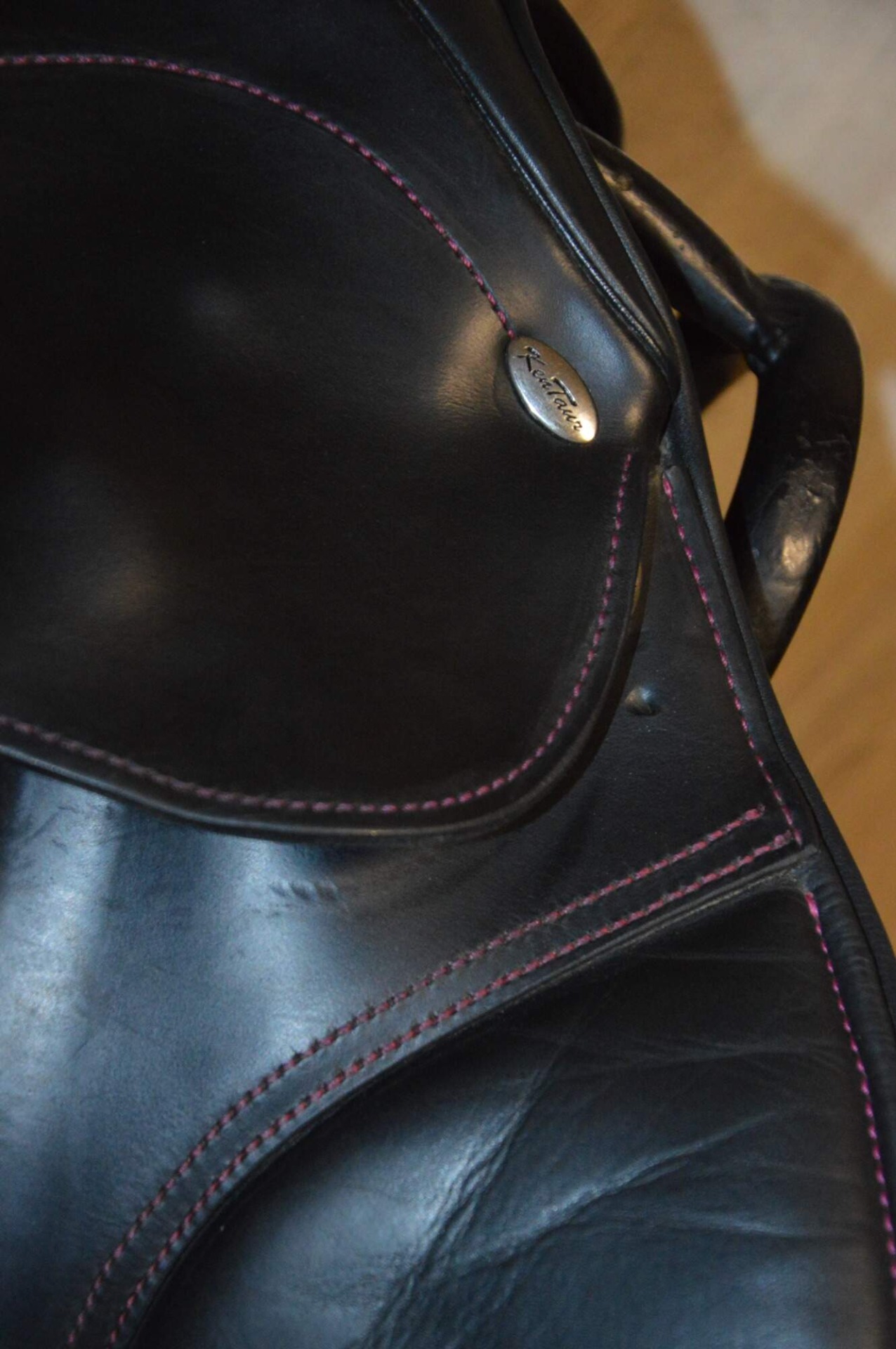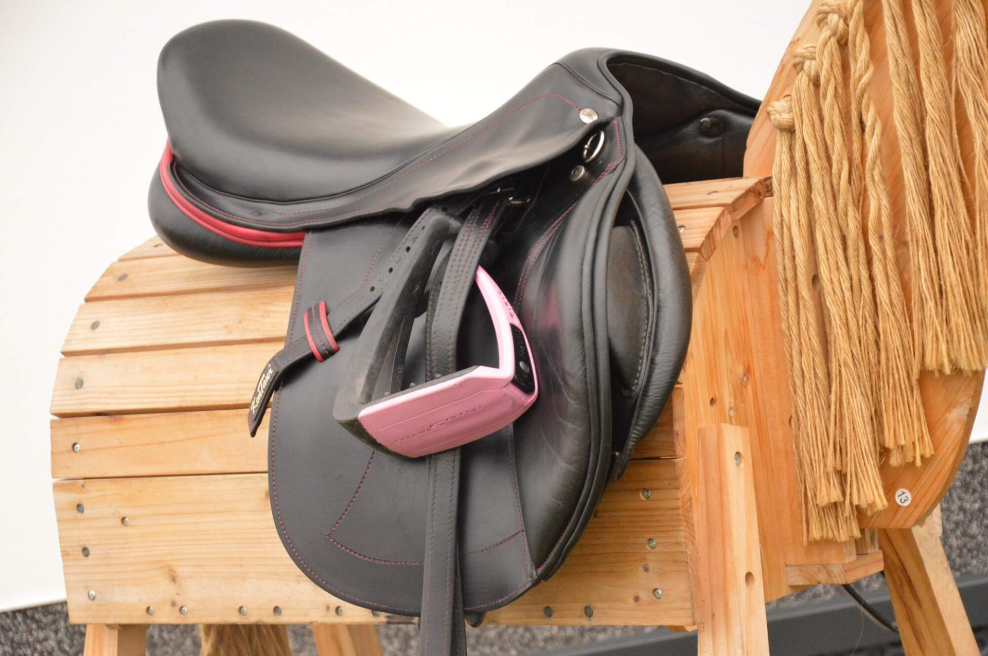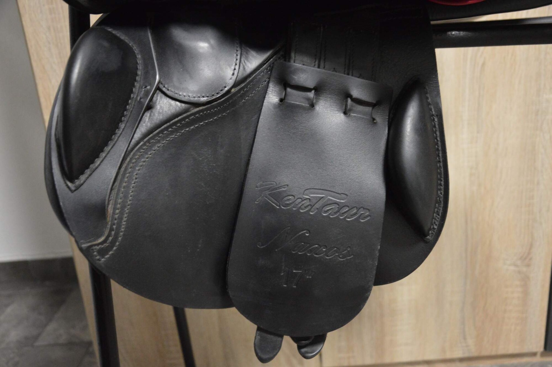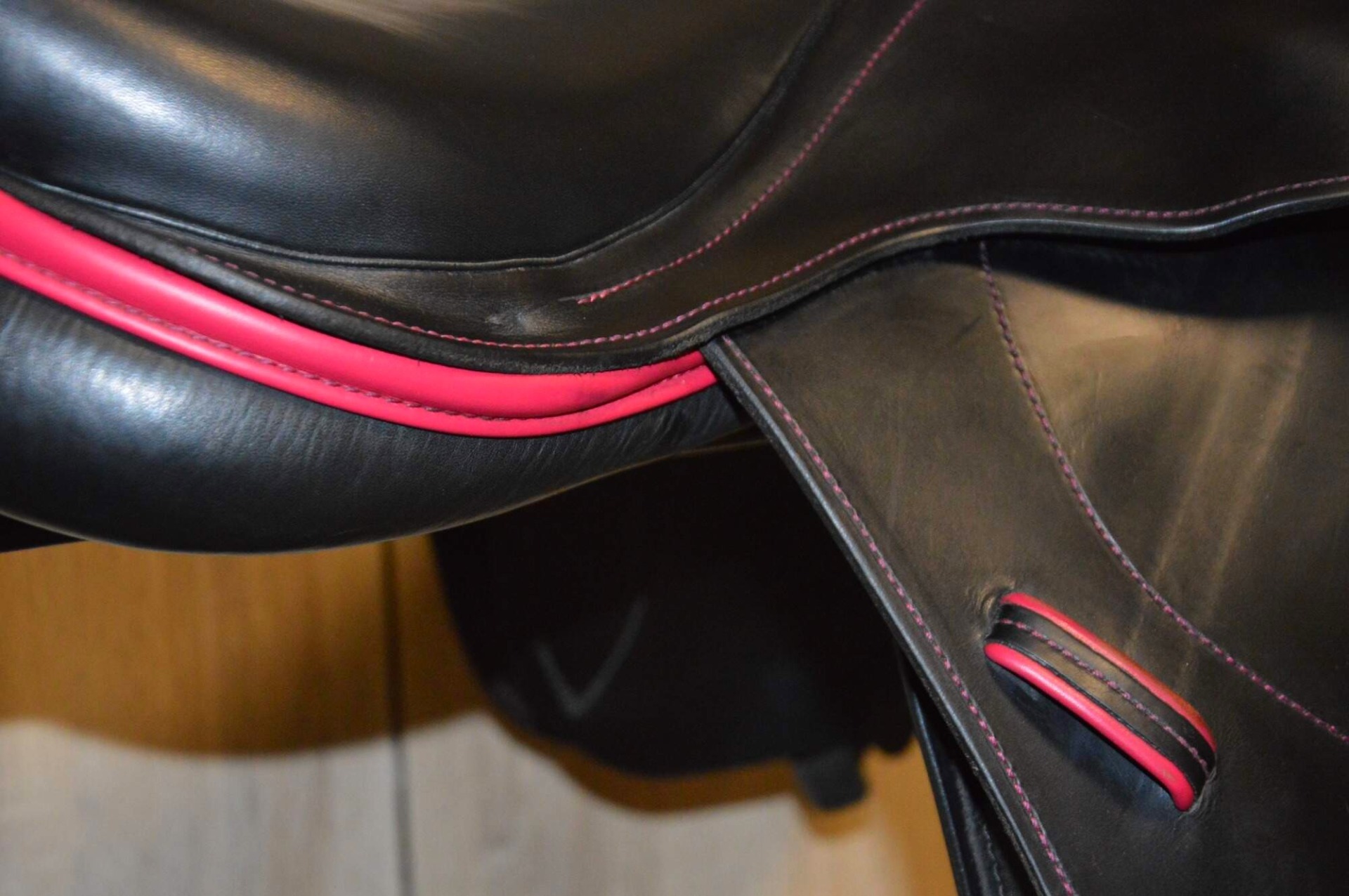 Skokové sedlo KenTaur Naxos s růžovým přišíváním a colorline za zadní rozsochou + zdarma třmenové řemeny ve stejném provedení + v případě zájmu Freejump SoftUp v růžové barvě, velikost 10cm (+2500Kč). Posedlí 17", komora 4 (16 cm), polštáře respektující volný pohyb lopatky. Sedlo je postaveno na středně hluboké kostře a kontaktním latexovém polštáři končím hned pod přední opěrkou, což zajišťuje výborný kontakt stehna i kolena jezdce s koněm. Střední opěrky s anatomicky předtvarovanou bočnicí. Posedlí a opěrky jsou vyrobeny z neklouzavé teletiny. Sedlo je ve výborném stavu, rok výroby 2022.