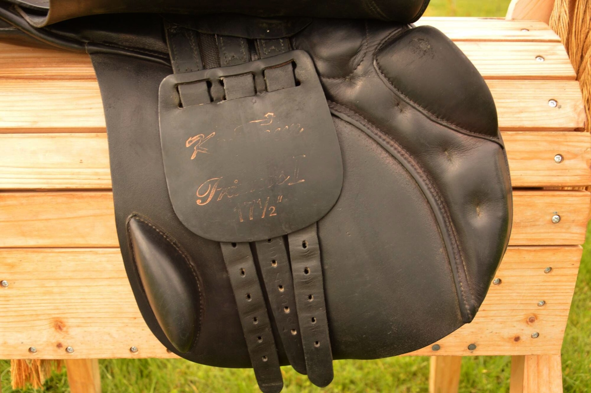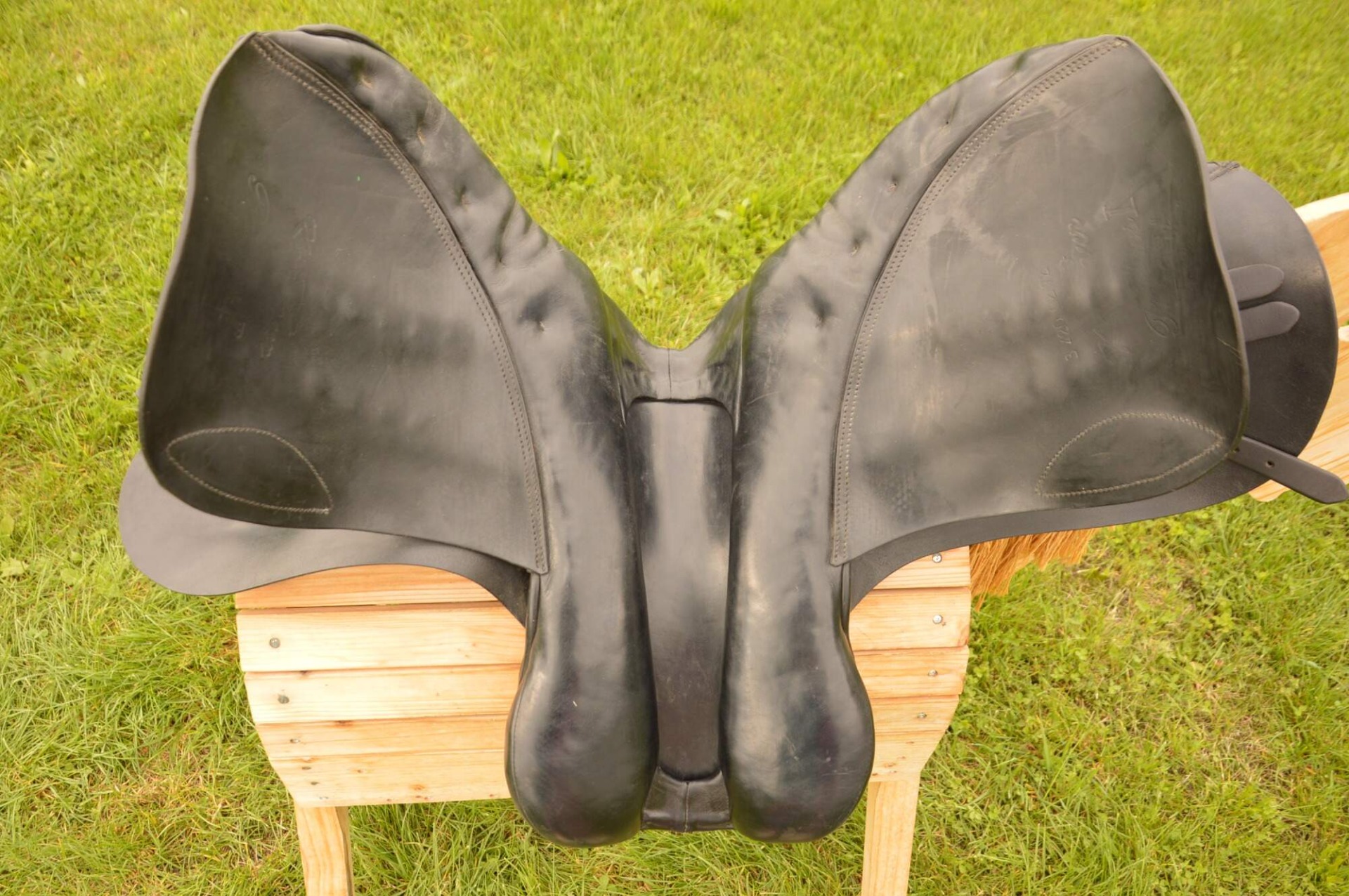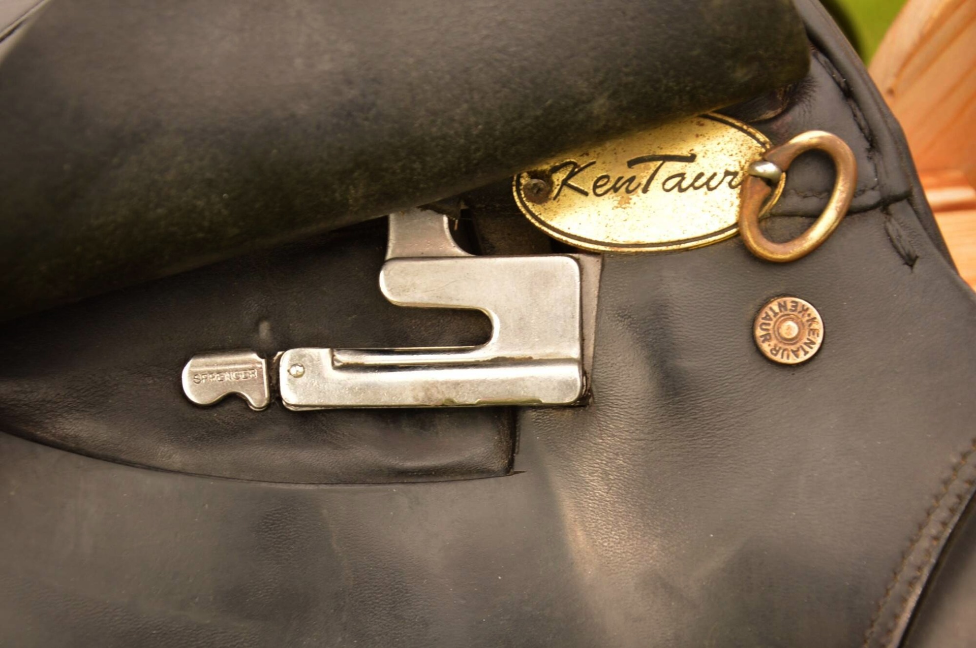 Skokové sedlo KenTaur Priamos, posedlí velikosti 17,5" a komora 3 (16 cm), díky nízkému polštáři ideální na široký hřbet. Sedlo se střední kolenní opěrkou, mělčím posedlím, výborně podporující sed a dodávající jistotu jezdci nad skokem. Velice kvalitní a přilnavá kůže. Vhodné do aktivního sportu i pro rekreační jezdce. Dobrý stav, běžné známky použití.
