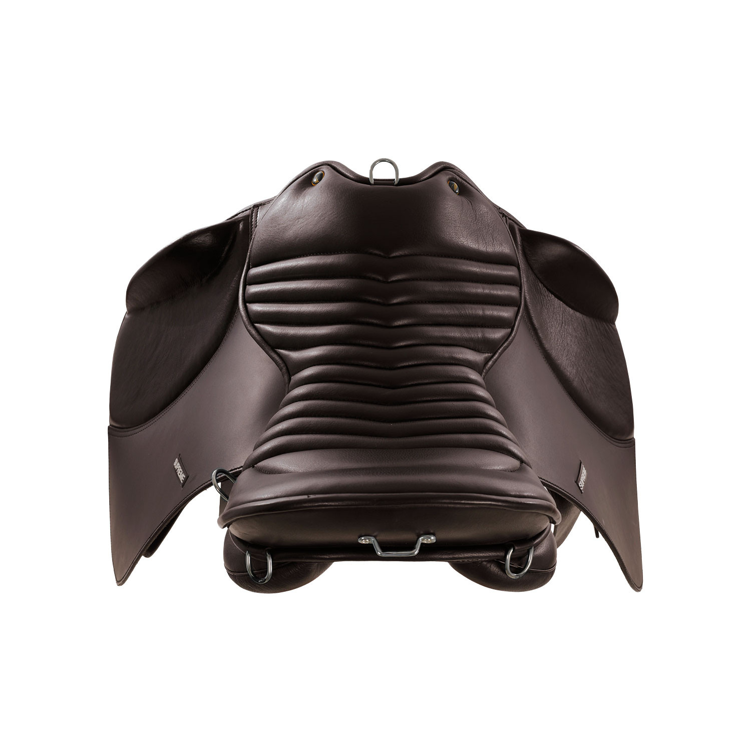 Hnědé kožené trekingové/vyjížďkové sedlo značky Supreme s měnitelnou komorou. Sedlo má velké opěrky, středně hluboké extra měkké posedlí a vlněné polštáře pro pohodlí koně.