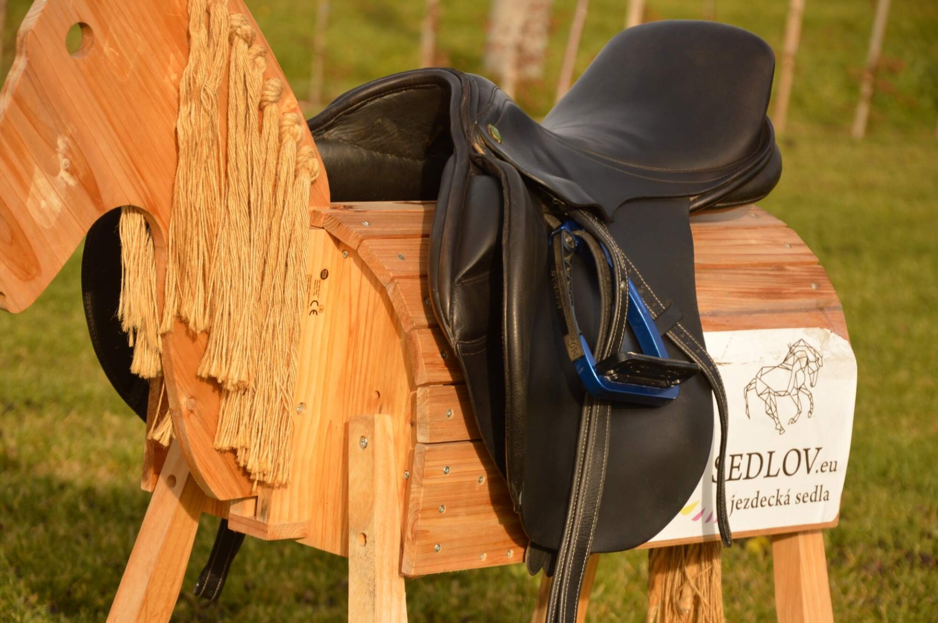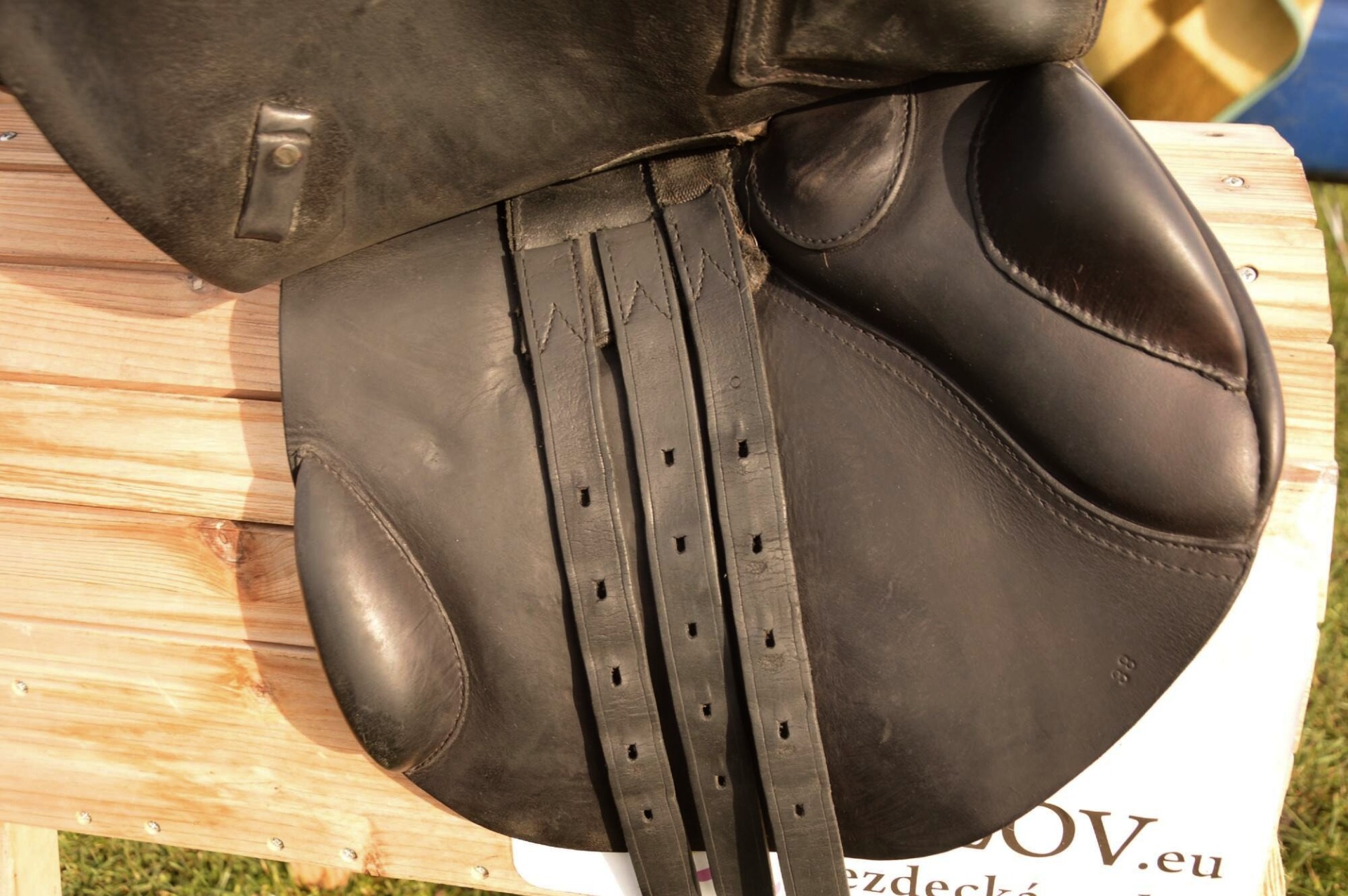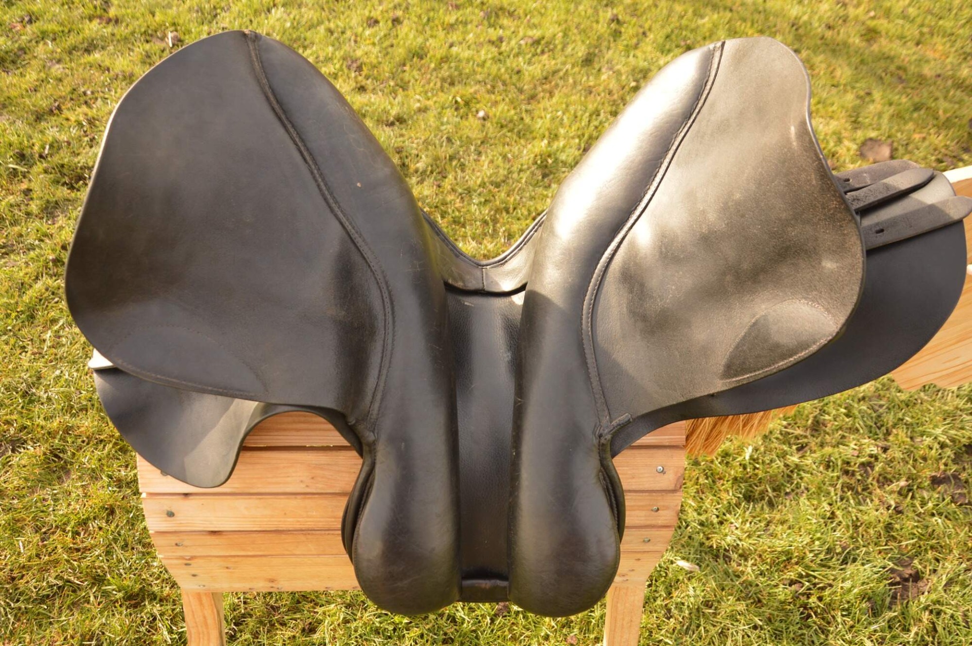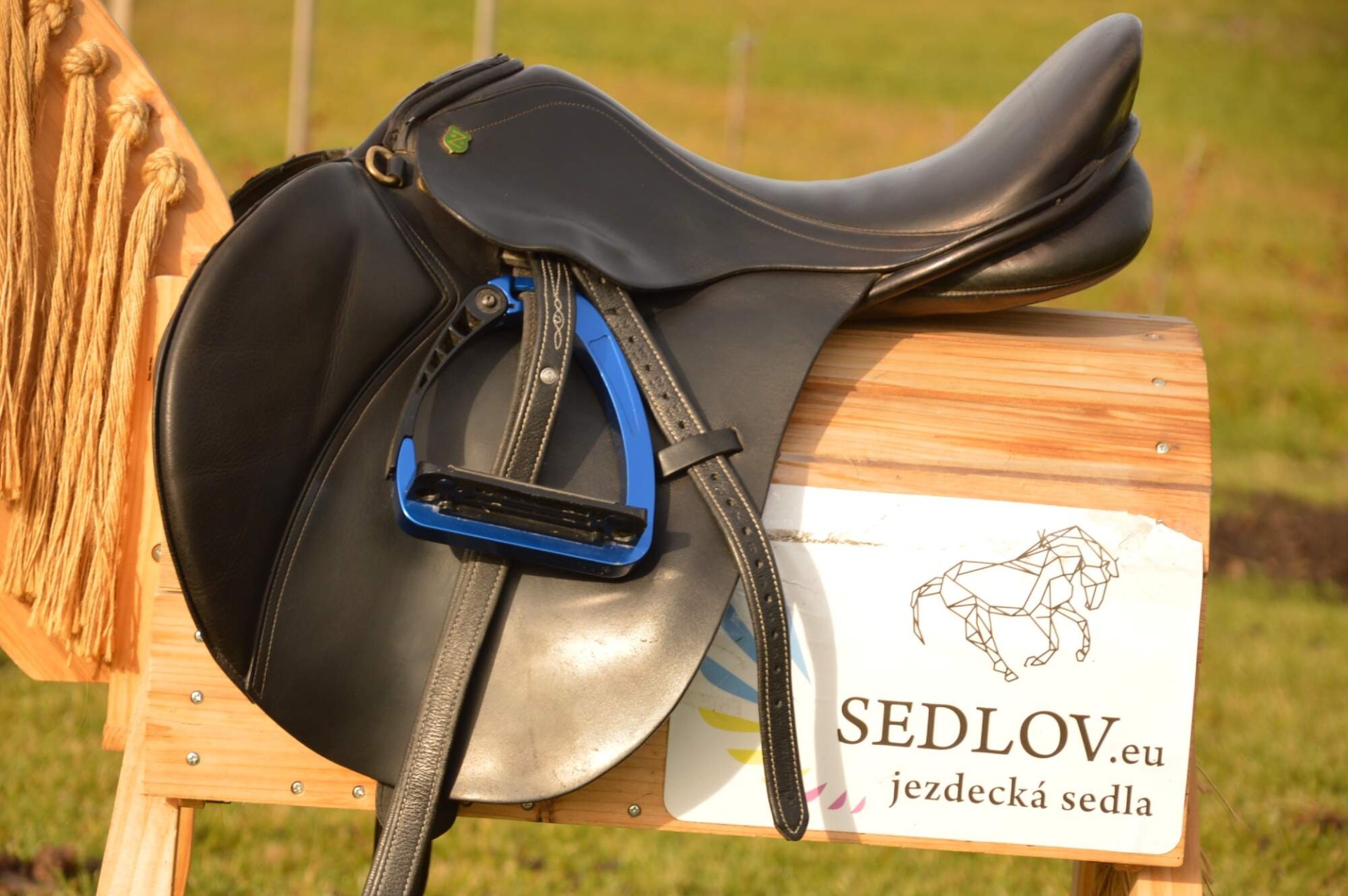 Skokově univerzální sedlo Greenfield Saddlery - Massimo. Posedlí 17,5", komora 4 (18 cm), ideální na hodně kulaté koně. Kožené kvalitní sedlo má střední kolenní opěrky, hlubší posedlí, je velmi měkké a pohodlné. Vlněné polštáře, dobře tlumí nárazy. Vhodné na vyjížďky, jízdárenskou práci i skoky. Sedlo je ve velmi dobrém stavu, plně funkční.