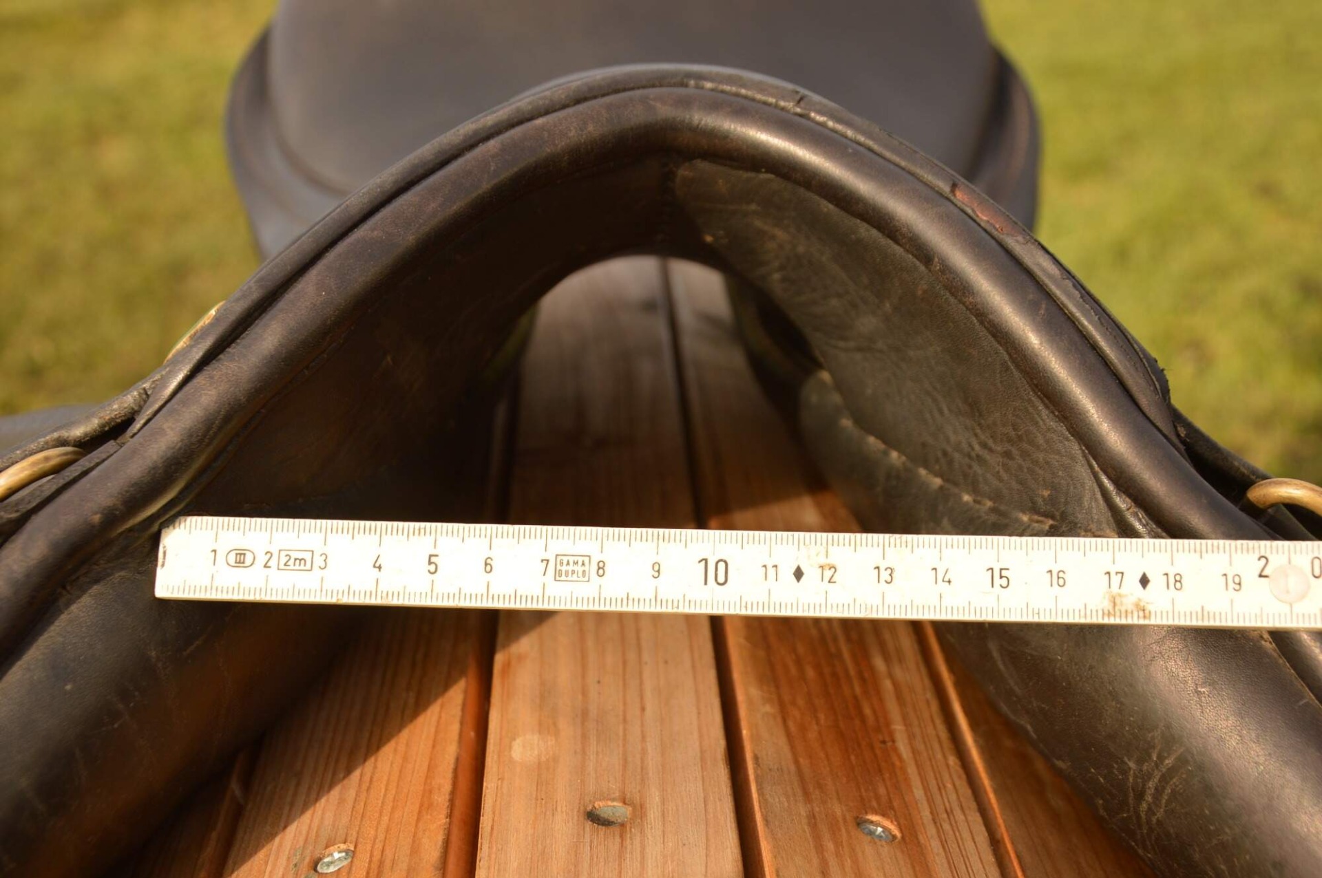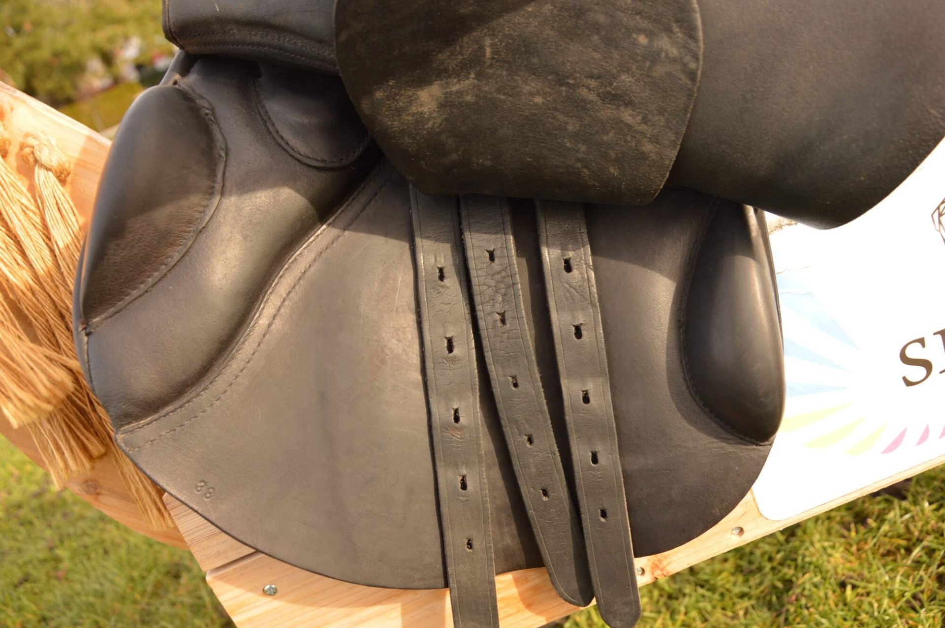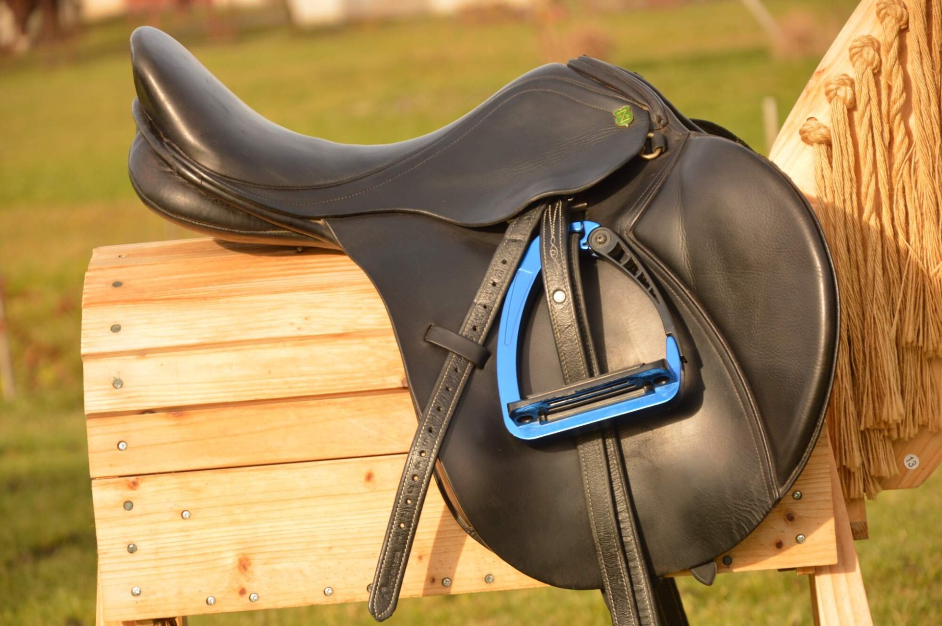 Skokově univerzální sedlo Greenfield Saddlery - Massimo. Posedlí 17,5", komora 4 (18 cm), ideální na hodně kulaté koně. Kožené kvalitní sedlo má střední kolenní opěrky, hlubší posedlí, je velmi měkké a pohodlné. Vlněné polštáře, dobře tlumí nárazy. Vhodné na vyjížďky, jízdárenskou práci i skoky. Sedlo je ve velmi dobrém stavu, plně funkční.